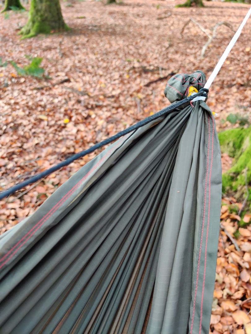 Was jetzt noch fehlt ist eine vernünftige Aufhängung. Ich habe mir bei Hammock Fairy ein Paar Baumgurte und ein Paar Dutch Beetle Buckles bestellt. Die passende Whoopie-Sling spleiße ich mir selbst.