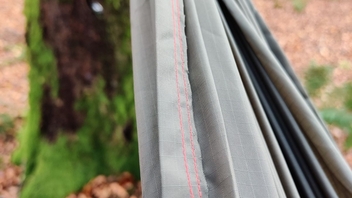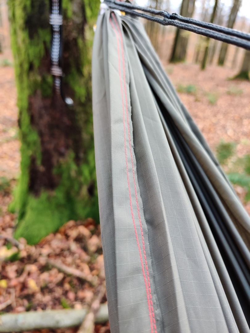 Weil der Shop von Hammock Fairy gerade Pause gemacht hatte und weil ich sowieso erstmal einen einfachen festen Stoff testen wollte, habe ich kurzerhand 4 Meter Ripstop-Nylon von Extremtextil bestellt. Außerdem irgendwo ein Mara 120 Nähgarn und Mirotex-Nadeln. (Es ist überhaupt nicht so leicht, ein passendes Nähgarn zu finden). Ich hatte zunächst Bedenken, ob das 120er vielleicht zu dünn ist, aber ich habe ein gutes Gefühl. Durch den Warbonnet-Whip entstehen ja keine größeren Zugkräfte auf den Nähten.