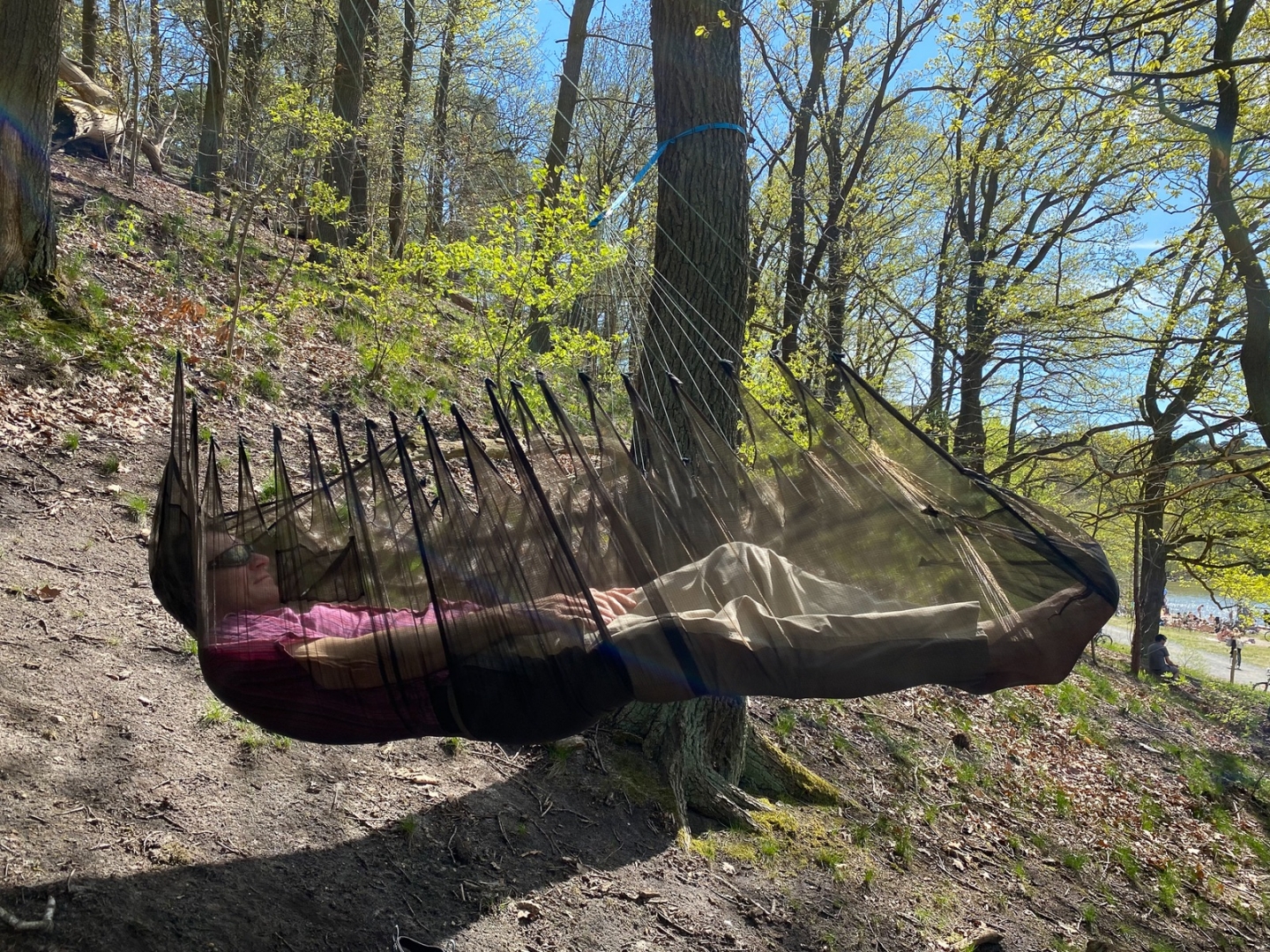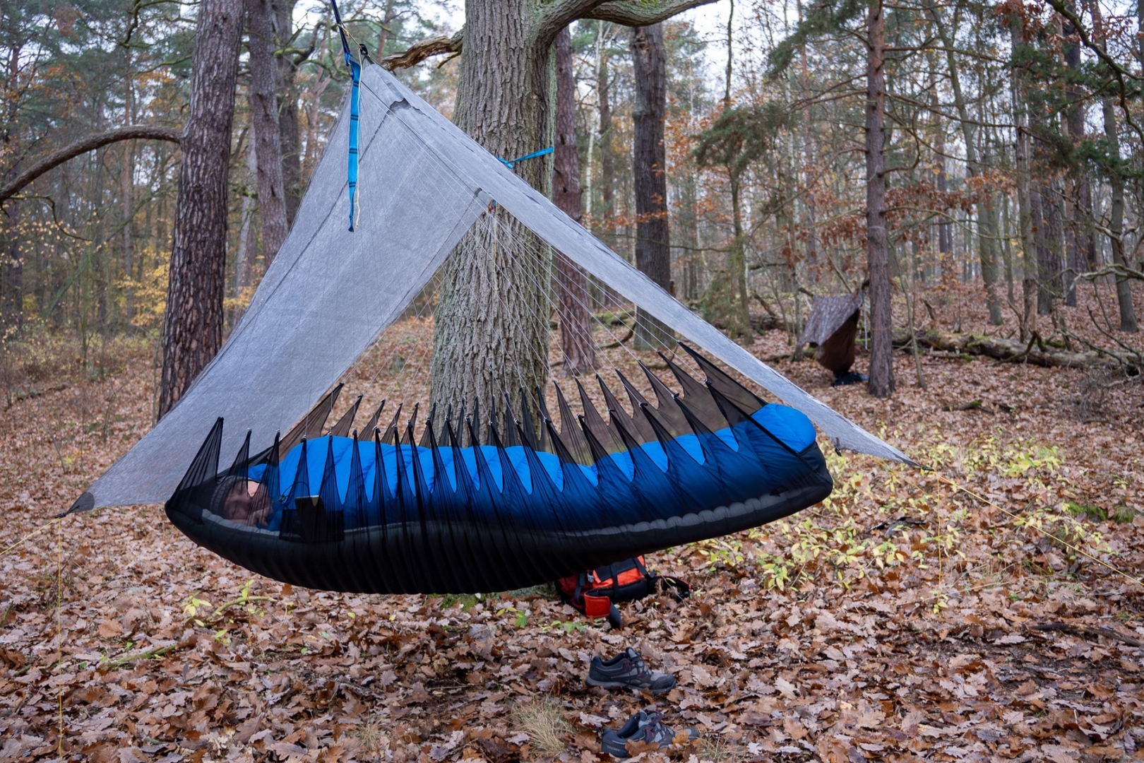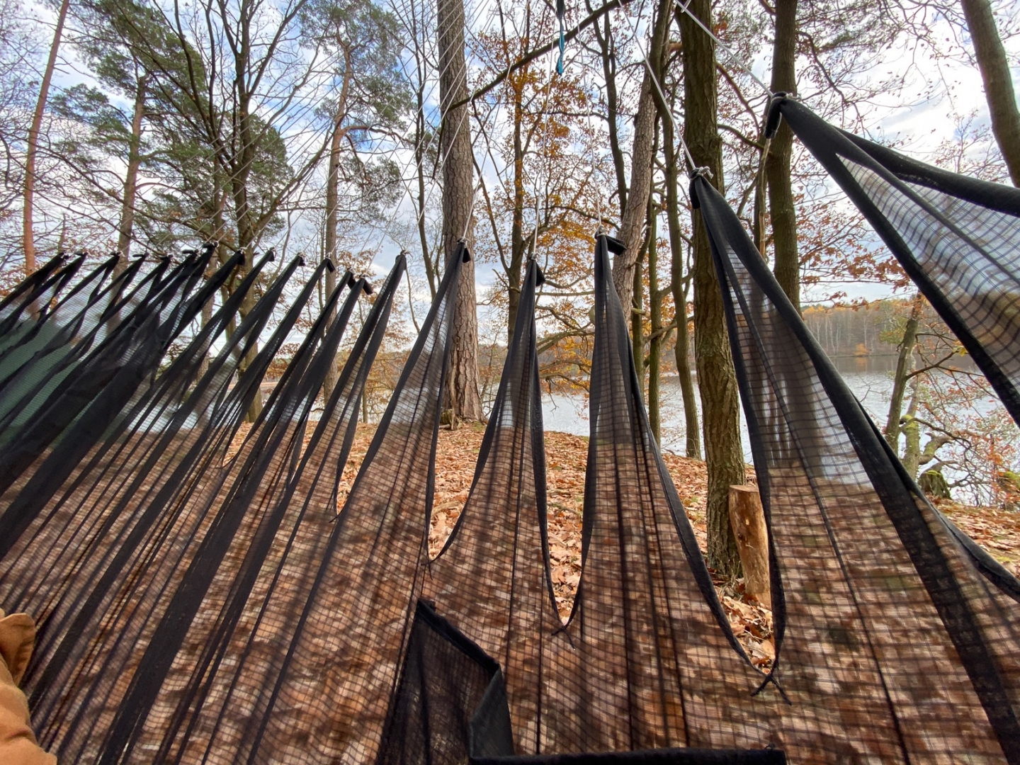 Auf dem letzten Wildnishang in Brandenburg war es dann soweit, dass ich einen Prototyp aus diesem Stoff probeliegen konnte. Die Transparenz des Materials ist trotz der doppelten Stärke immer noch sehr beachtlich.