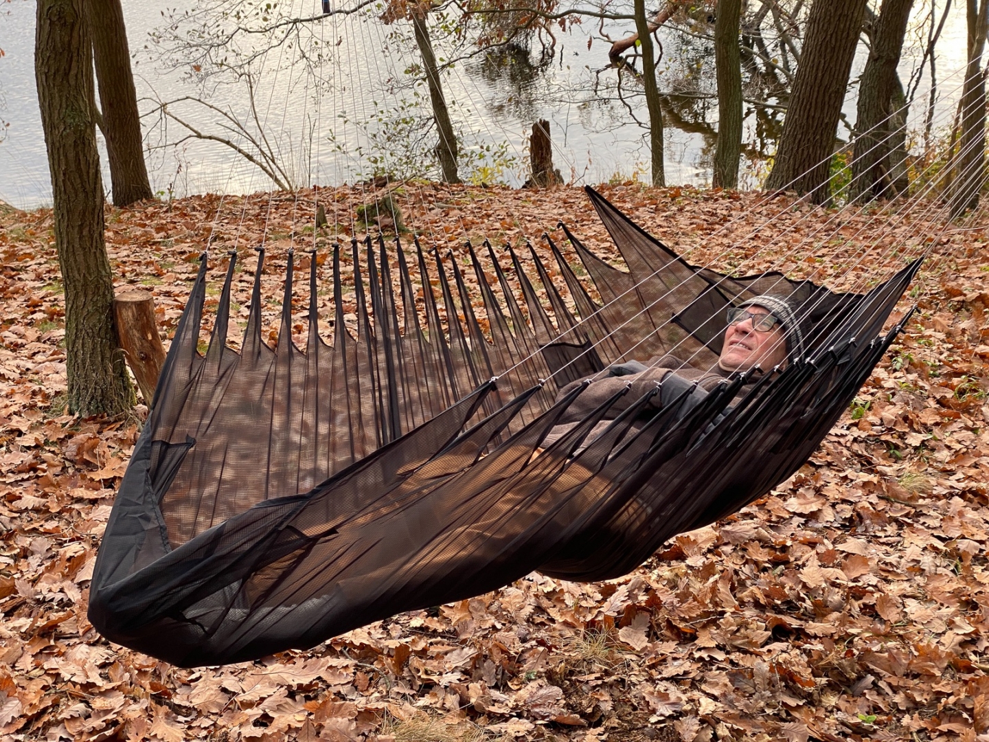 Der ultraleichte Cloud 71 Hängemattenstoff hat im Forum bereits für einige Diskussionen gesorgt. Ich konnte der Versuchung gleichfalls nicht widerstehen und habe mir Anfang des Jahres daraus eine Cross Hammock genäht, die seither auch einige der leichtgewichtigeren Foristen ( hangloose , bieber1) probegelegen haben. Besonders die Transparenz ist einfach phänomenal, während sich die Dehnung bei einer Querhängematte weit weniger negativ auswirkt als bei einer GE-Matte. Diese Matte nutze ich regelmäßig, ohne jedoch soviel Zutrauen gewonnen zu haben, dass daraus auch ein Angebot für den Shop werden könnte.