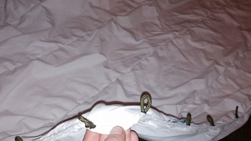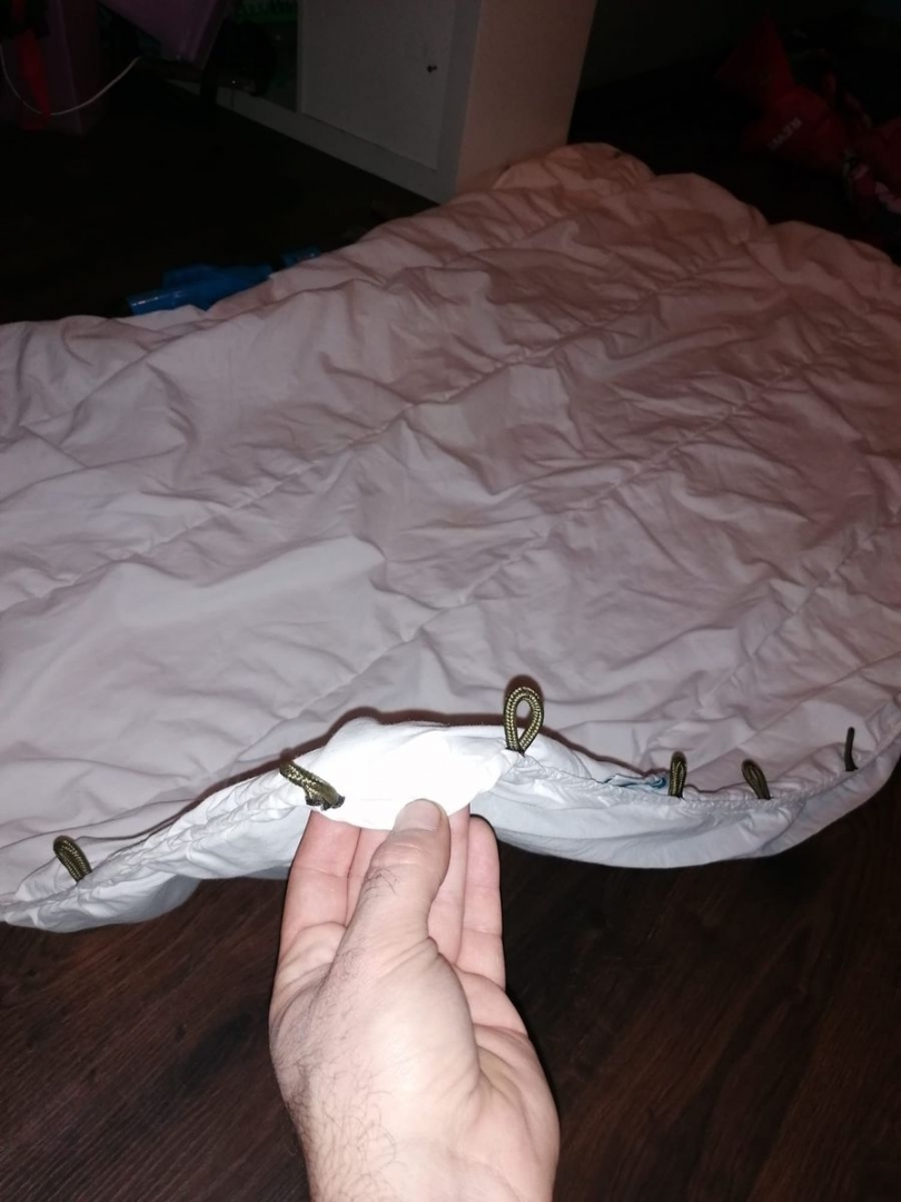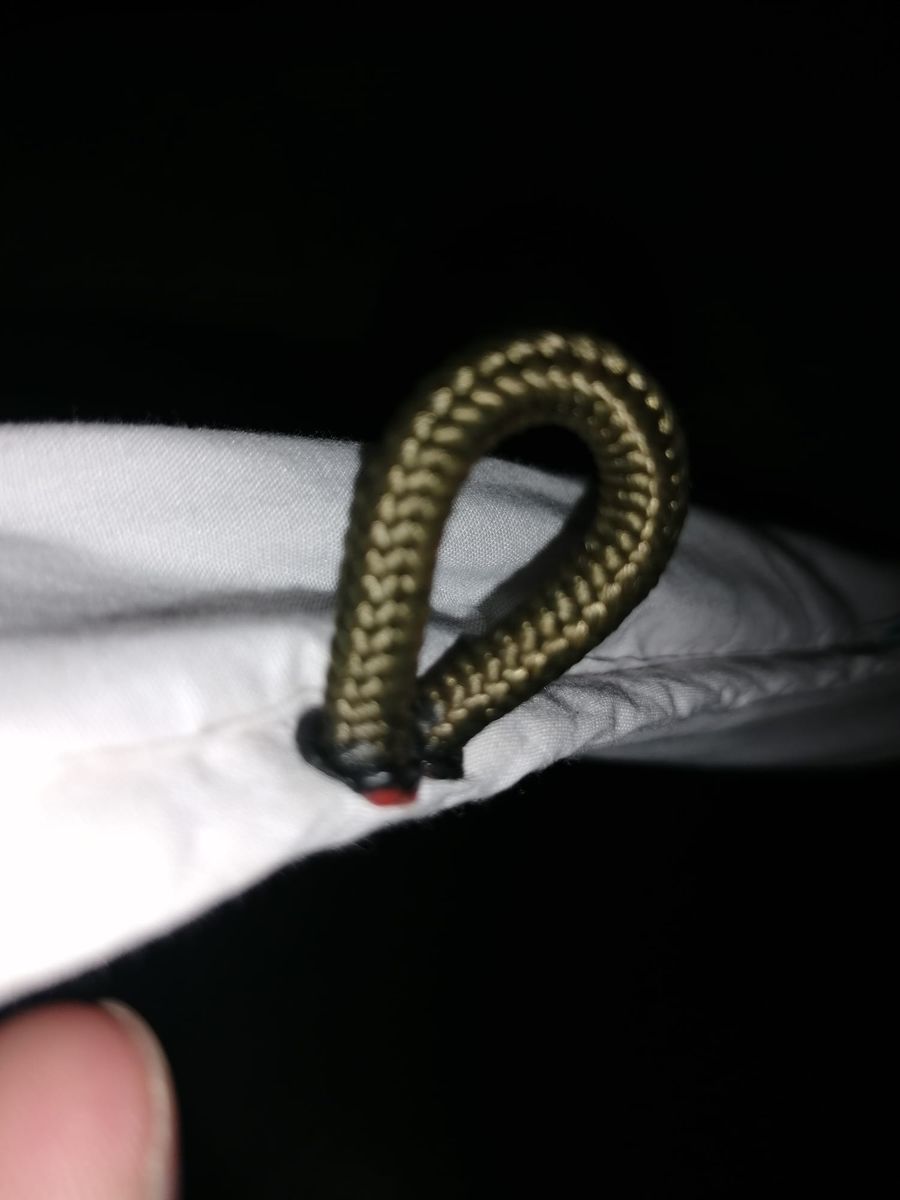 Ich habe das Paracord einfach in den Stoff eingeschmolzen, das ganze hält zimlich gut, viel besser als ich es mir erhofft hatte und es verhält sich an der hängematte, wenig überraschend, wie ein normaler underquilt.
