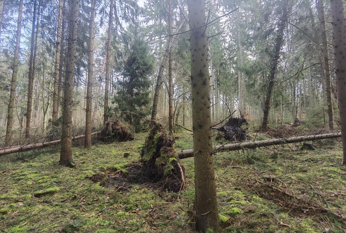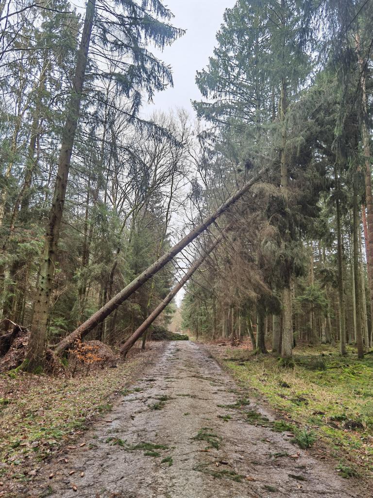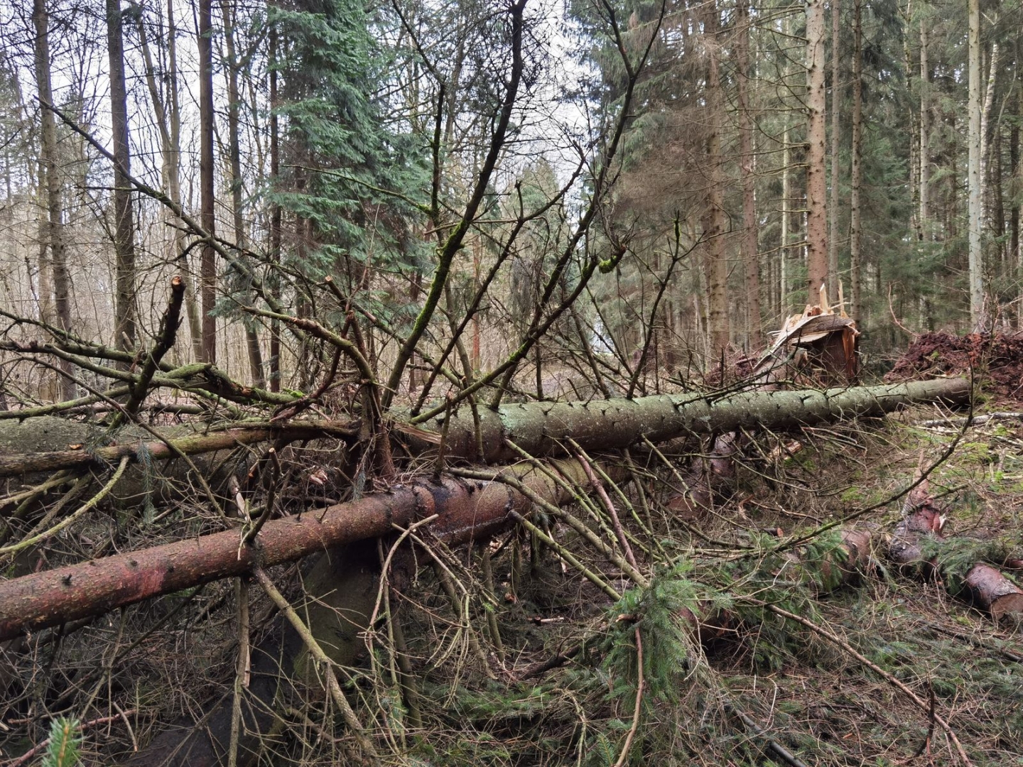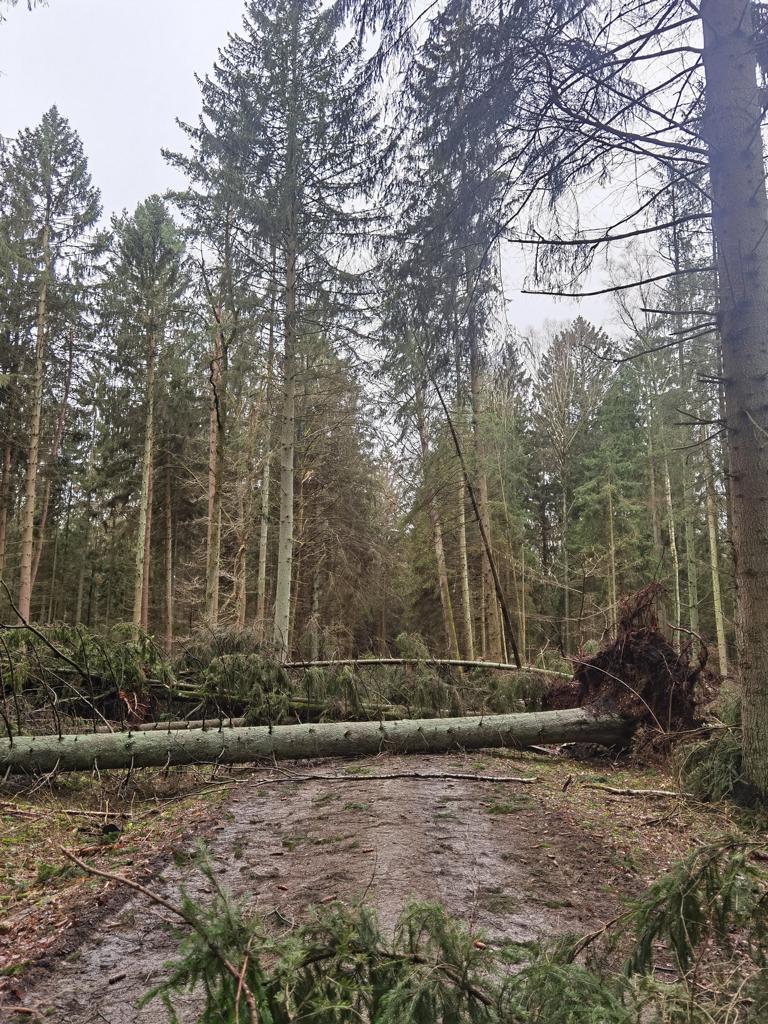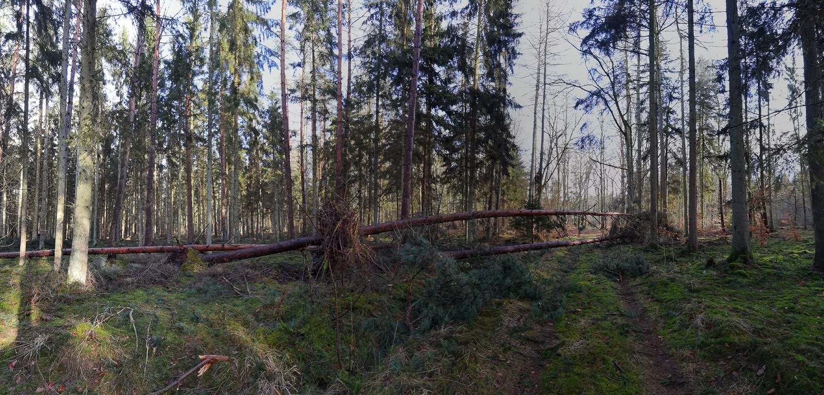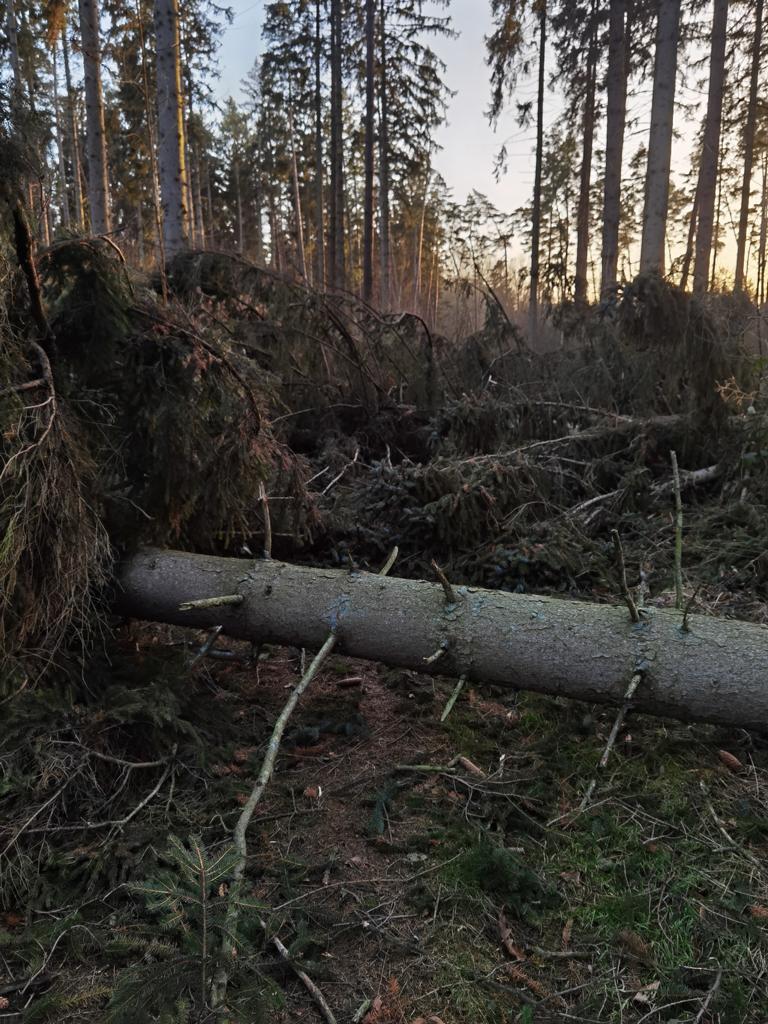Unsere Vermutung war das es kurze scharfe Böen gegeben haben muss bei denen die Bäume keine Zeit hatten sich unter dem Druck zu biegen. Das ganze war auch nicht auf Schneisen oder Wege oder so begrenzt sondern einfach großflächig ohne erkennbare Abgrenzungen.