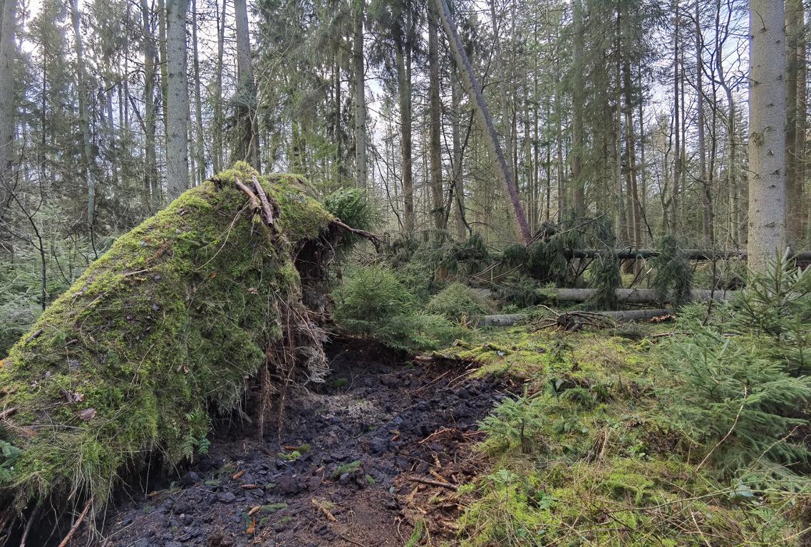 Bei unterschiedlich hohen Bäumen fallen auch mitten im Wald immer wieder alte Fichten um, die eigentlich völlig gesund aussehen. Der Schwachpunkt scheint nicht der Stamm, sondern die Flachwurzel zu sein.