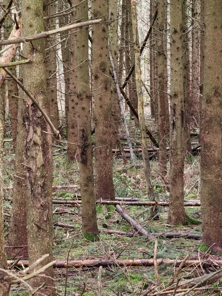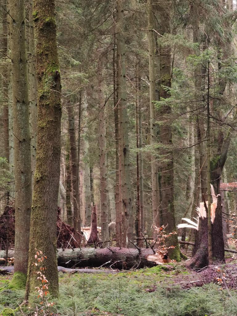 Wenn man ein Stück in den Wald hineingeht, gibt es wenig Windbruch jedenfalls dann, wenn die Bäume ungefähr alle gleich hoch sind und so um die 30 Jahr alt sind. Bei mittelalten Fichten fallen offensichtlich auch nicht mehr so viele Äste runter,