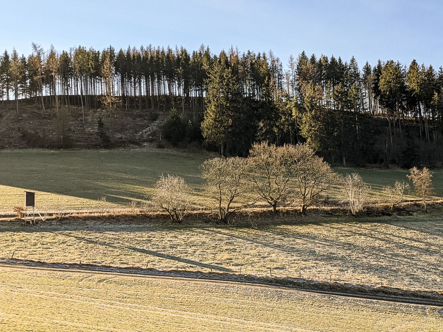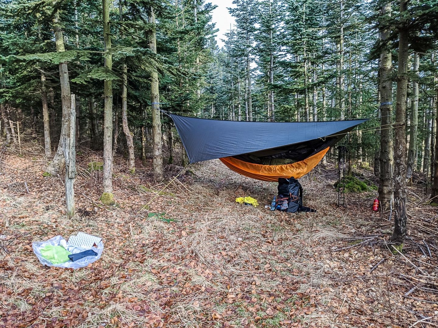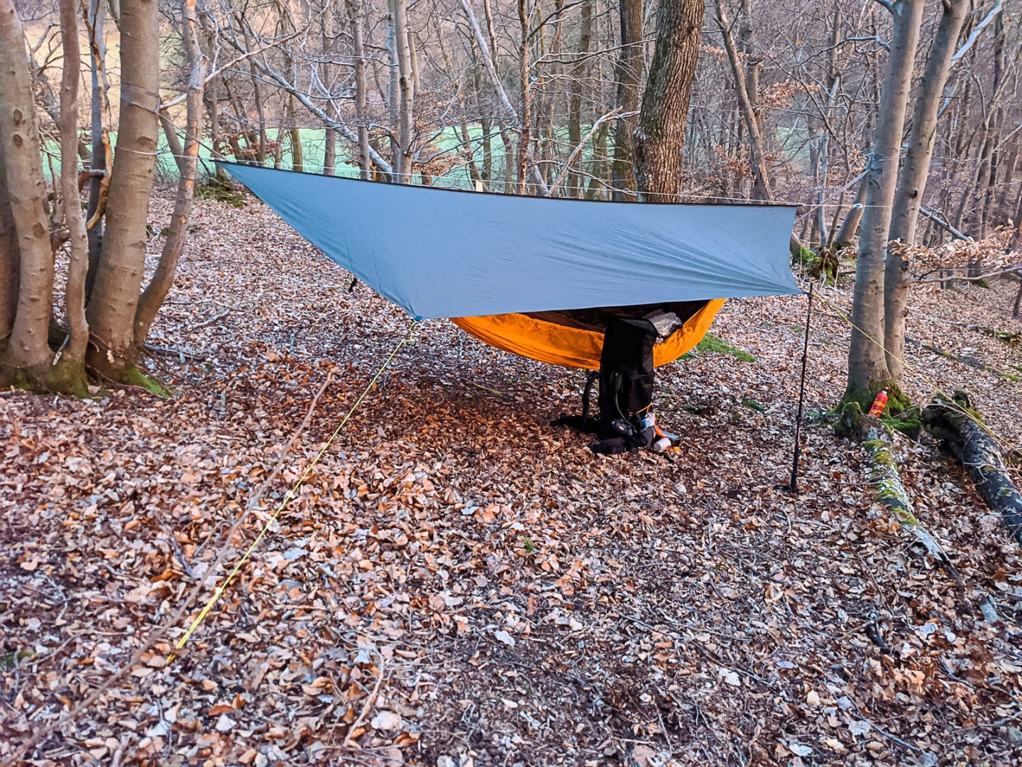 Die zweite Nacht im Wald. Man muss sich seine Bäume hier schon sorgfältig auswählen, um die Nacht zu überlegen. Dann lieber über einem Weg hängen, der an diesem Abend (hoffentlich) nicht mehr genutzt wird. Und auch wenn es unzählige Hochsitze gibt, darf - so mein Halbwissen - wohl zurzeit nur Jagd auf Wildscheine gemacht werden.