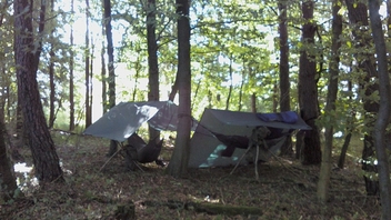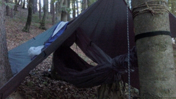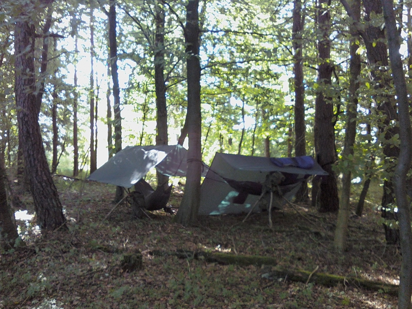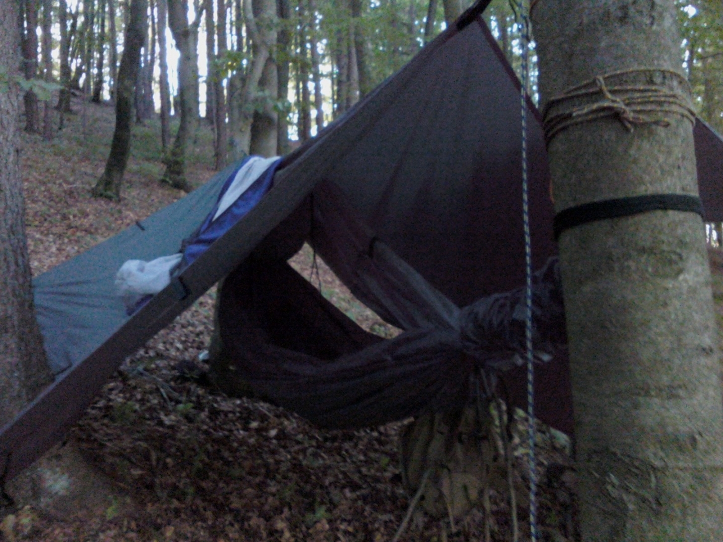 Seit etwa 10 Jahren besitze ich eine eher wenig genutzte DD Hammock Travel. Das ist die Version, die man dank des wasserfesten Materials auch auf dem Boden verwenden kann. Wer also auch nur mäßig viel schwitzt, wacht morgens gerne nass und kalt auf. Ich wollte deswegen ursprünglich auf das feuchtigkeitsdurchlässige Modell Frontline umsteigen, habe mich aber mittlerweile für eine Khubi Nirvana von Kornél entschieden, die ich noch bestellen werde. Mein Tarp — welches ich wohl vorerst mal nicht ersetzen werde — ist ein ganz reguläres 3x3 Meter DD Tarp, das ich damals zusammen mit der Hängematte gekauft habe. Dazu noch zwei alte und schlechte Bilder.