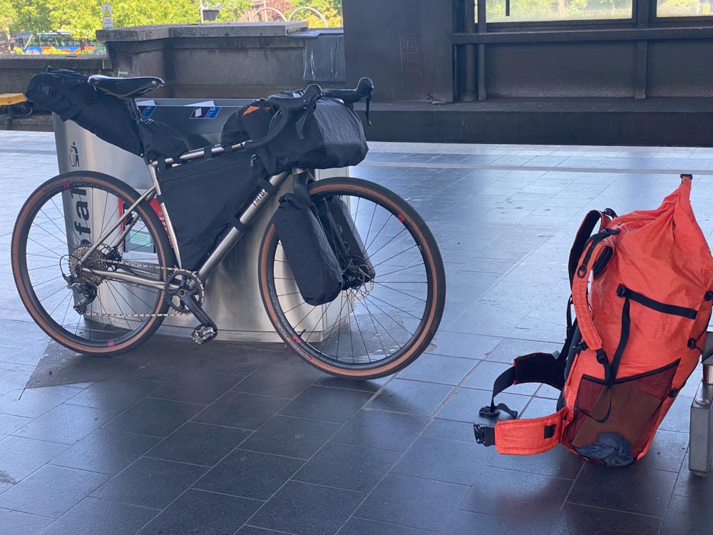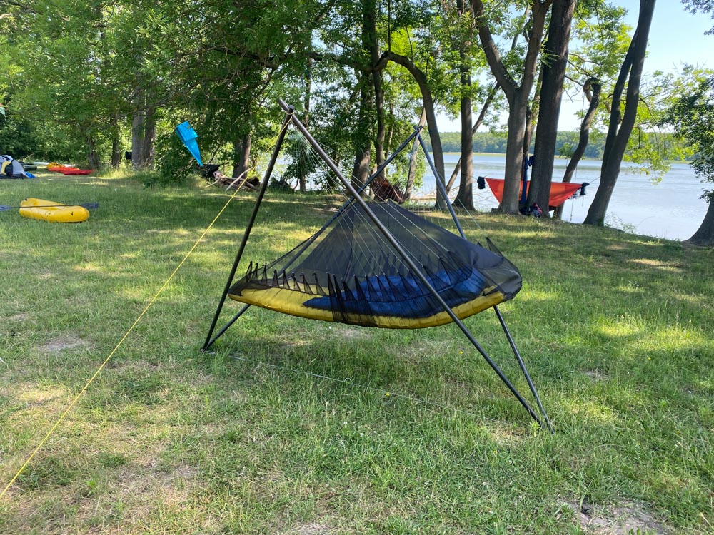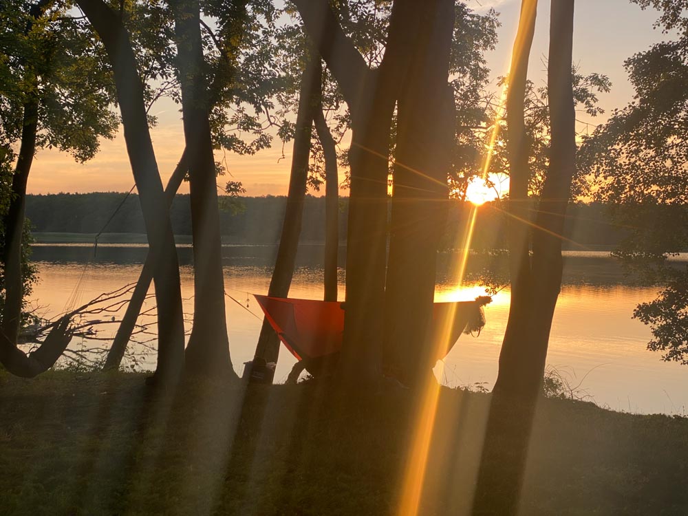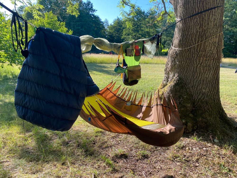 Auf zum Hängemattentreffen mit dem 9 € Ticket! Was hier alles drin ist: 3 Hängematten, 2 Boote mit 2 Paddeln, ein Carbon Tree Hängemattenständer, Schlafsack, Tarp, Isomatte, Gear-Zelt und Verpflegung für 4 Tage.