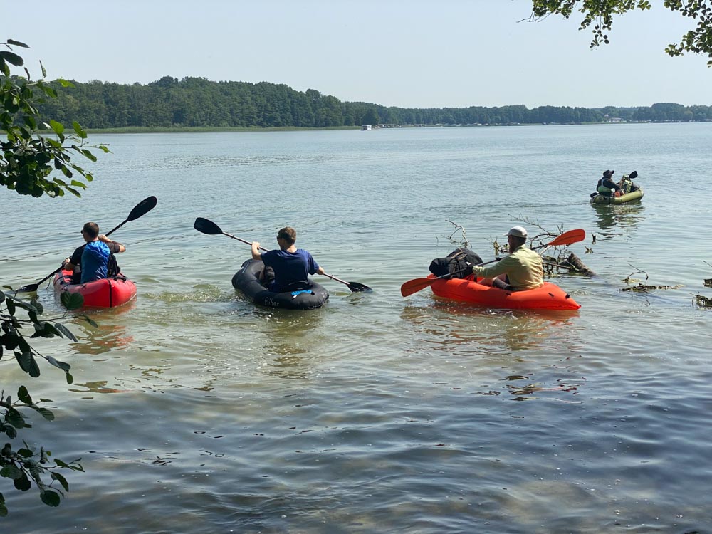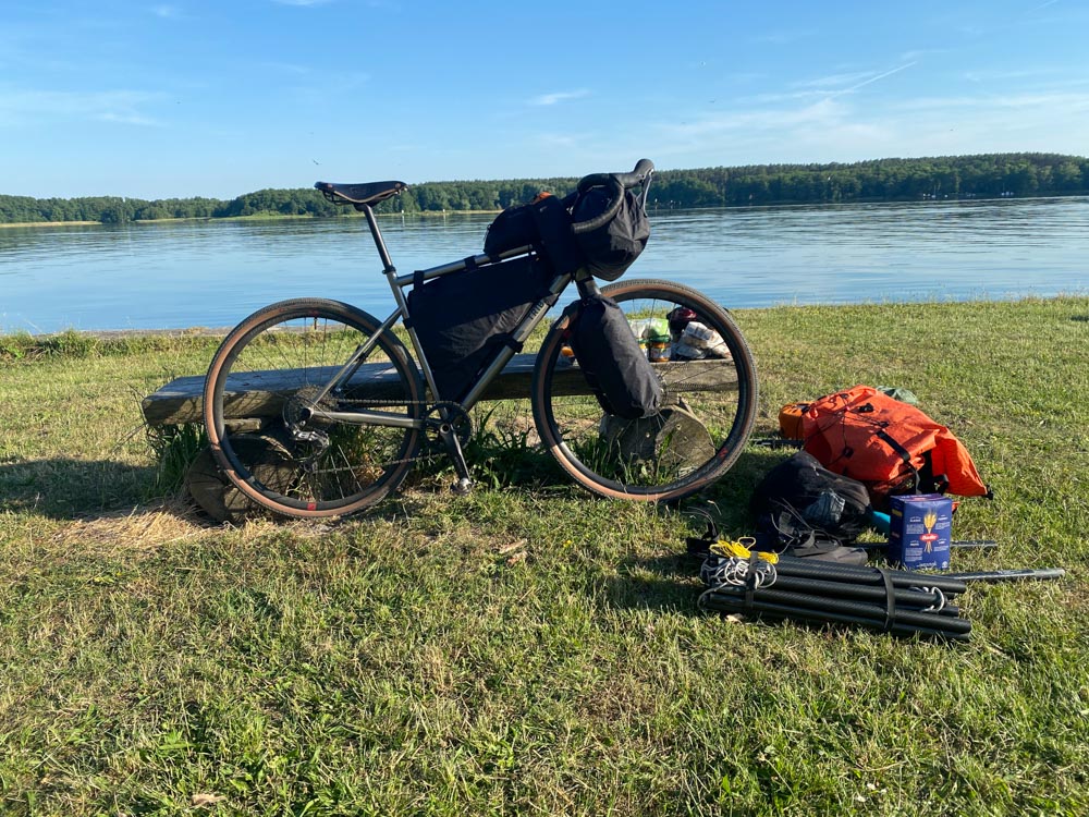 Ankunft am Gudelacksee. Das Boot ist schon aufgebaut, jetzt nur noch alles drin verstauen, Rad unterstellen und übersetzen.