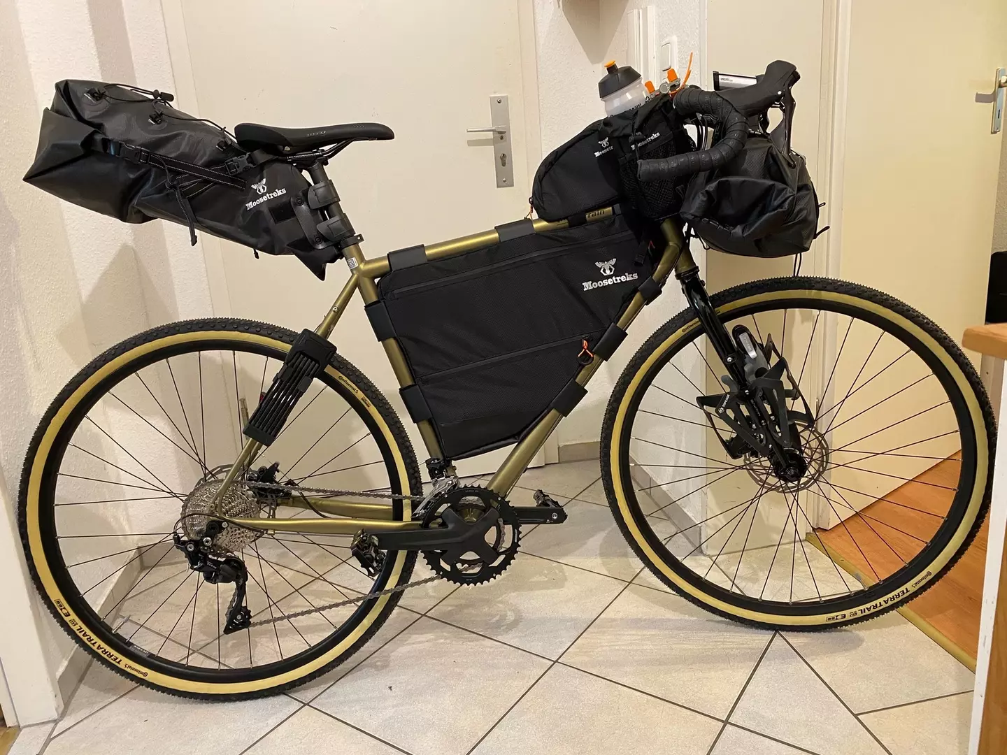 Ja. Ich habe die Lenkerrolle mit Hängematte und Zubehör, eine 7,5l Satteltasche mit Hygiene, EH-Zeug, Elektronik und Platz für's Tarp oben drauf, eine 2,5l Tanktasche mit Futter und 3x 600ml Wasser im Rahmendreieck. Die kleine Fahrradwerkstatt ist in einer 850ml Fidlock-Tasche unter dem Rahmendreieck. Dazu noch einen 15l UL-Rucksack (Sea to Summit UltraSil) als Reserve, wenn ich mir mal einen größeren Einkauf gönne. Sonst gibt's halt nur Riegel und Käsebrot aus dem Supermarkt. Strom für die Elektronik kommt über einen Dynamo (PedalCell) und eine kleine Powerbank. Ein kurzes Abus Bordo passt noch mit auf die Lenkerrolle und etwas Kleinzeug passt in die Trikottaschen.