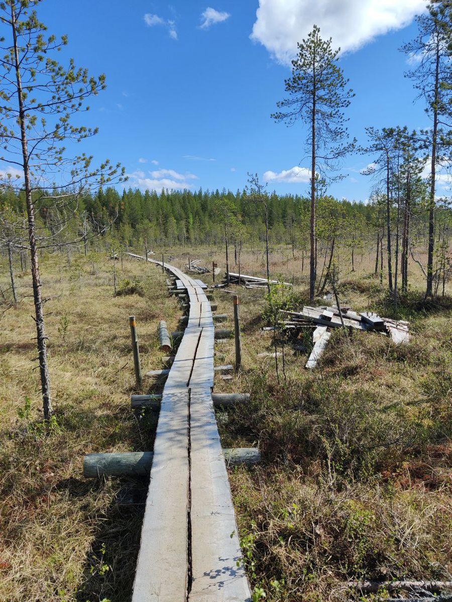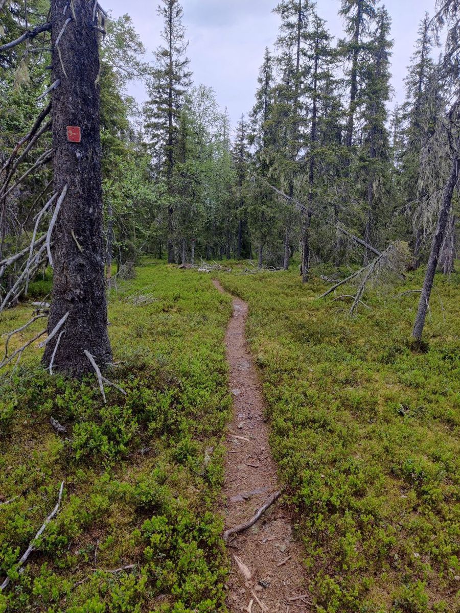Der Trail ist perfekt ausgeschildert, Markierungen alle 10 Meter, ein Schild jeder km und auch durch die Spuren auf dem Boden sehr einfach zu erkennen. Alles sumpfige ist mit Holzwegen überbrückt. Teilweise war der Weg geschottert, das habe ich so auch noch nicht gesehen, geschotterter Singletrail mitten im Wald. War sehr angenehm zu gehen. Der Weg war schon fast zu einfach, zumindest nicht so wie ich es aus Skandinavien gewohnt bin. Wer eine entspannte Wanderung über Wege mit Stadtparkqualität sucht und dazu die Finnische Wildnis um sich haben will, ist hier genau richtig. Der Weg führt zum großen Teil an einem Fluss entlang, was immer wieder zu tollen Aussichten führt. Ich kann verstehen warum der Weg so beliebt ist. Hier einige Bilder aus diesem Teil: