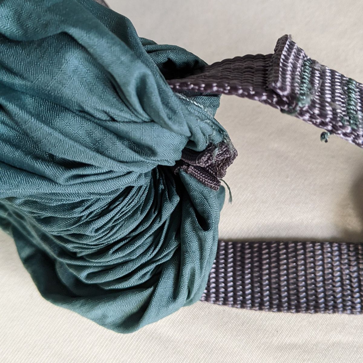 • Wenn ich es richtig sehe, hat die Hängematte ein integriertes Moskitonetz? In dem Fall würde ich die Gurtschlaufen nicht ersetzen, bzw. wenn, dann die Schlaufe in den Tunnelzug spleißen. Du könntest auch normale Dog Bones verwenden - die bleiben dann allerdings offen und können leicht herausgezogen werden. Wenn du die Schlaufen durch den Tunnelzug ziehst und mit einem Ankerstich fixierst, verlierst du die Flexibilität des Stoffes. Meiner Erfahrung nach wirkt sich das negativ auf das Liegegefühl aus - vermutlich, weil du die Hängematte effektiv kürzt.