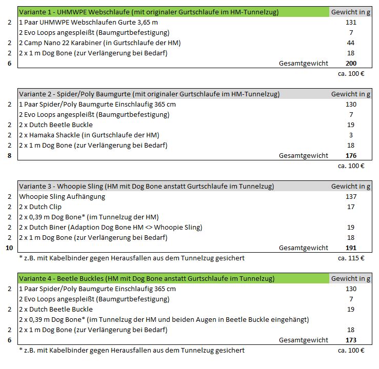 Es ist zwar so, dass bei größeren Baumabständen und Bäumen mit großem Durchmesser (z.b. ca. 60 cm) die Slings etwas mehr Restlänge zum Aufhängen hätten (200 cm), aber die Gurte (160 cm Restlänge) ließen sich ja im Fall der Fälle mit zwei Dog Bones verlängern. Das ist zumindest meine jetzige Einsteiger-Vision. Becket Hitch und weitere Kunstgriffe muss ich mir für später aufheben. Erstmal soll es sicher und möglichst intuitiv sein.