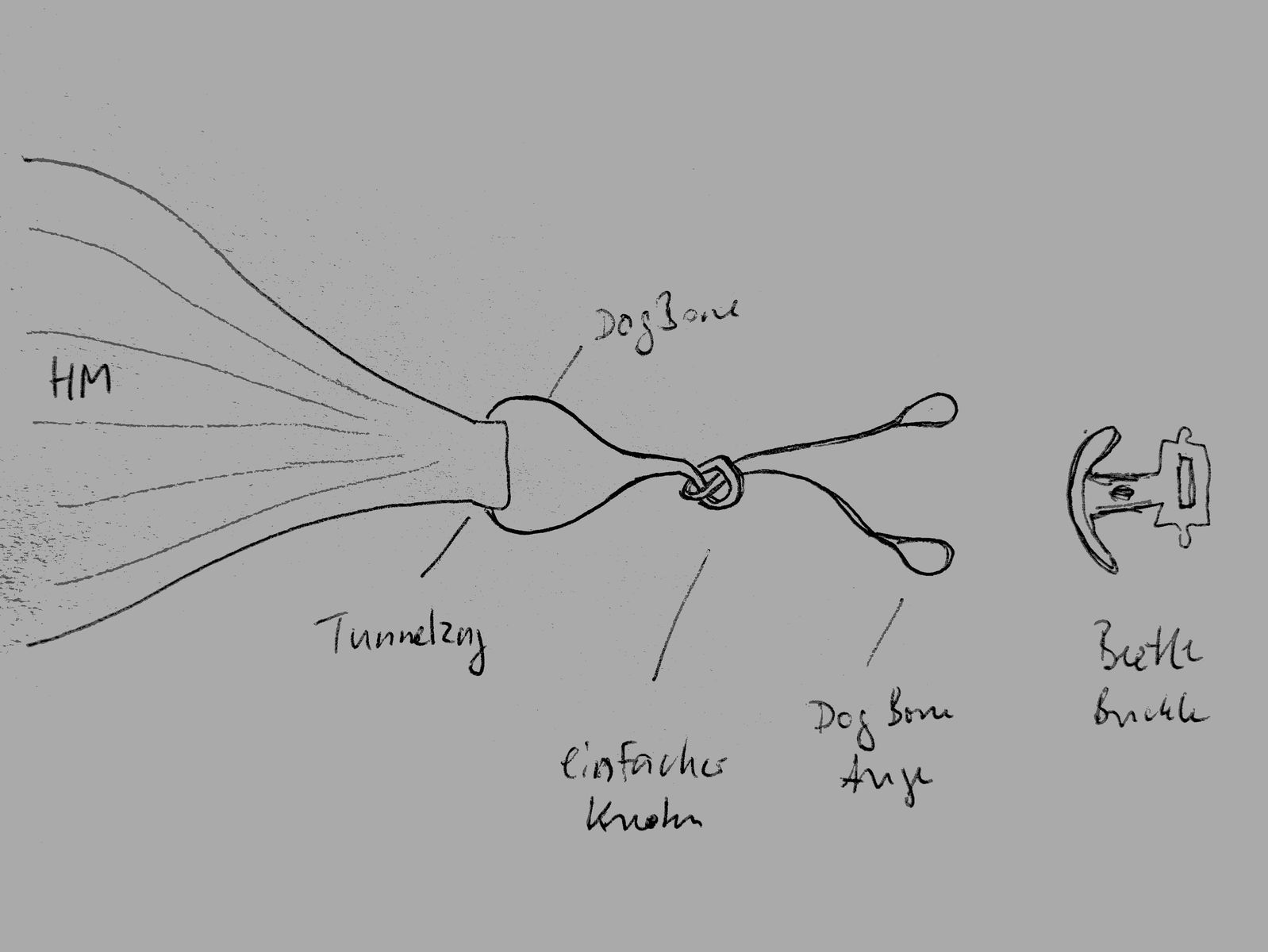 Wie weiter oben beschrieben möchte ich ggf. einen DogBone in einen HM-Tunnelzug einziehen um die beiden herausschauenden Augen dann in einen Dutch Beetle Buckle (an einem Baumgurt) einzuhängen. Um diesen DogBone gegen das Herausfallen zu sichern ließe sich ein Kabelbinder o.ä. verwenden. Gestern kam mir dann noch die Idee, dass sich auch der DogBone einfach selbst mit einem Knoten versehen ließe. Siehe Handskizze: