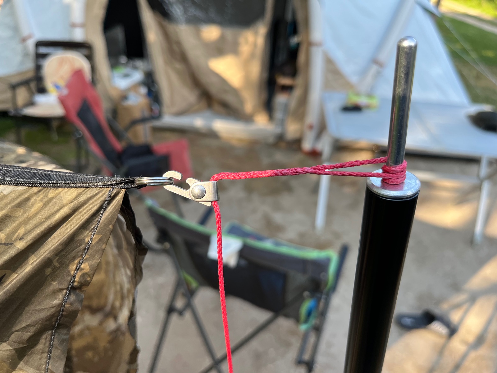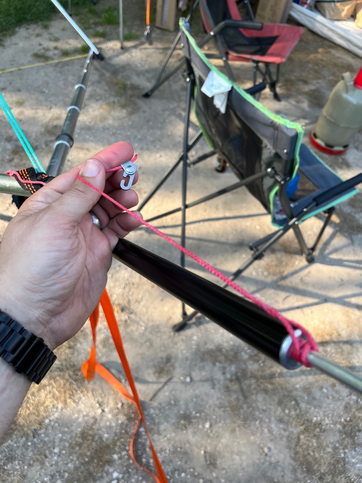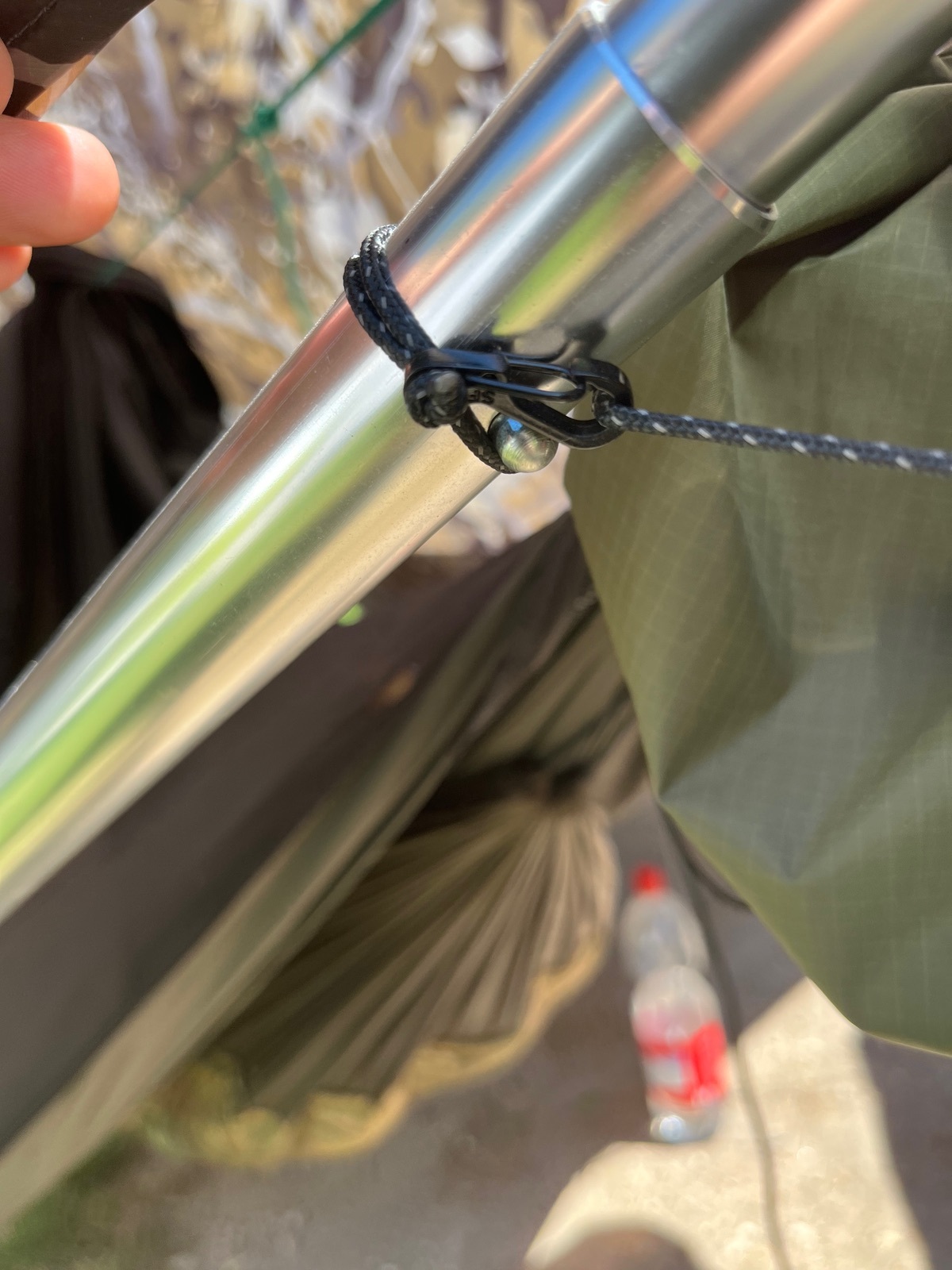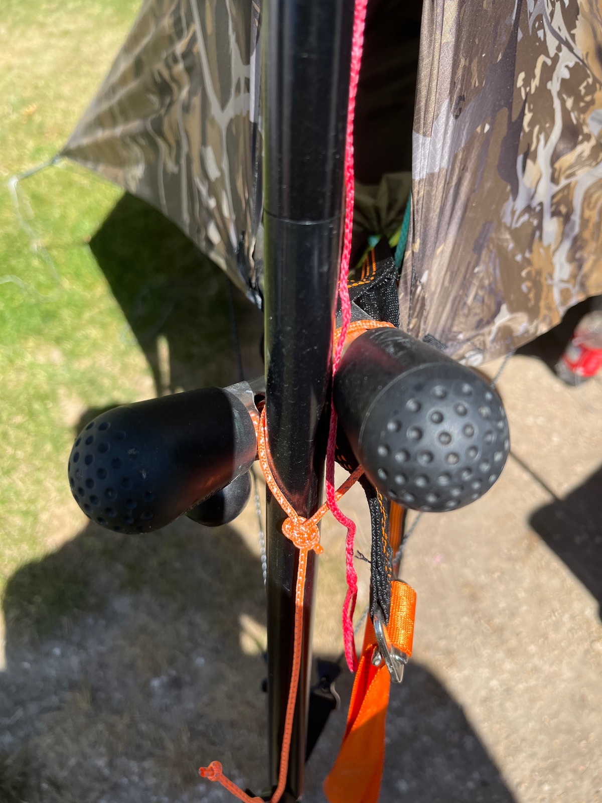 Dann lege ich die Leinen mit den Minikarabinern zweimal um die Stangen, damit diese nicht über die Klemmnuppsies des Tensa rutschen.
