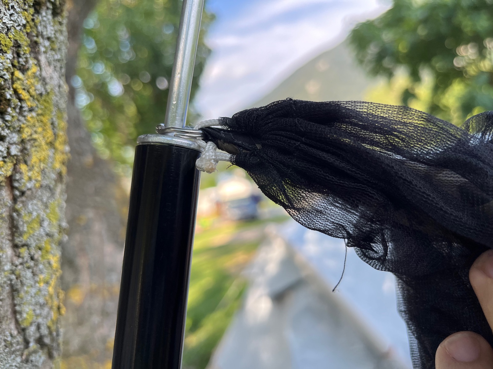 Zunächst habe ich die Orange Schlaufe so vergrößert, dass die Stange mit durch passt und so ein weiterer Punkt zur Stabilisierung dazu kommt.