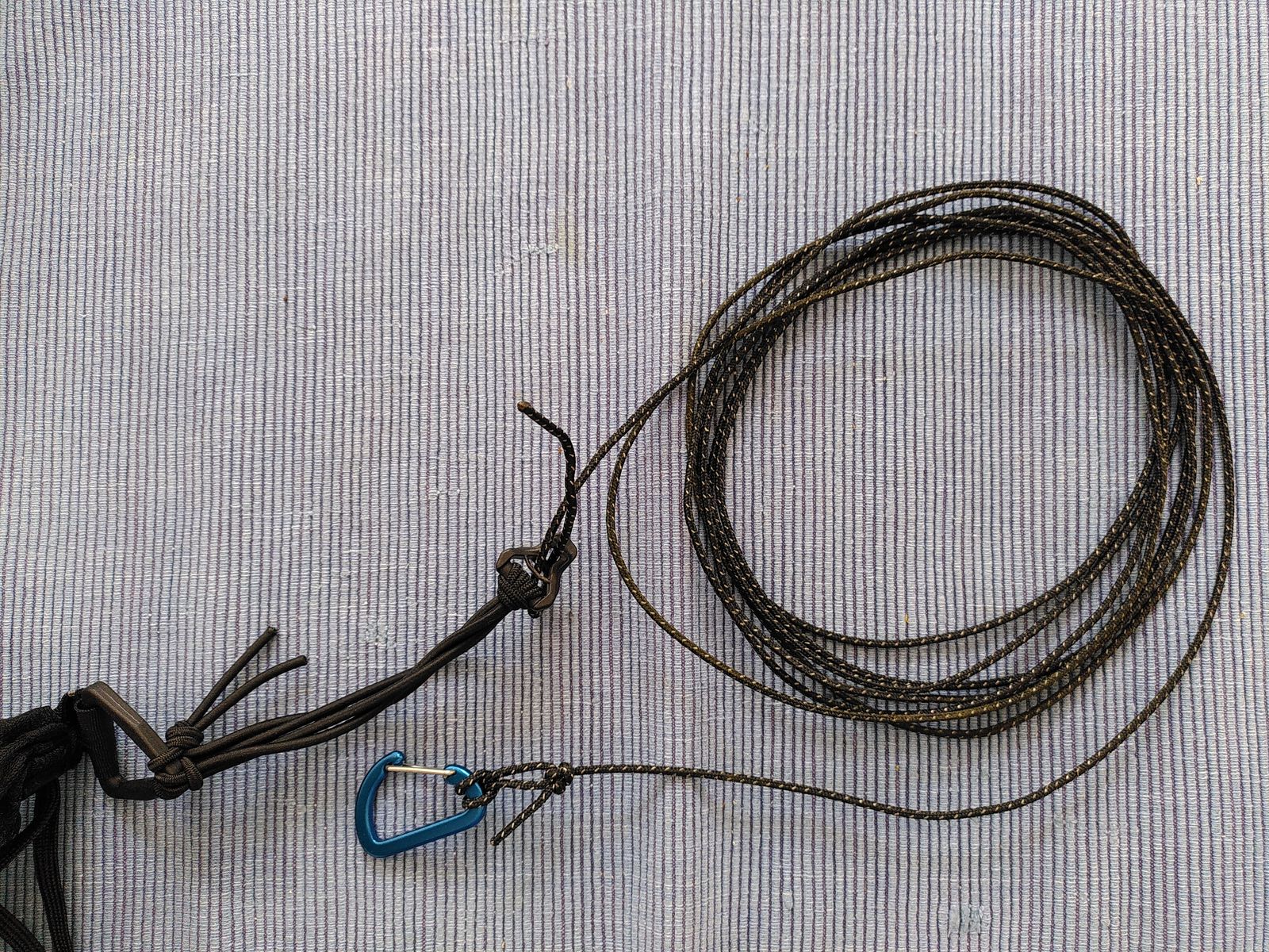 • Also ich hänge mein Tarp je nach Gelegenheit verschieden auf. Oft mit einem Prusik an den Baumgurten der Hängematte. Beim letzten Pfadilager standen die Bäume aber zu nahe, dann habe ich mit einer zweigeteilten Leine gearbeitet, die eine Seite mit einem LoopAlien, die andere mit einem Tactical Toggle abgespannt. Und wenn die Bäume weiter auseinanderstehen, dann gerne auch mit einer durchgehenden Firstschnur.