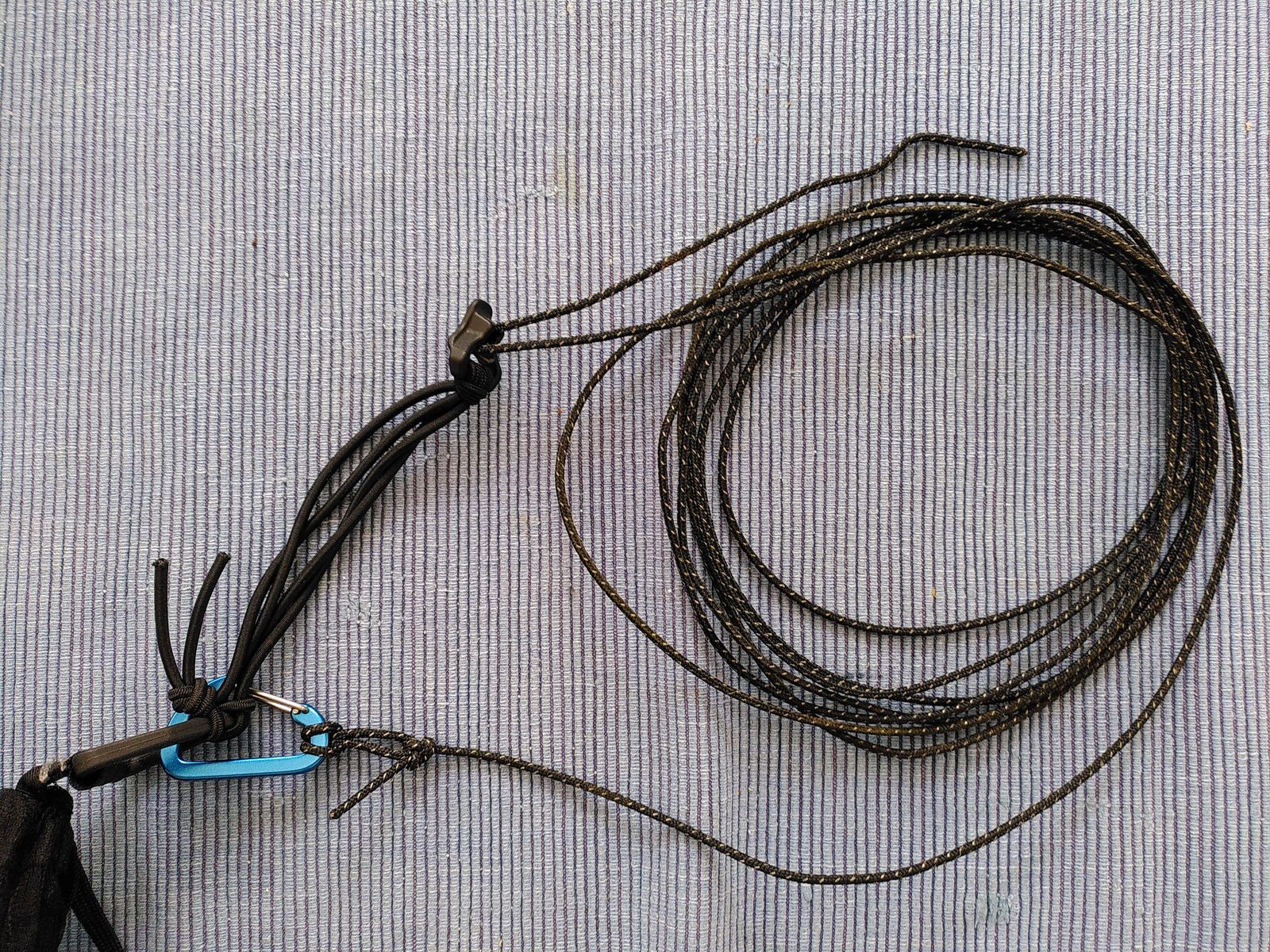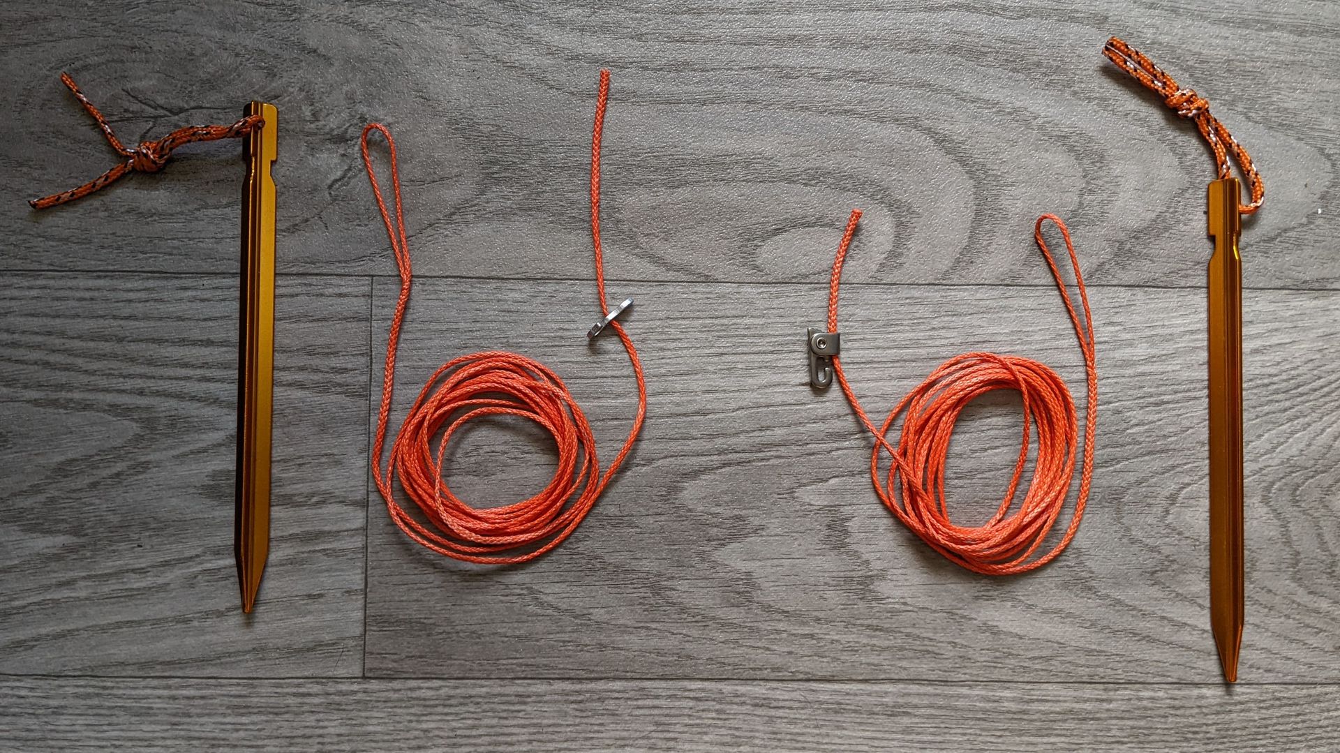 Alle vier Abspannleinen haben auf der einen Seite eine eingespleisste Schlaufe und auf der anderen Seite sind sie einfach nur verspleisst. Dennoch ist es recht einfach möglich die Nama Claws und Hookworms vom Seil abzuziehen, was natürlich beduetet, dass sie leicht verloren gehen könnten.