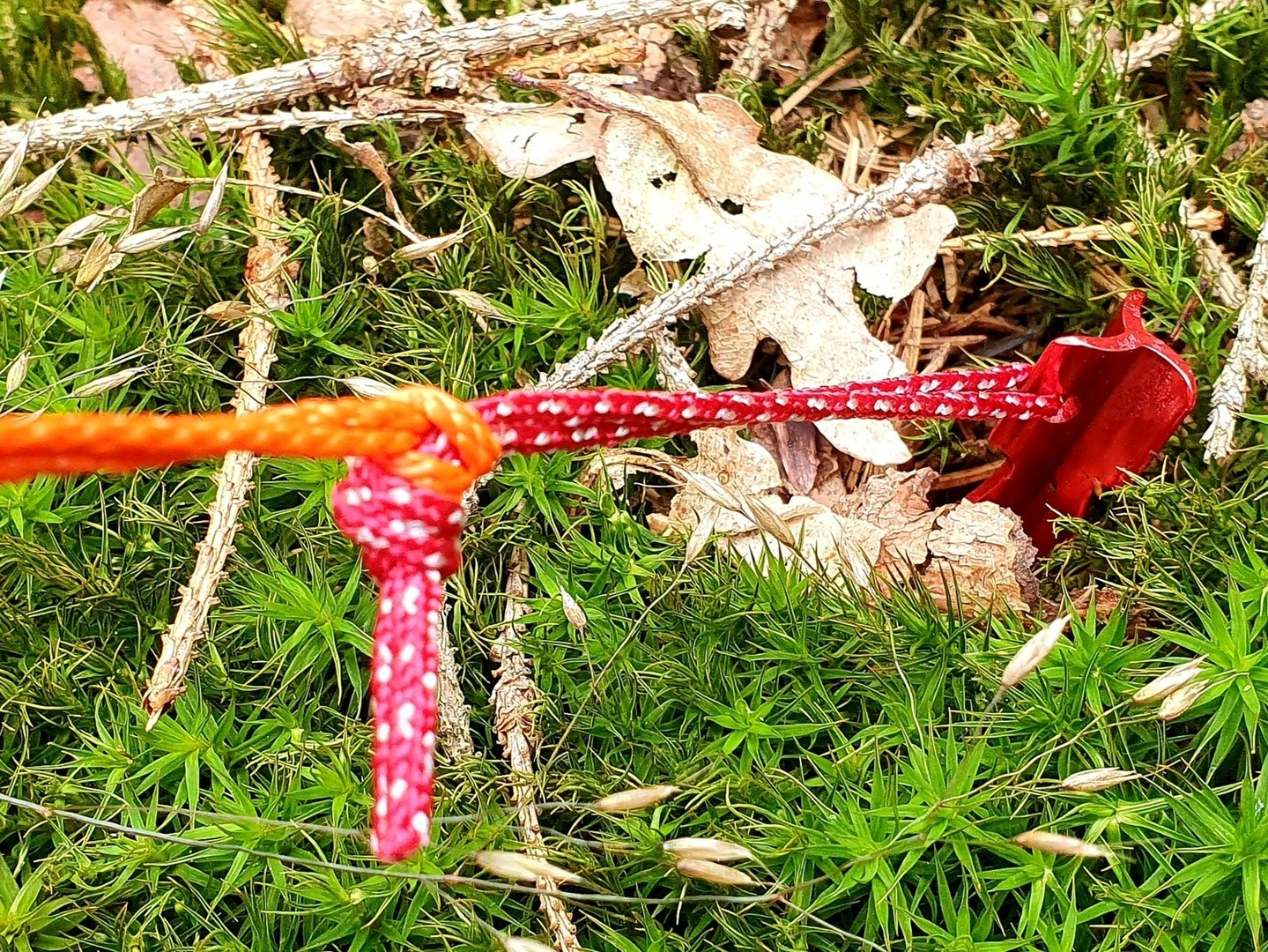 Welche Seite der Abspannleine wird (am sinnvollsten/besten) am Hering festgeknotet? a) Die mit der Schlaufe oder b) das offene Ende?
