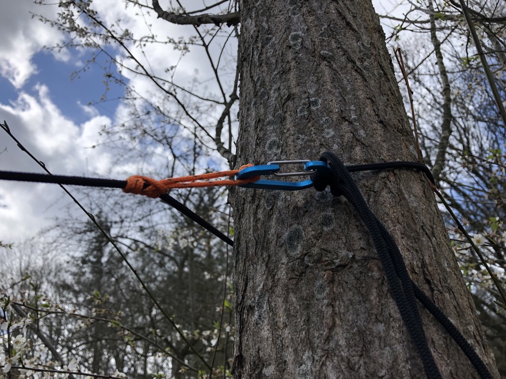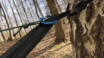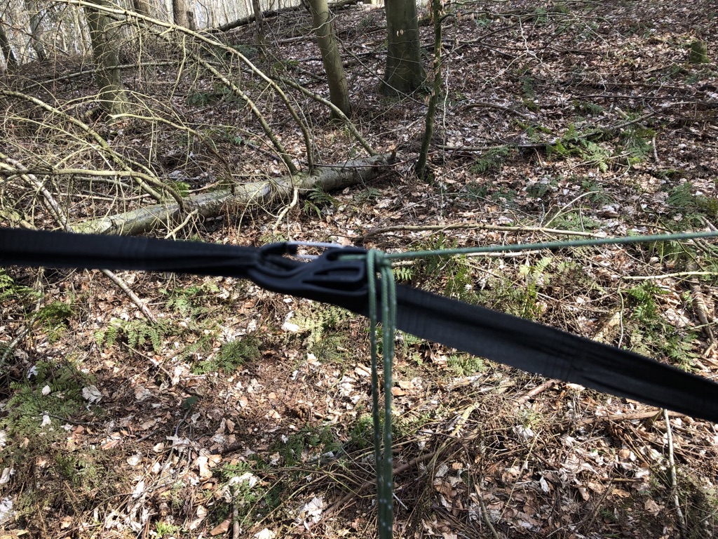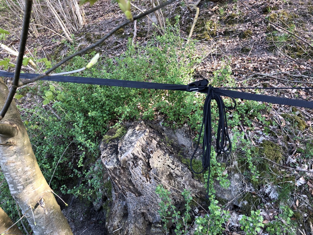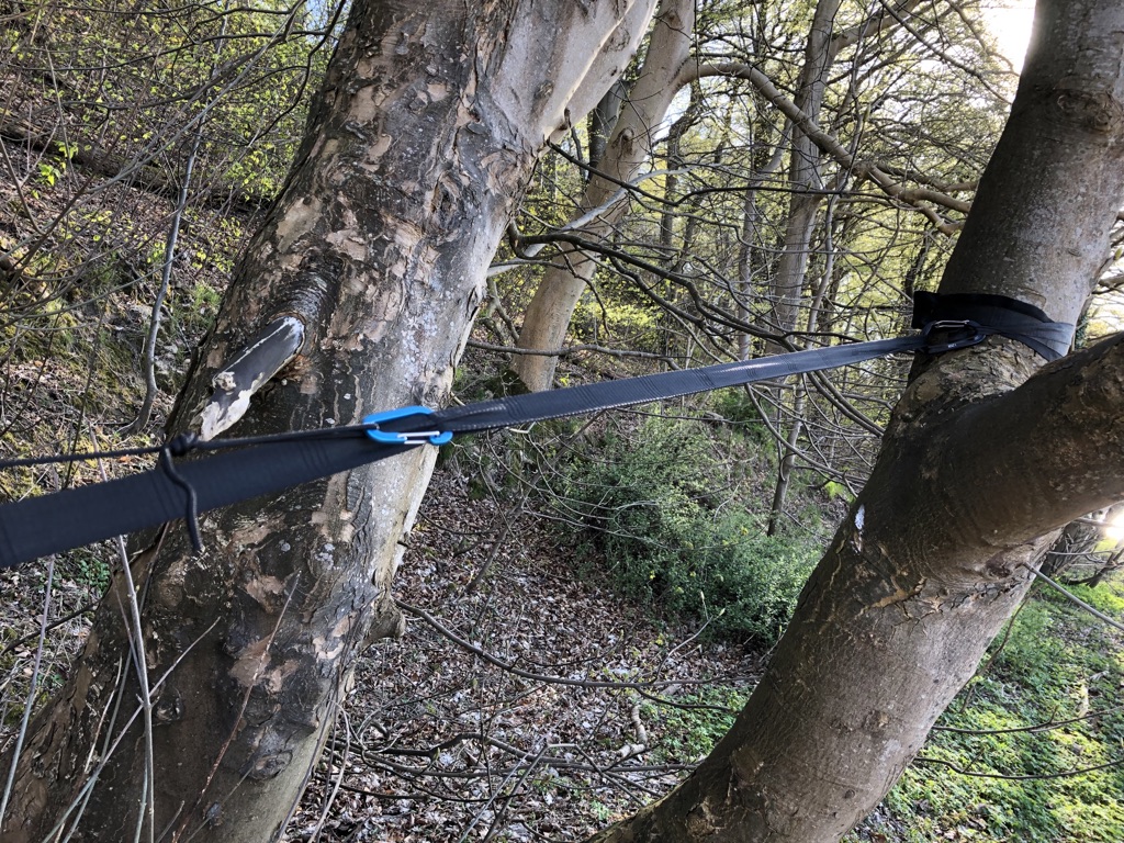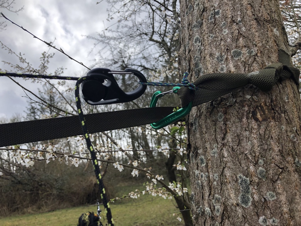 • Da ich auch festgestellt habe, dass so eine Tarpschnur aufgrund der starken Spannung für den Baum sicher nicht besonders gut ist, hänge ich seitdem mein Tarp in Daisychains, also Baumgurte. Manchmal befestige ich es auch an meiner HM Aufhängung.