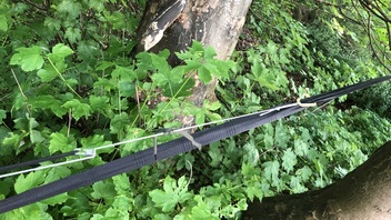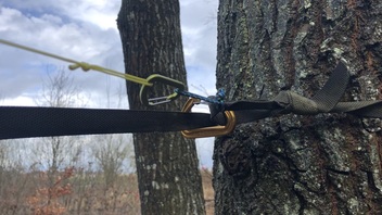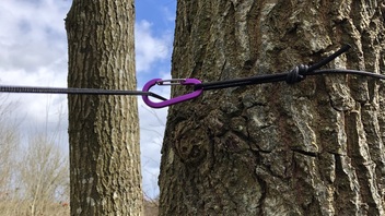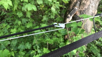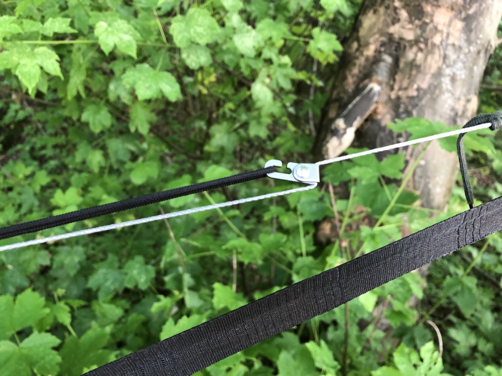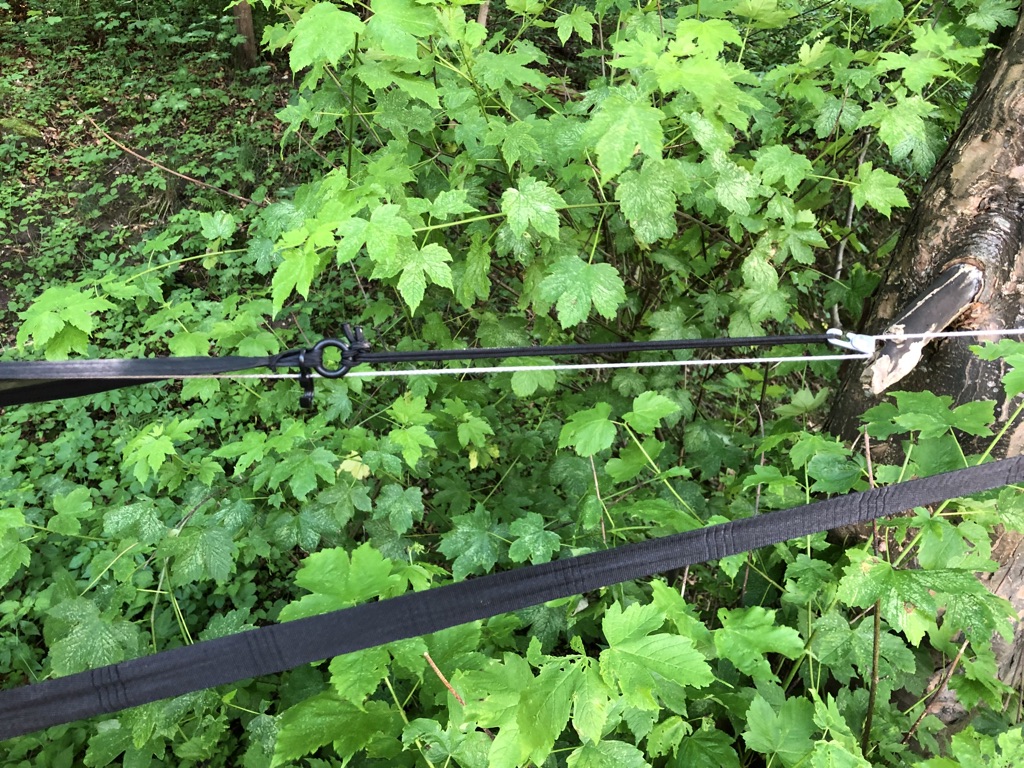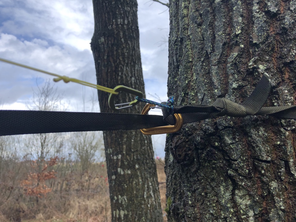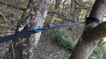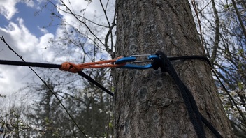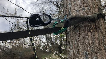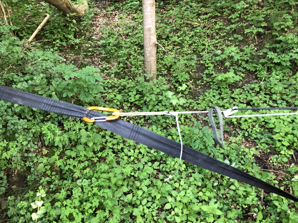 • Da ich auch festgestellt habe, dass so eine Tarpschnur aufgrund der starken Spannung für den Baum sicher nicht besonders gut ist, hänge ich seitdem mein Tarp in Daisychains, also Baumgurte. Manchmal befestige ich es auch an meiner HM Aufhängung.