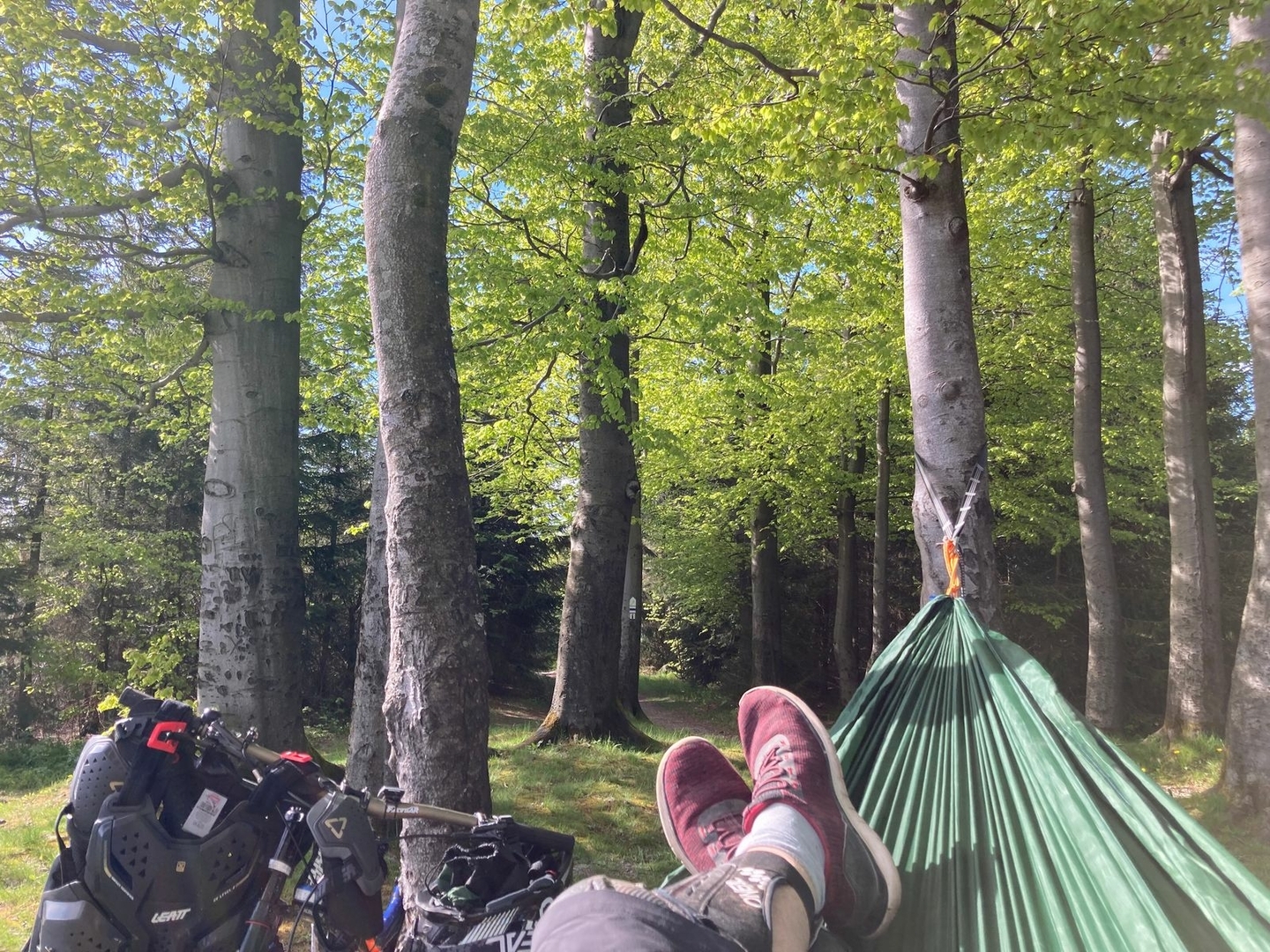 Equipment habe ich derzeit einen billigen Underquilt von AliExpress und zwei Schlafsäcke, einmal was leichtes und einmal einen (für Daunen) leichten Daunenschlafsack (Deuter Astro 500 SQ). Mit einem Moskitonetz konnte ich mich nie anfreunden.
