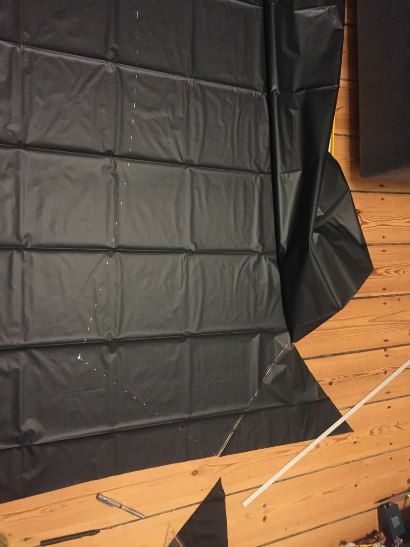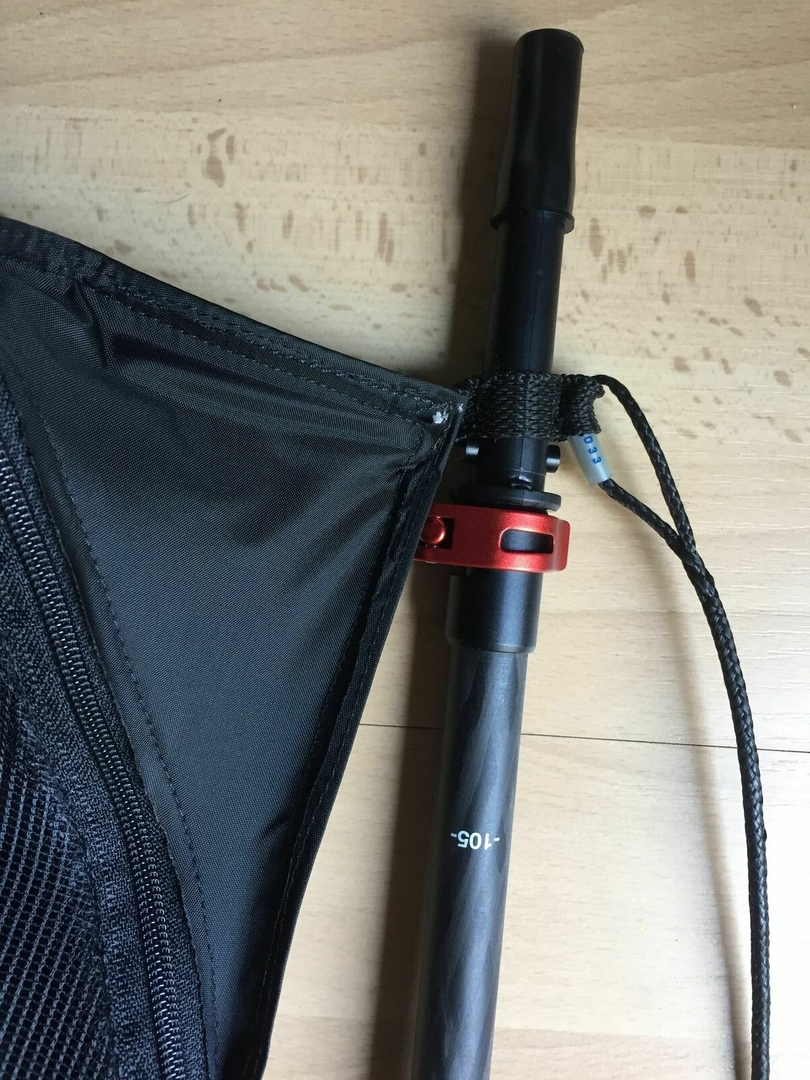 Beim Rest der Matte bin ich sehr eng den Vorgaben von Bic gefolgt und ganz bewusst ein etwas zu lange Matte für mich gemacht (1,75m 65kg), den Platz brauchte ich für den Bodenaufbau, damit auch mein Rucksack ans Fußende passt. Da ich noch keine Wanderstöcke hatte, habe ich ein paar alte billo 11mm Kohlefaser Zeltstangen als Spreizstangen provisorisch gebaut. Da ich zu wenig Dyneema für das Brücke-HM typische Abspanndreieck hatte, habe ich die vier Abspannleinen kurzerhand jeweils ~7cm kürzer gemacht. Das hat sich direkt beim ersten Testen als riesen Fehler herausgestellt. Je kürzer die Schenkel sind, desto mehr Kraft geht in die Spreizstangen, welche sich ganz ganz spektakulär gebogen haben und fast gebrochen sind. Da ich kein Fan von Carbonsplittern 10cm über meinem Kopf bin, habe ich durch etwas grübeln eingesehen, dass das von Bic vorgestellte Abspann-Dreieck echt das absolute Minimum ist.