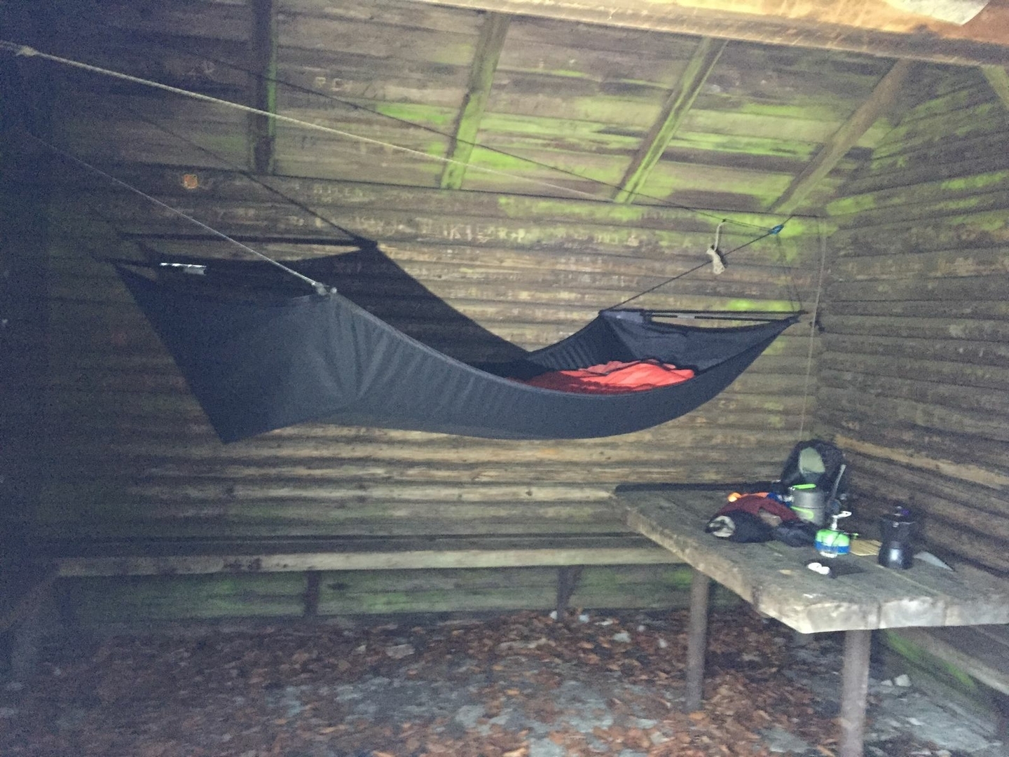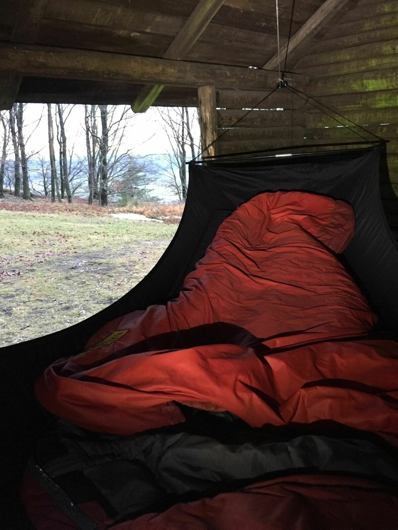Leider nicht ganz ideal aufgespannt, weil die Hütte einfach zu kurz war, aber draußen im Wald war sturm, und trotzdem lag ich gerade und die Thermarest Venture funktioniert super damit. Trotzdem krass, was da an Last auf den Bogen ist, wenn man die anschnippst hört man ein Poing. Die Spreizstangen waren leider wirklich nur ein Provisorium, weil total schwer und für nichts anderes auf der Tour zu nutze.