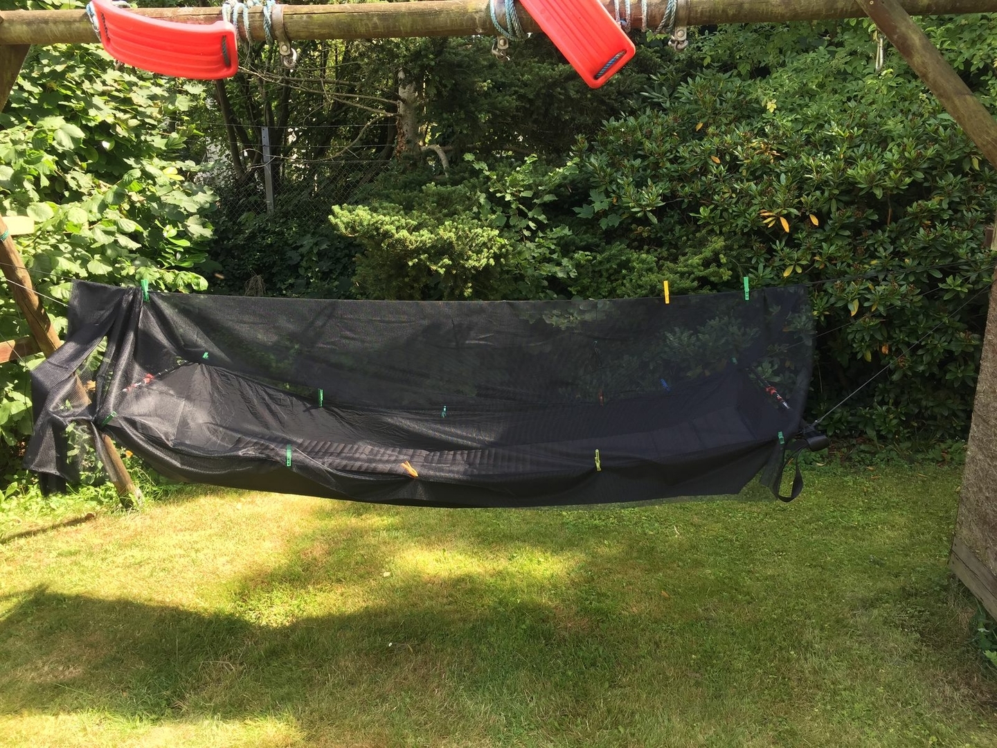 Erst wollte ich noch die Ridgeline durch das Netz führen, das hätte aber ein paar komplizierte Laschen gebraucht, da ja die Ridgeline je nach Belastung sich weiter von der HM entfernt. Zwei 2mm Gummikordeln an die Spitzen des Netzes geknotet (nicht genäht!) sind super! So ist alles unter Spannung und der Aufbau ist simpel, gleichzeitig kann das Tarp auf der Ridgeline aufliegen und das Kondenswasser berührt nicht das Netz.