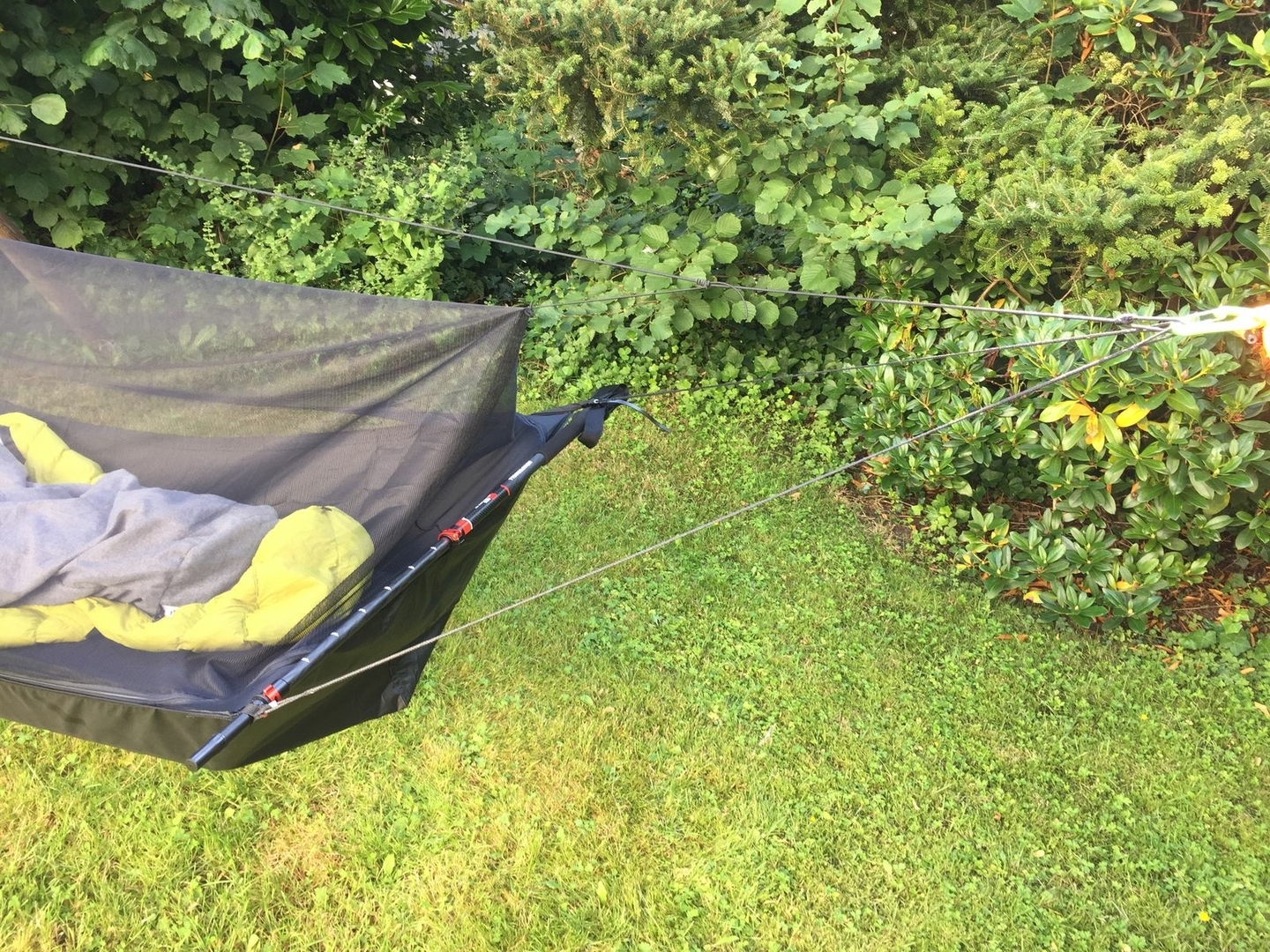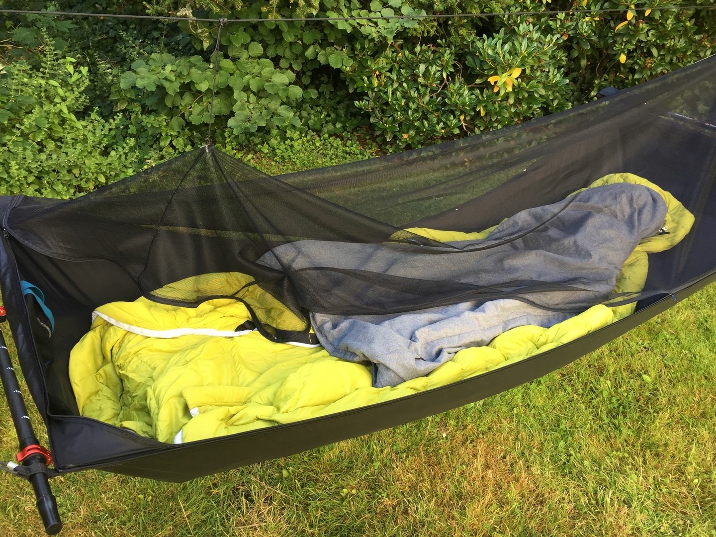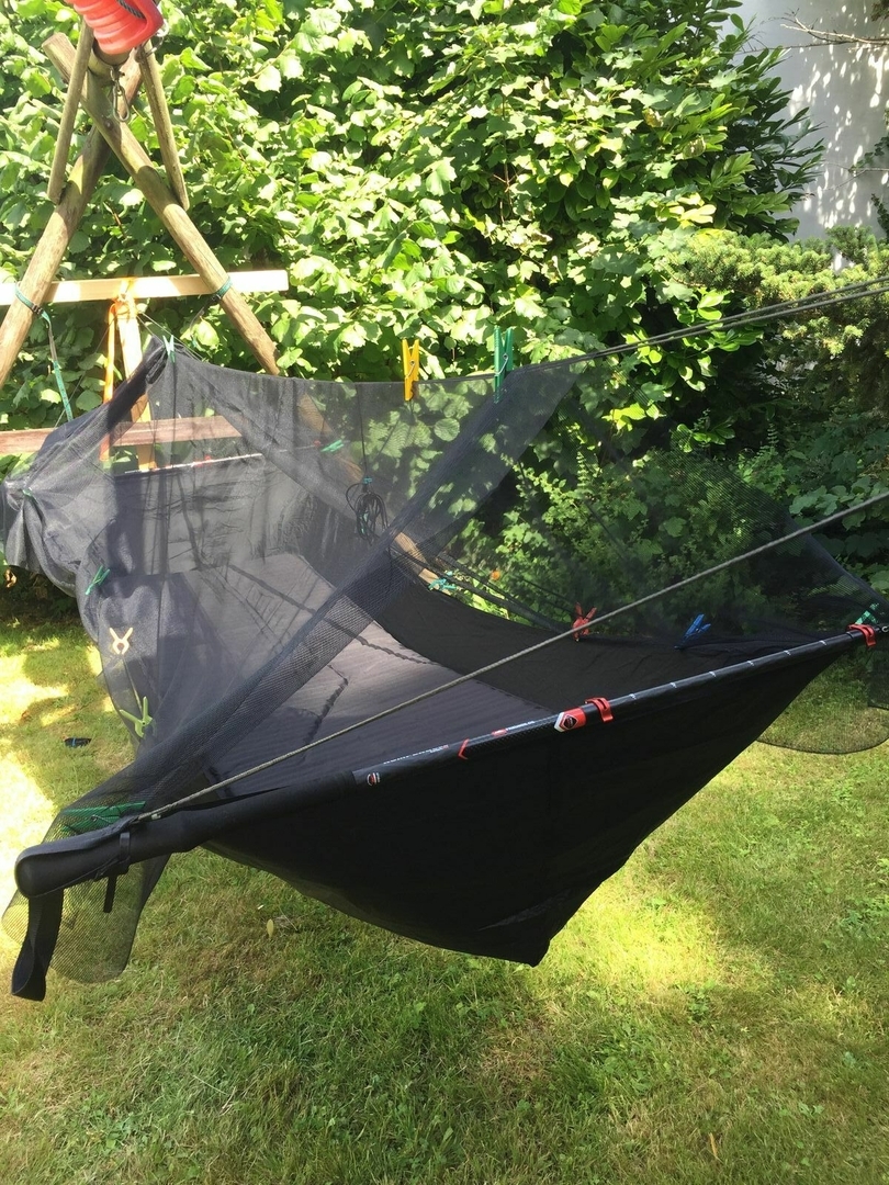 Ich bin mit dem aktuellen Stand ziemlich zufrieden, insbesondere kann ich das Netz am Kopfende links und rechts aufzippen bis zu meinen Schultern und die Gummikordel an der Ridgeline Richtung Mitte verschieben So hab ich freien Blick in die Sterne und das lose Netz verschließt den Raum zu meinen Füßen. Zum Schlafen kann dann alles verschlossen werden ohne aufstehen zu müssen.