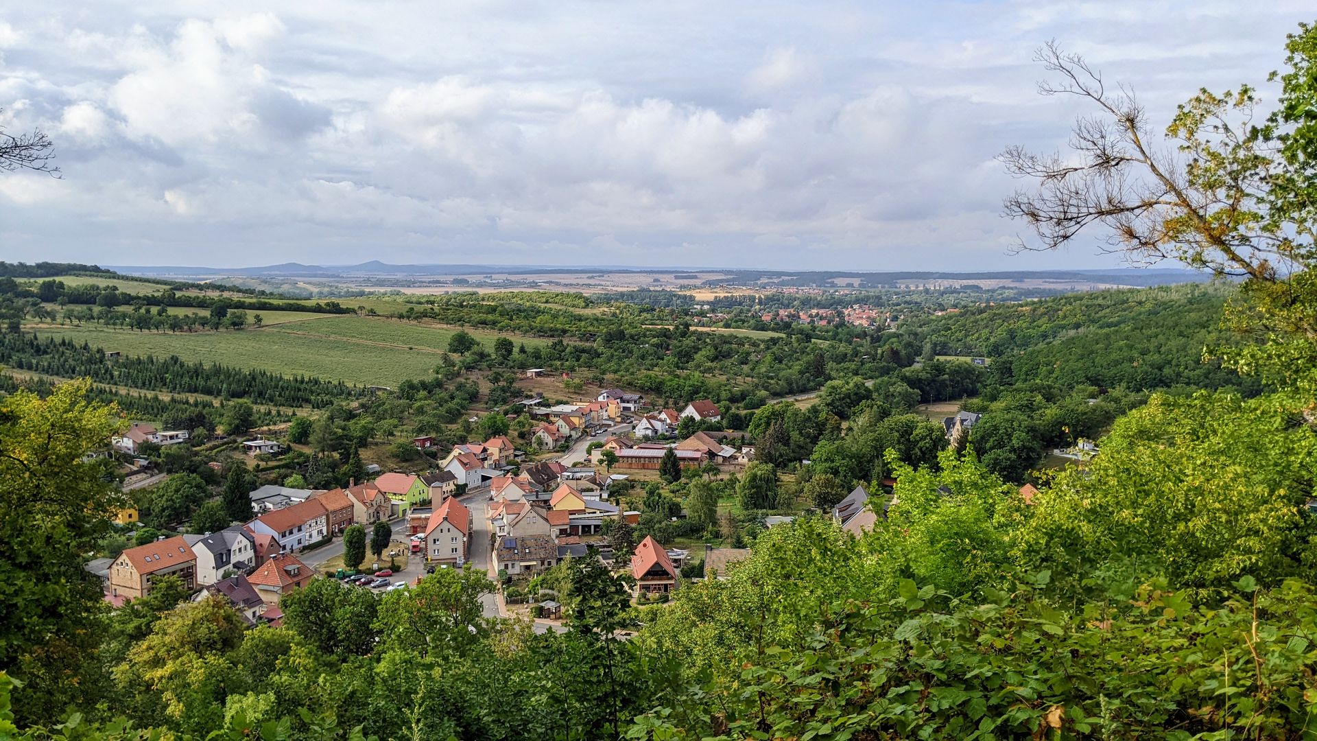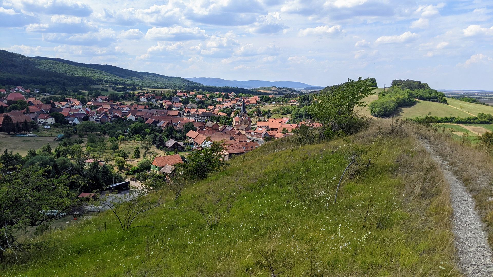 Blick auf Benzingerode. Wer faul ist, wandert einfach weiter unten. Wer beim Auf und Ab schwitzt, der wird fürstlich belohnt: