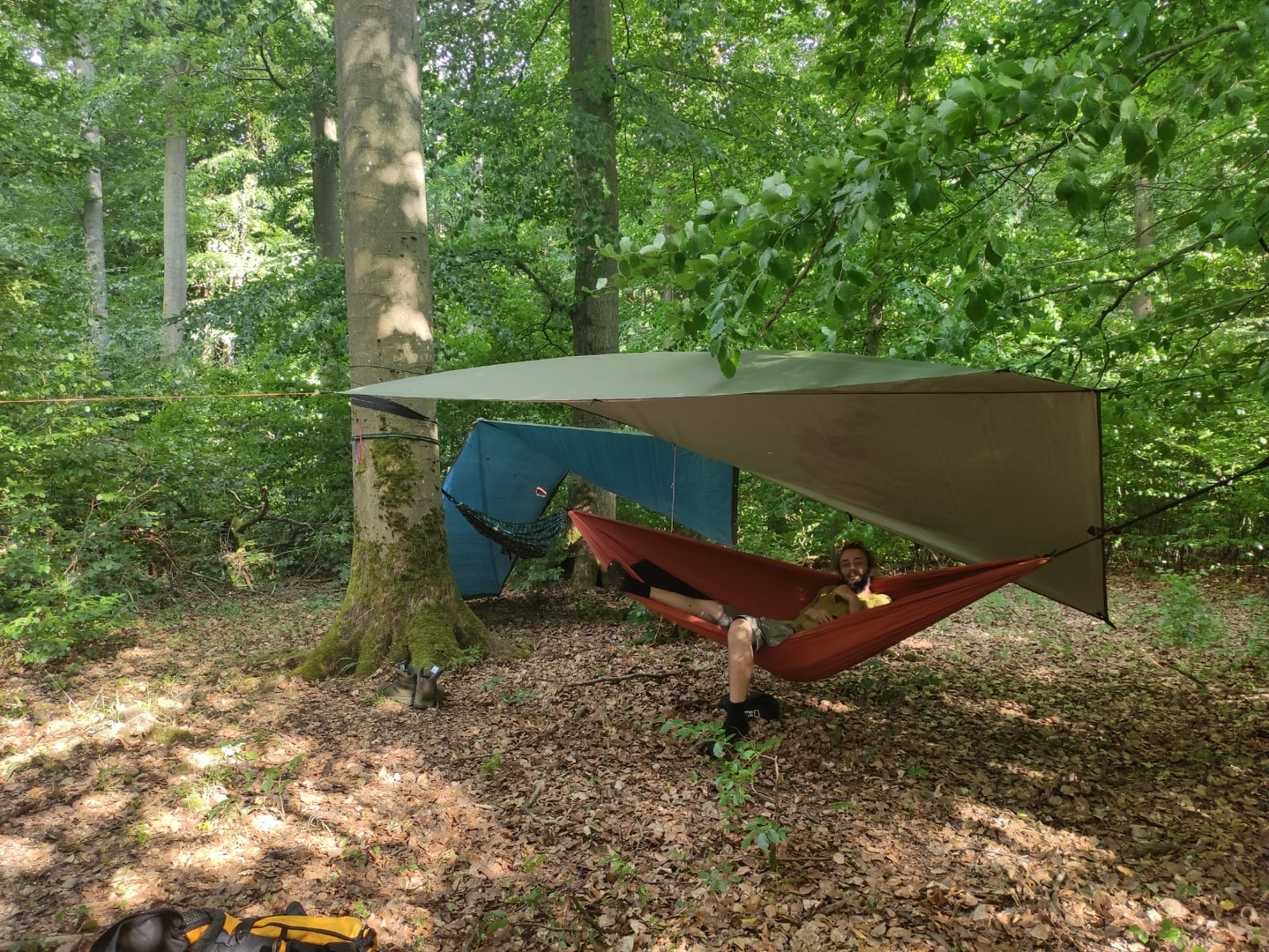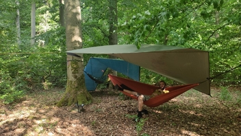 Meine erste Hängematte von Quechua (https://www.decathlon.de/p/hangematte-k…7691?mc=8601390) habe ich vor einiger Zeit mal geschenkt bekommen. Dazu ein günstiges Tarp von Amazon, ein günstig auf Kleinanzeigen geschossener Schlafsack und eine aufblasbare Isomatte.