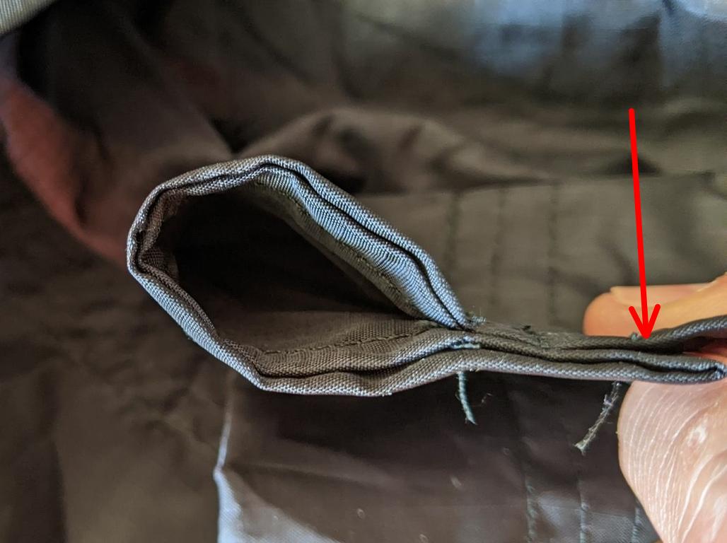 Alternativ gebe ich eine Continuous Loop hindurch und mache einen Larks Head (ich habe viele Namen für diesen Knoten gelesen. Wie nennt ihr den?). Dadurch ist er genauso verbunden wie beim Knubbel und der Stoff fächert sich nicht auf.