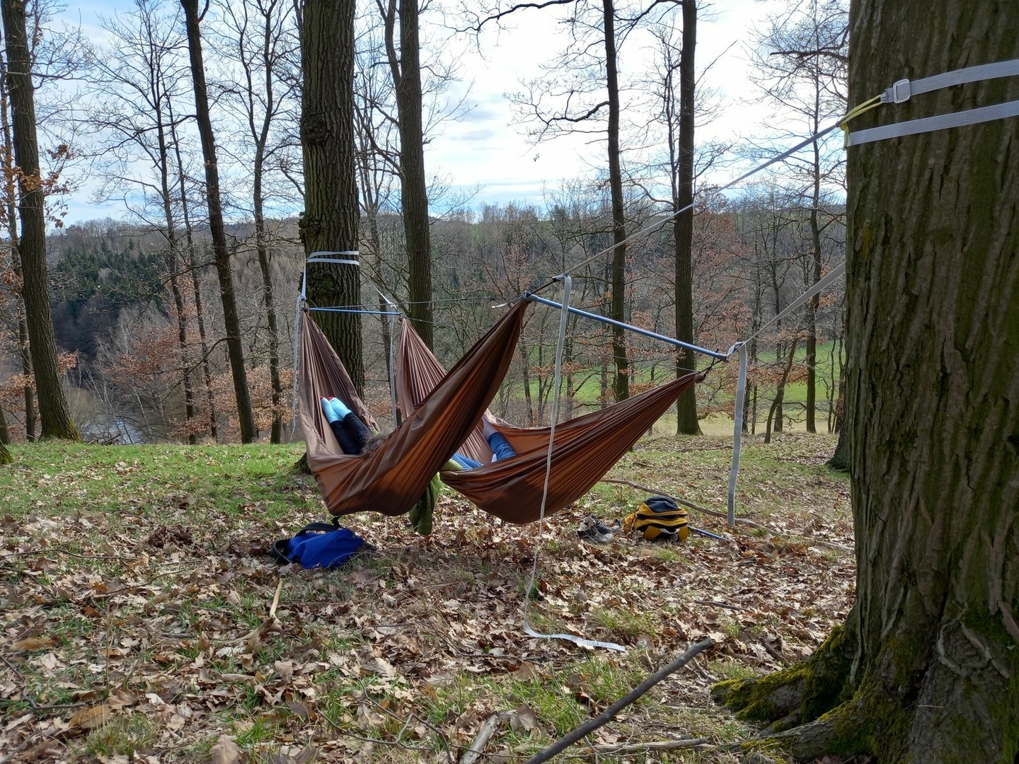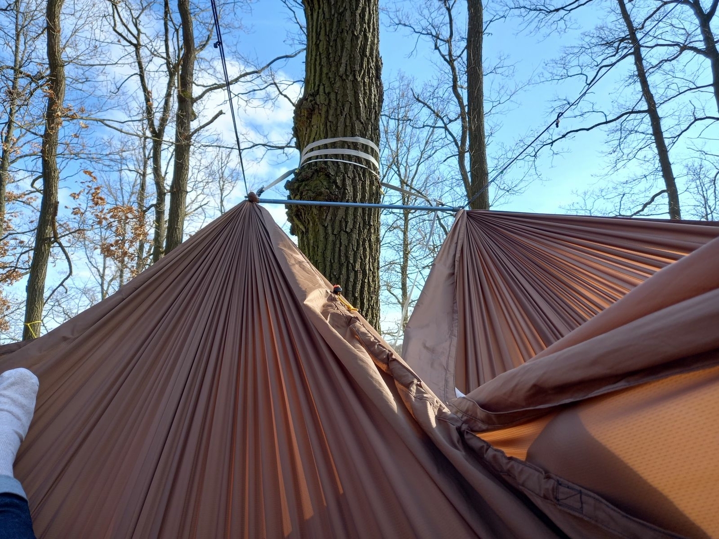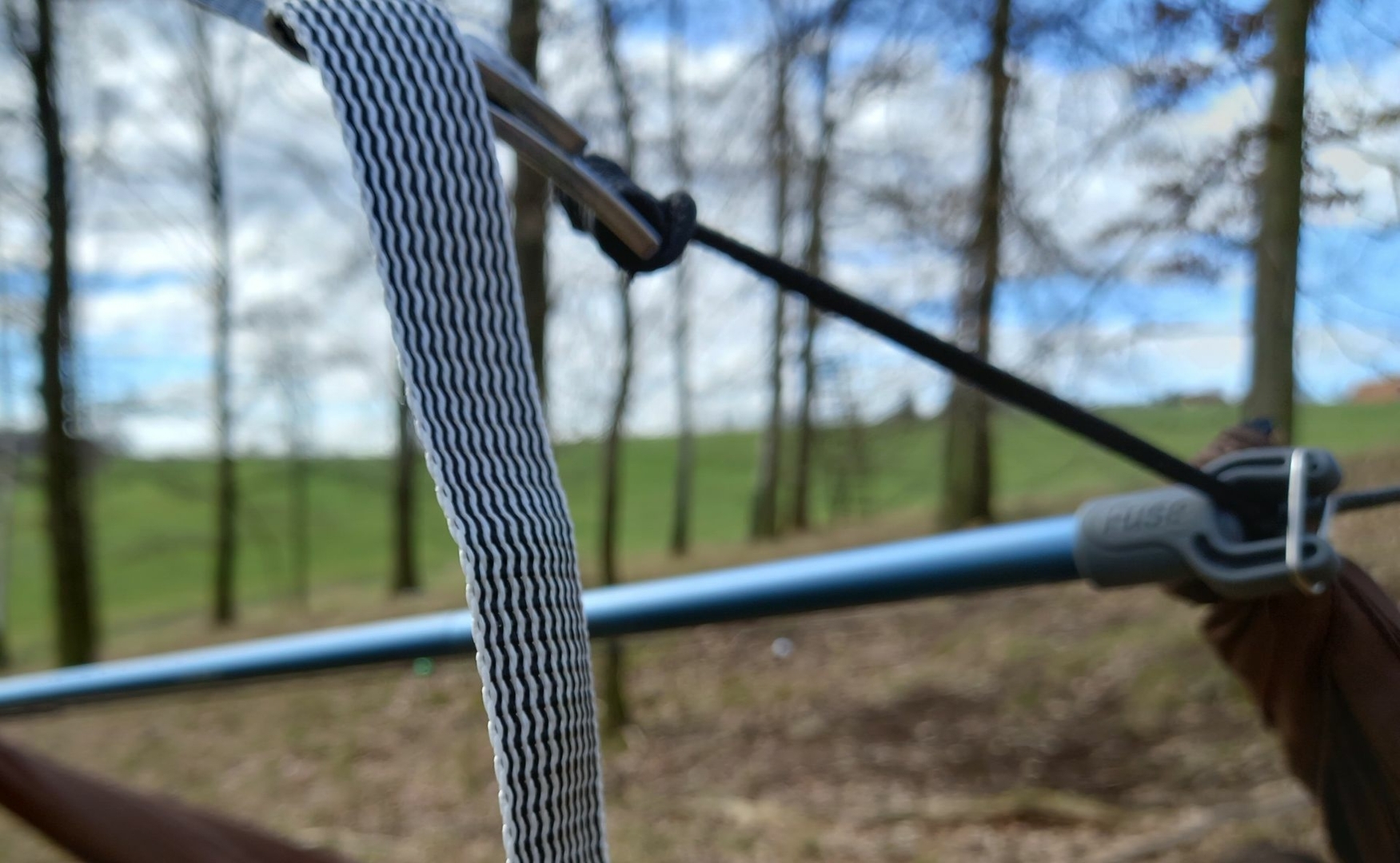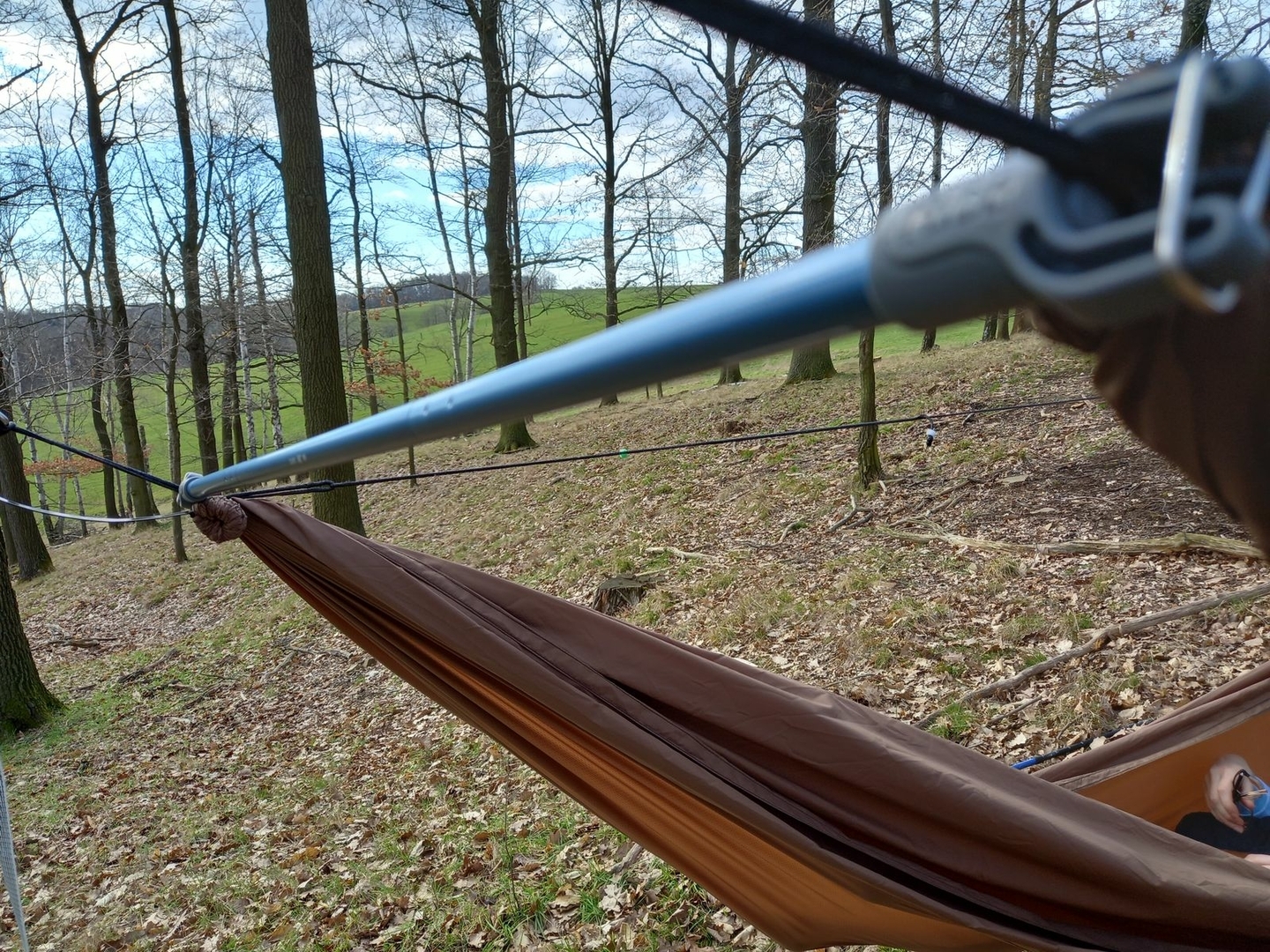 Ich habe am Wochenende die ENO Fuse Tandem Spreize ausprobiert. So brauche ich ggf. nur zwei Bäume und ein Tarp für zwei Hängematten.