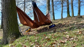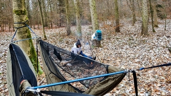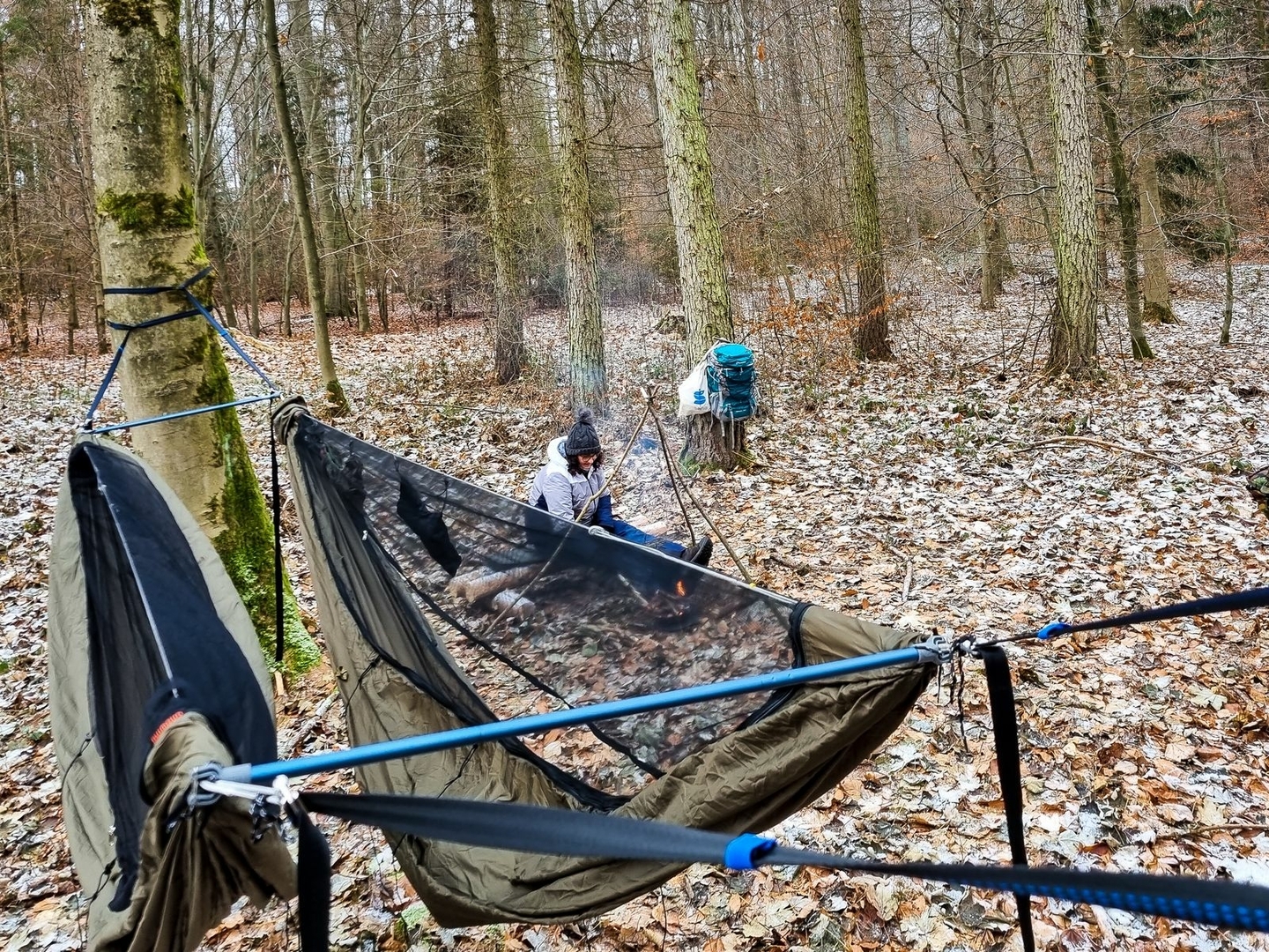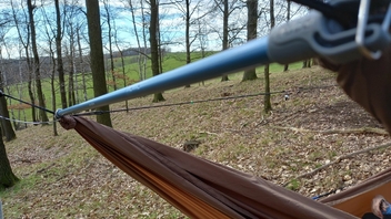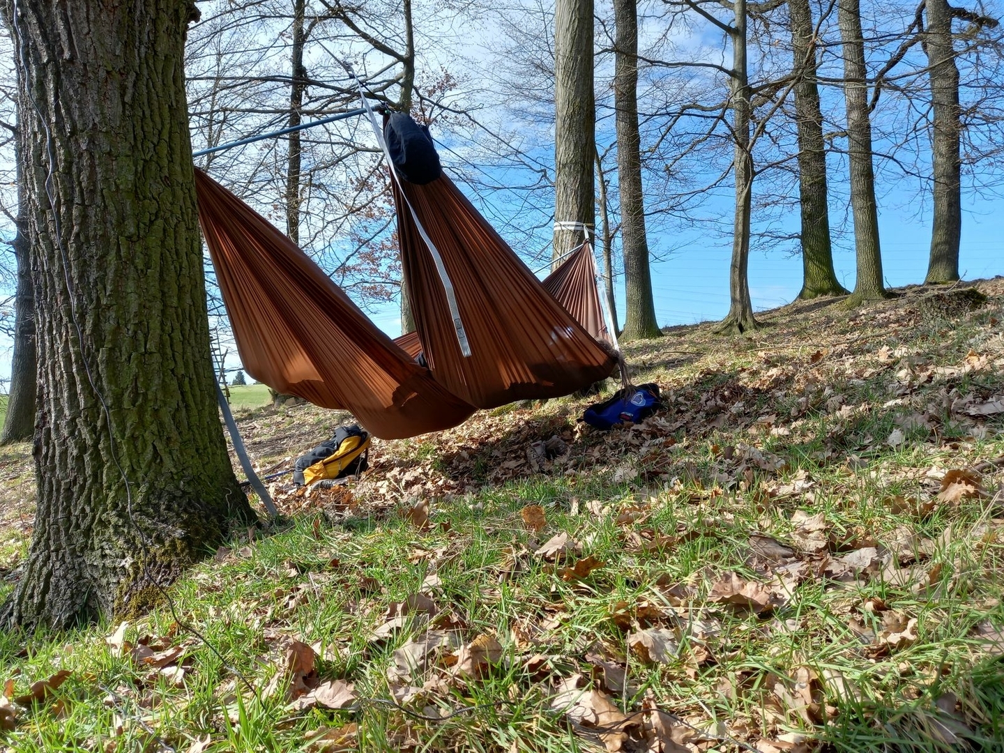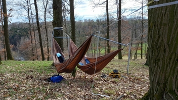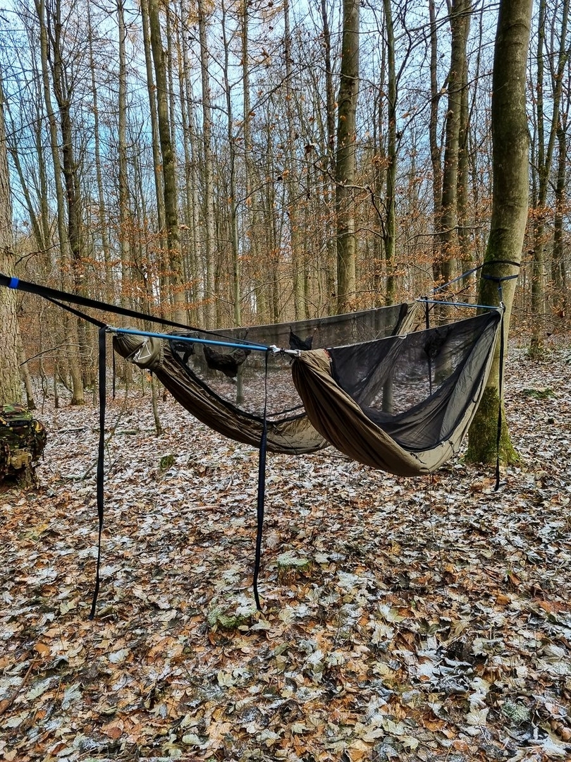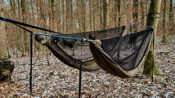Ich habe am Wochenende die ENO Fuse Tandem Spreize ausprobiert. So brauche ich ggf. nur zwei Bäume und ein Tarp für zwei Hängematten.