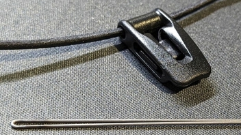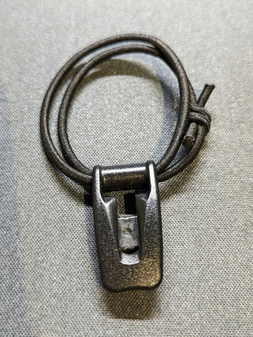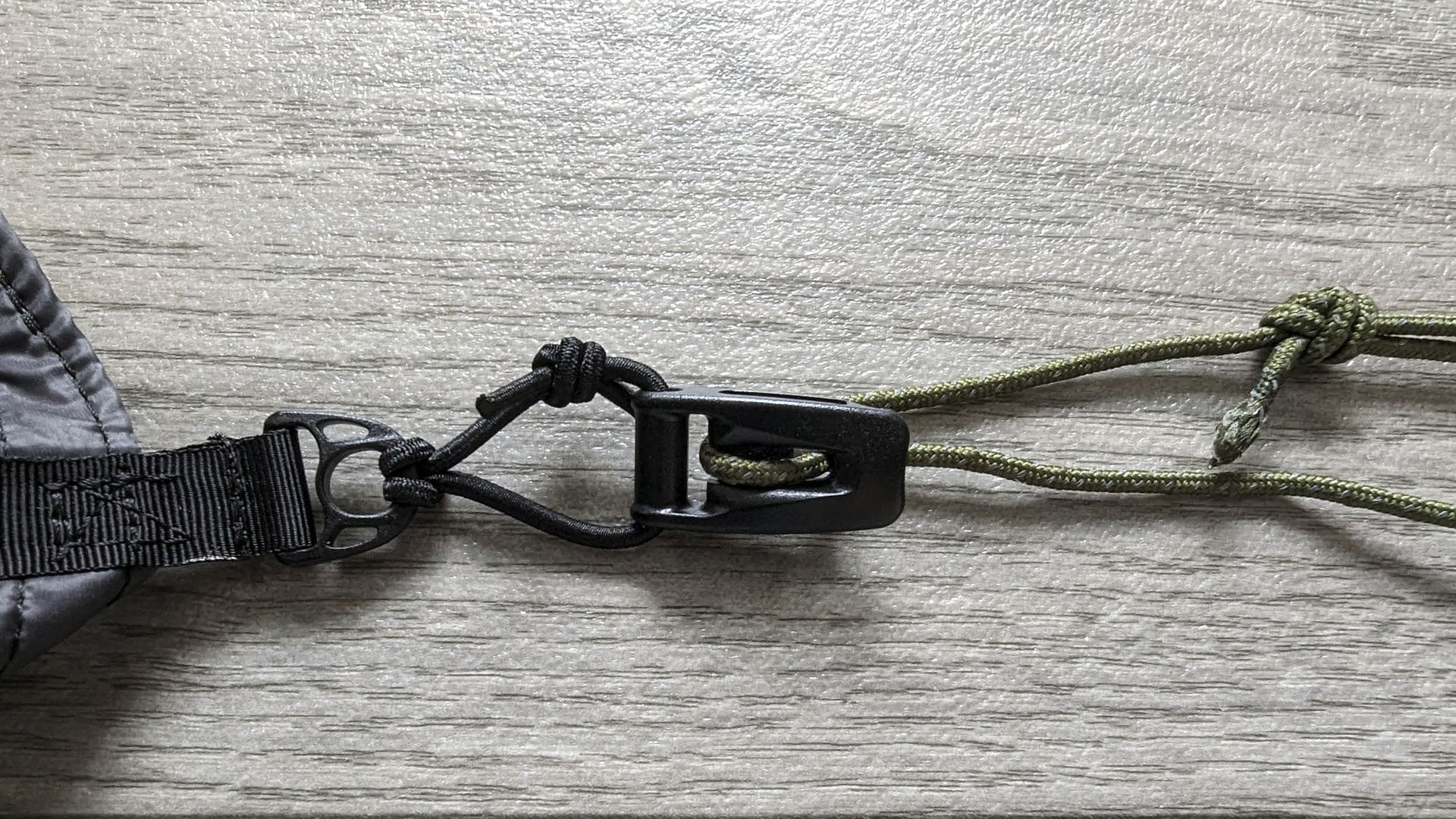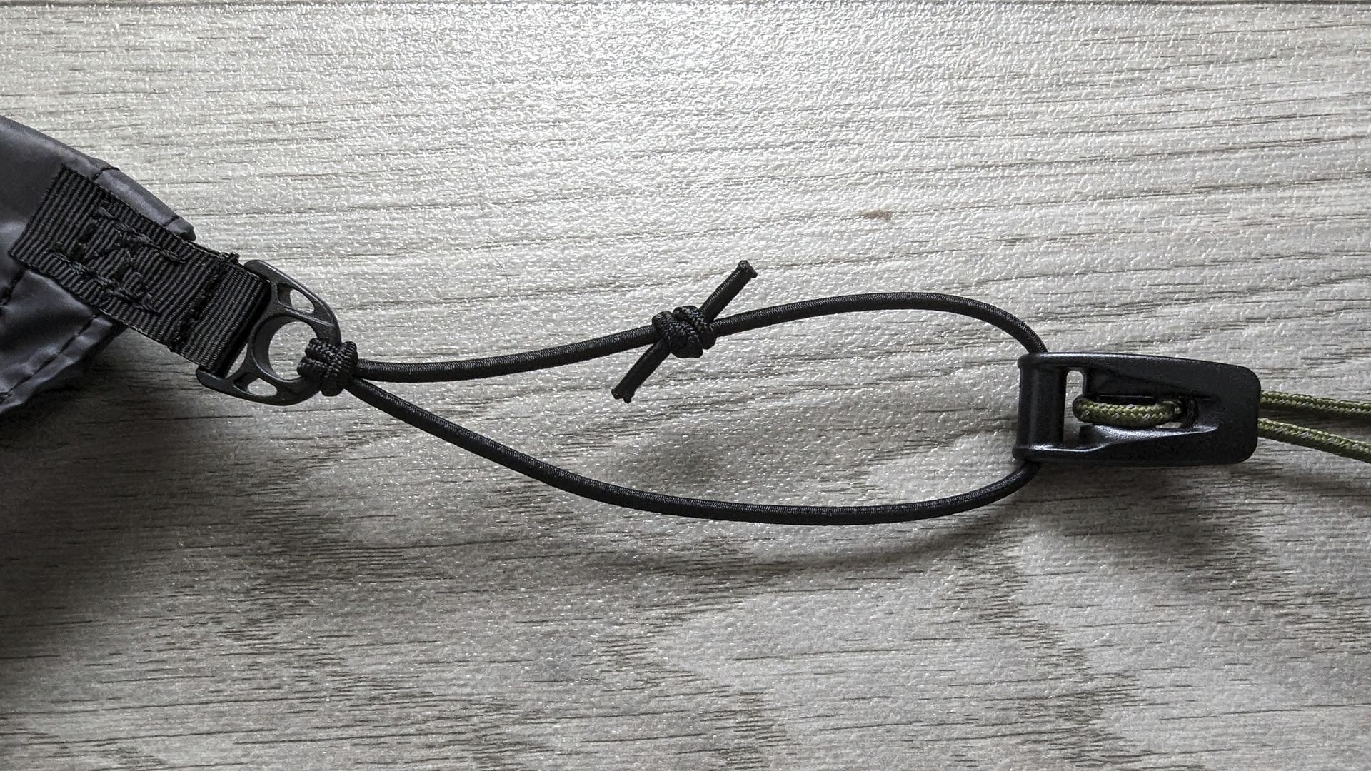 Verwendet wurde eine 2,5 mm Gummikordel von hammock fairy. Nun habe ich eine Shock Cord versuchsweise stark gekürzt, was schon etwas hilft, aber noch nicht ganz zufriedenstellend ist, da das ganze immer noch eine ordentliche "Grundlänge" bis zum Hering mit sich bringt.