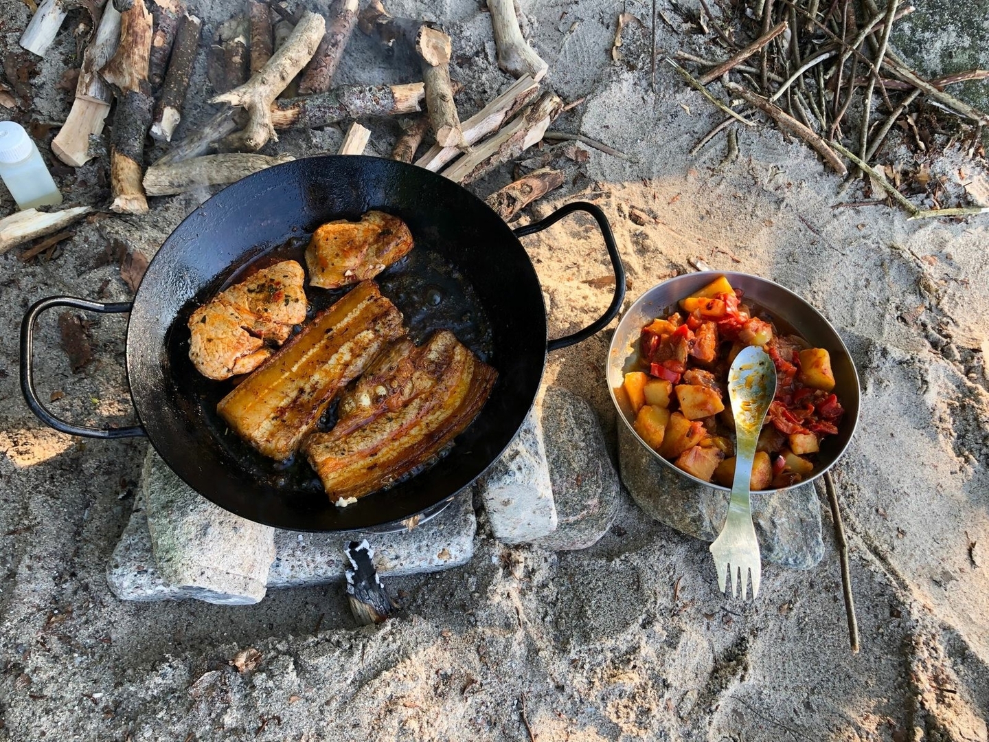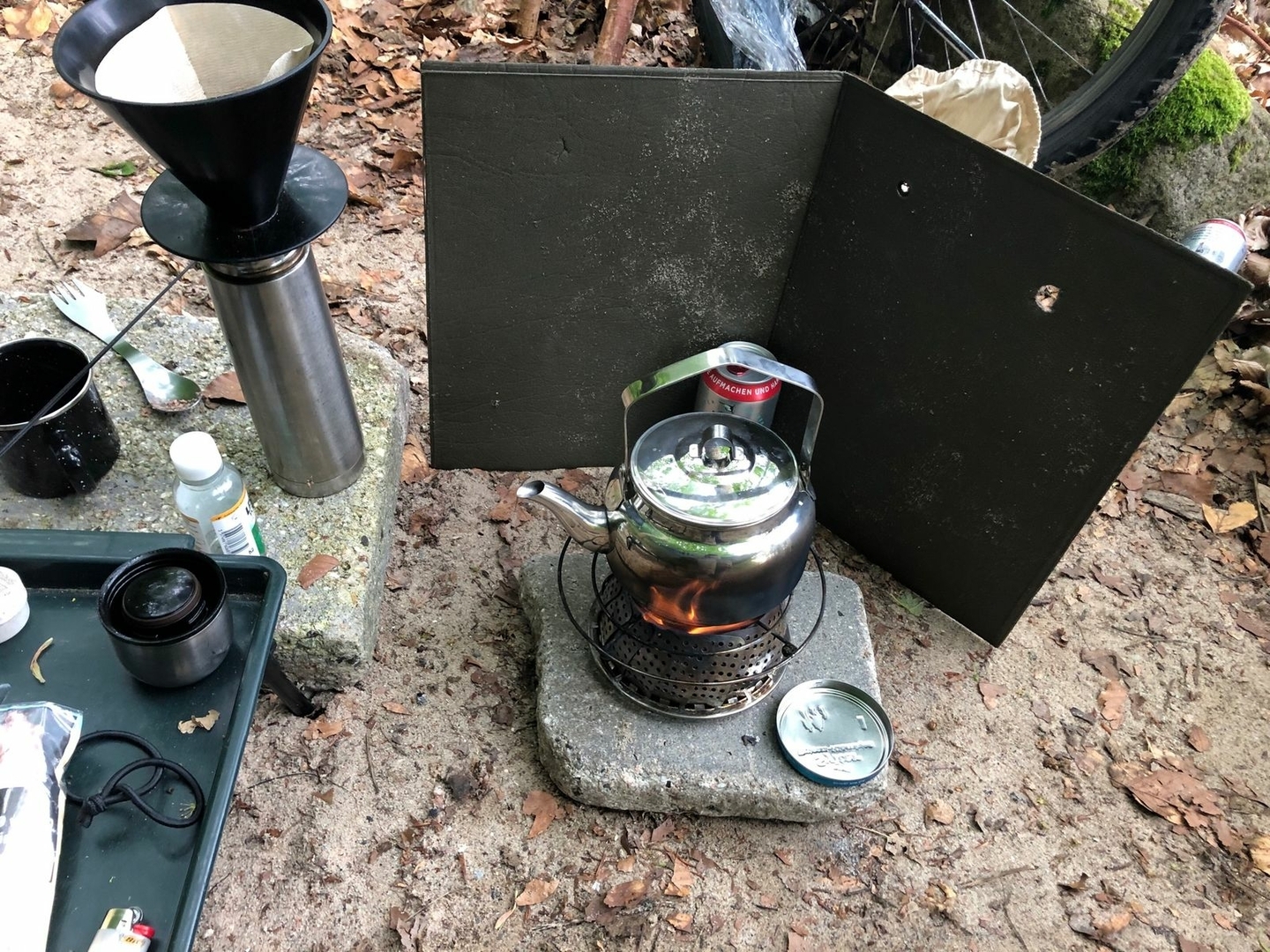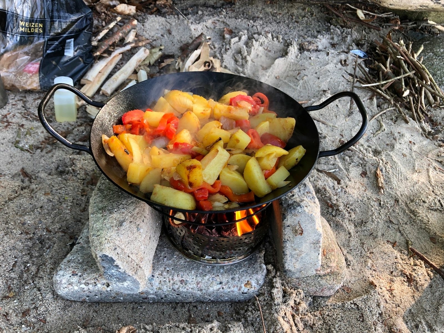 Gekocht wurde diesmal auf meiner DIY Dunsteinsatz-Feuerschale............abends mit Holz und Frühstück mit Spiritus.