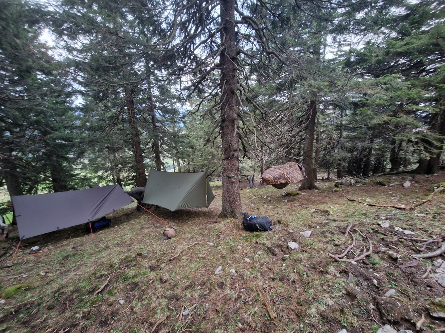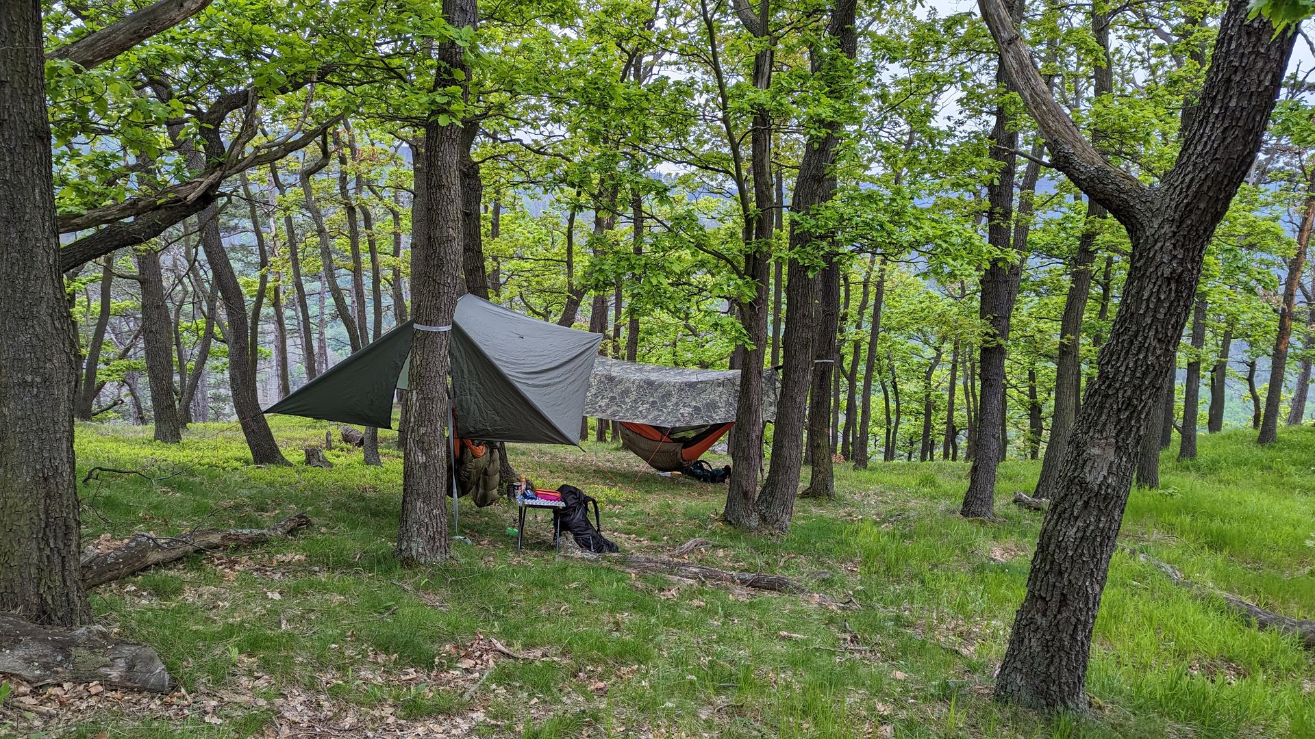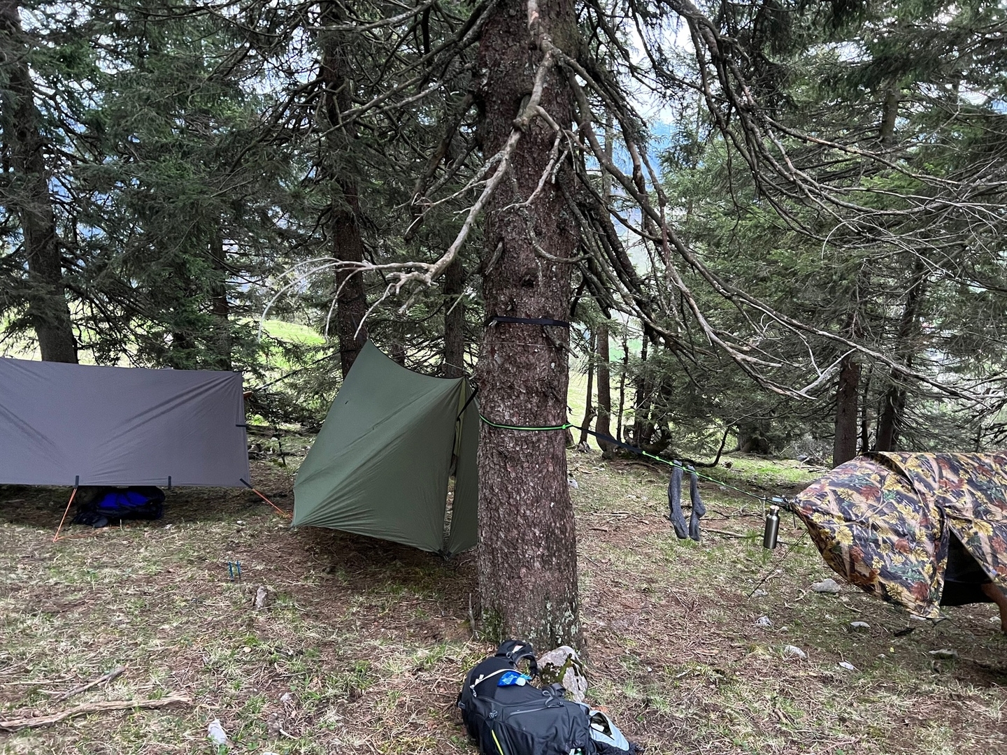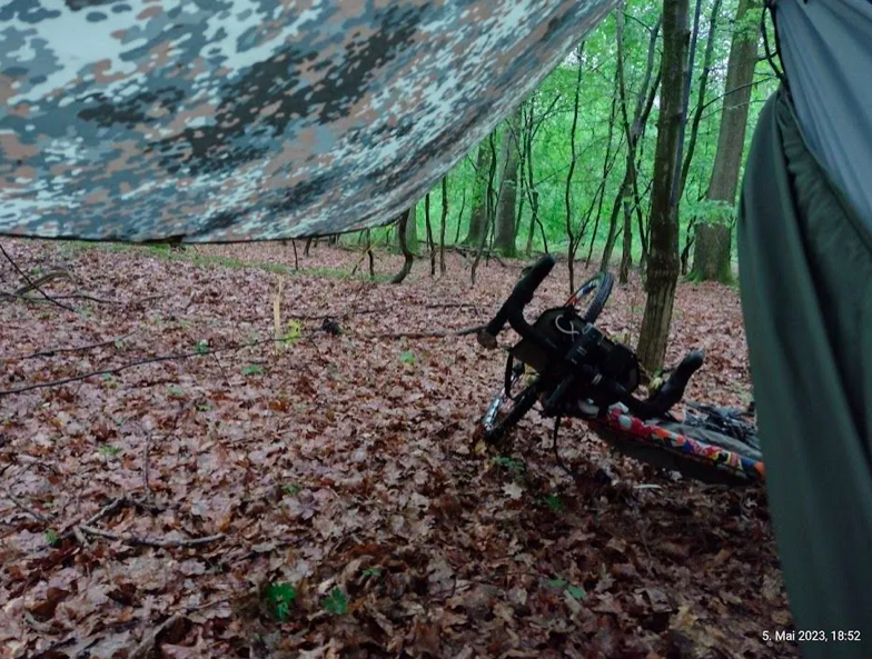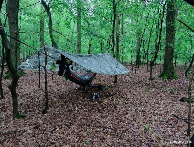 Die Hinfahrt trocken war und der Aufbau zeitlich sowas von passte. Das Einzige was ich vergessen hatte, war ein Stück Plane um sich auf den Waldboden zu setzen. Kurzum, mein Lager war schnell aufgebaut.