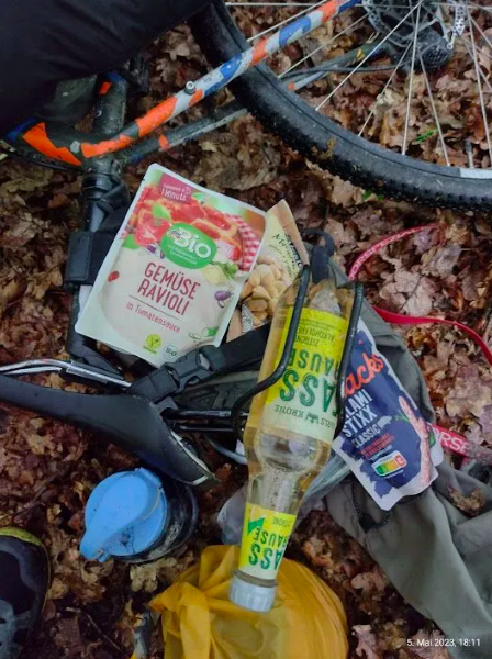 So liegend in der Hängematte hatte das was. Die Regentropfen fielen auf das Tarp, ringsrum war außer dem Regen nur ein paar Vöglein zu hören. Irgendwann griff ich mir noch einen zweiten Riegel und dazu dann den alkoholfreien Radler.