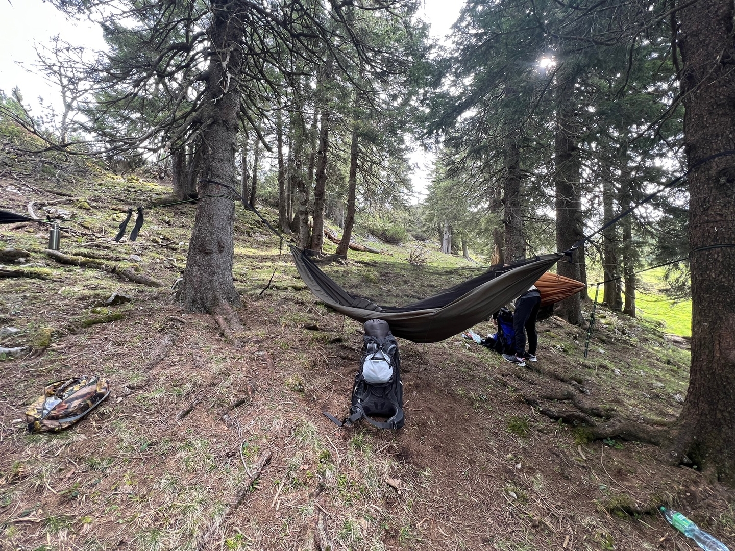 Fazit zu meiner dritten Hängemattenübernachtung: Lange nach einer passenden Stelle mit passenden Bäumen gesucht. Lange mit Einstellungen rumprobiert. Liegekomfort nicht ganz optimiert gekriegt. Underquilt umständlich anzubringen, aber ausreichend funktionierend. Moskitonetz umständlich anzubringen (musste Underquilt noch mal abnehmen), aber gut funktionierend. Wertsachenaufbewahrung in der Hängematte umständlich. Schlaf ausreichend. Frühstück endlich wieder am Boden.