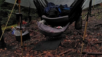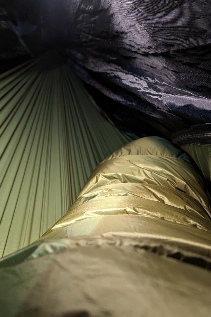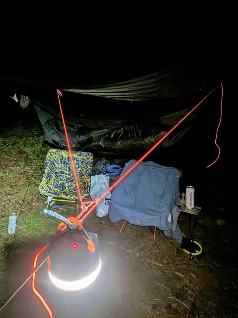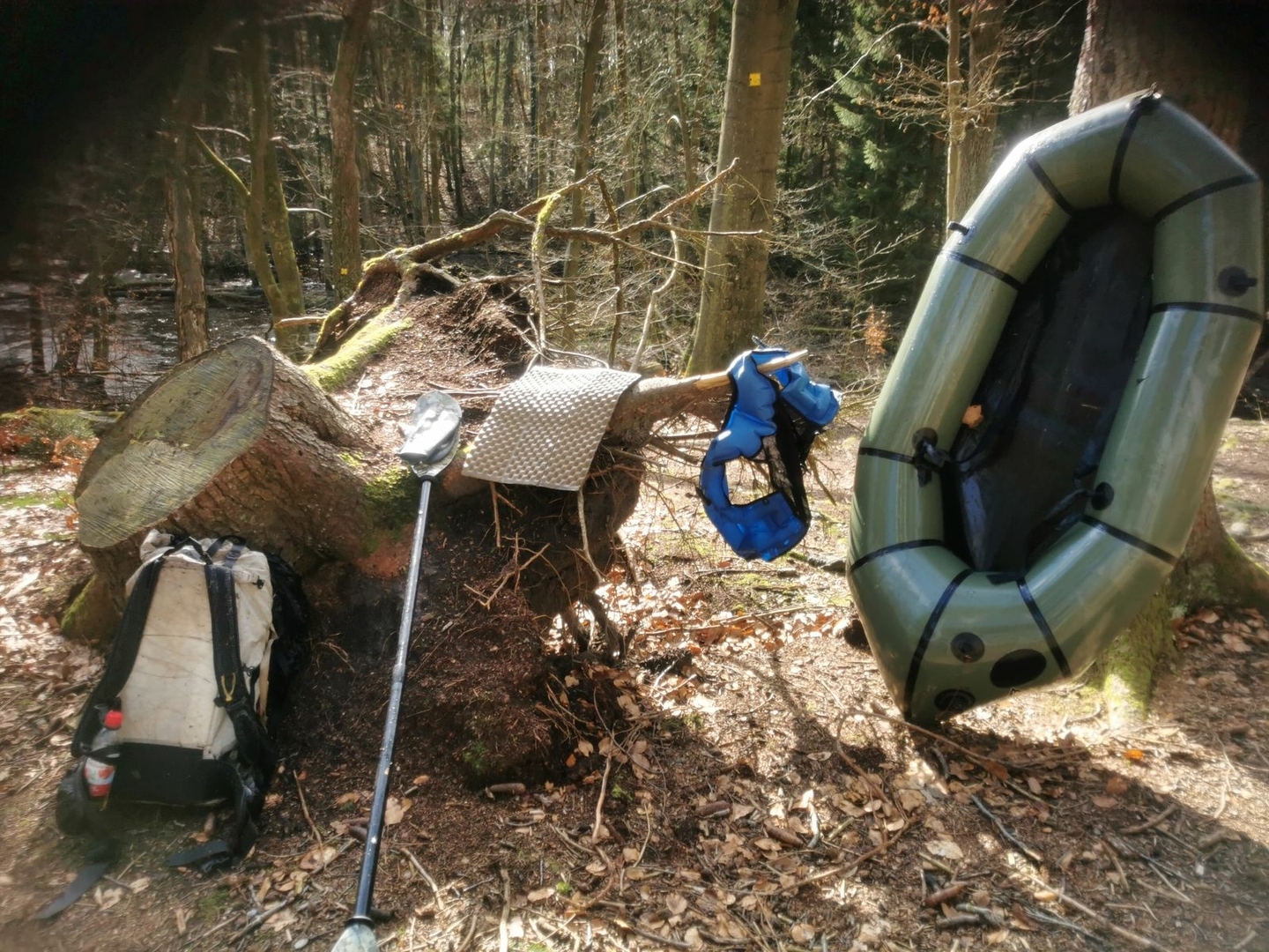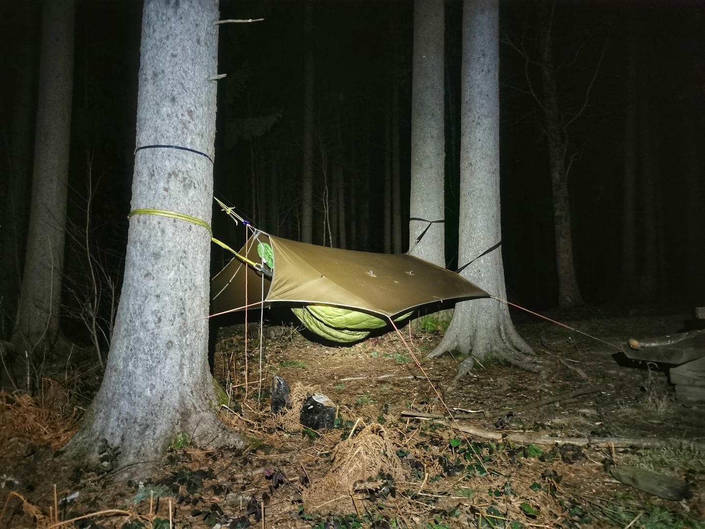 Prasselnden Regen auf dem Tarp hatte ich letzte Nacht reichlich, aber zum Glück erst, als ich in der Hängematte lag und netterweise hatte es aufgehört, bevor es wieder rausging. Grundsätzlich mag ich das Geräusch auch, aber ich muss mich wohl doch noch/wieder mit dem Thema Driplines für die CH befassen, denn gestern Nacht rannen eindeutig ein paar Tropfen zu viel an den Aufhängschnüren runter, was sich, zum Glück überwiegend unter der Isomatte gesammelt hat und dann teilweise auch noch in die Gepäckmatte untendrunter in den Rucksack getropft ist. War zum Glück nichts mehr drin. Driplines hatte ich in der Anfangszeit, dann aber wieder darauf verzichtet, weil eine (überraschende) Regennacht auch ohne gut ging.