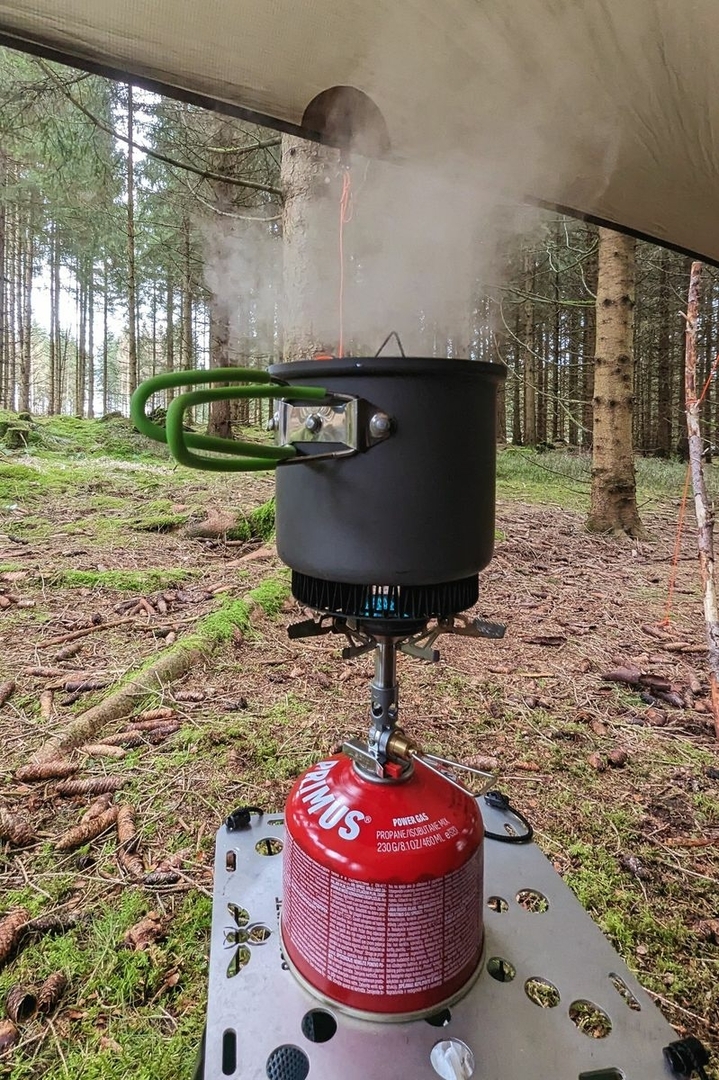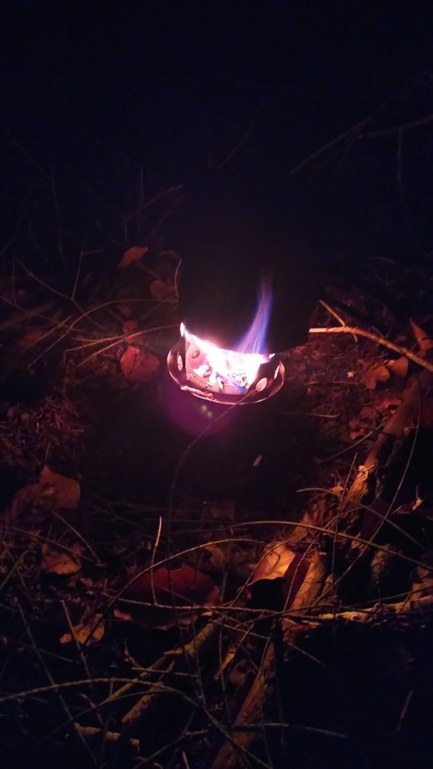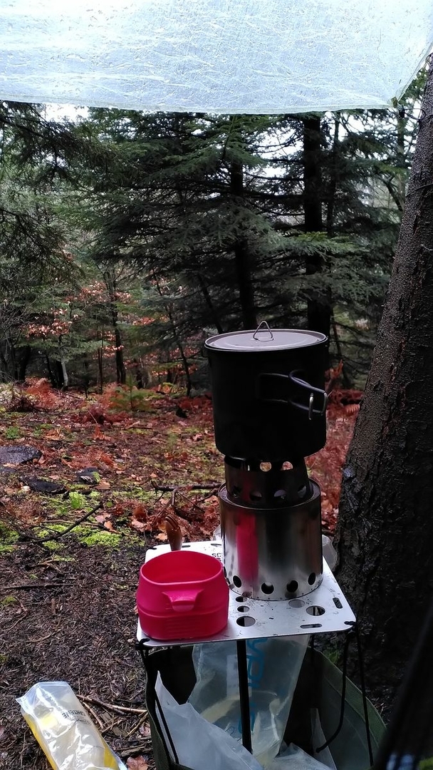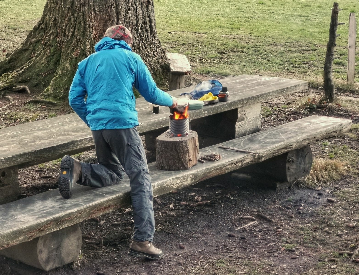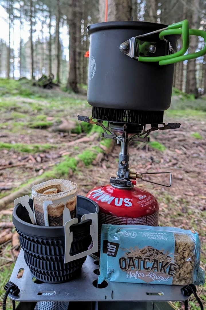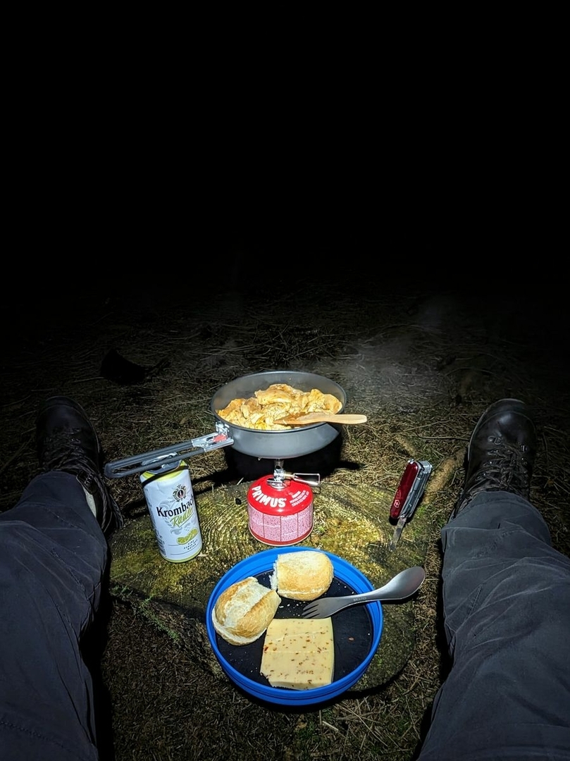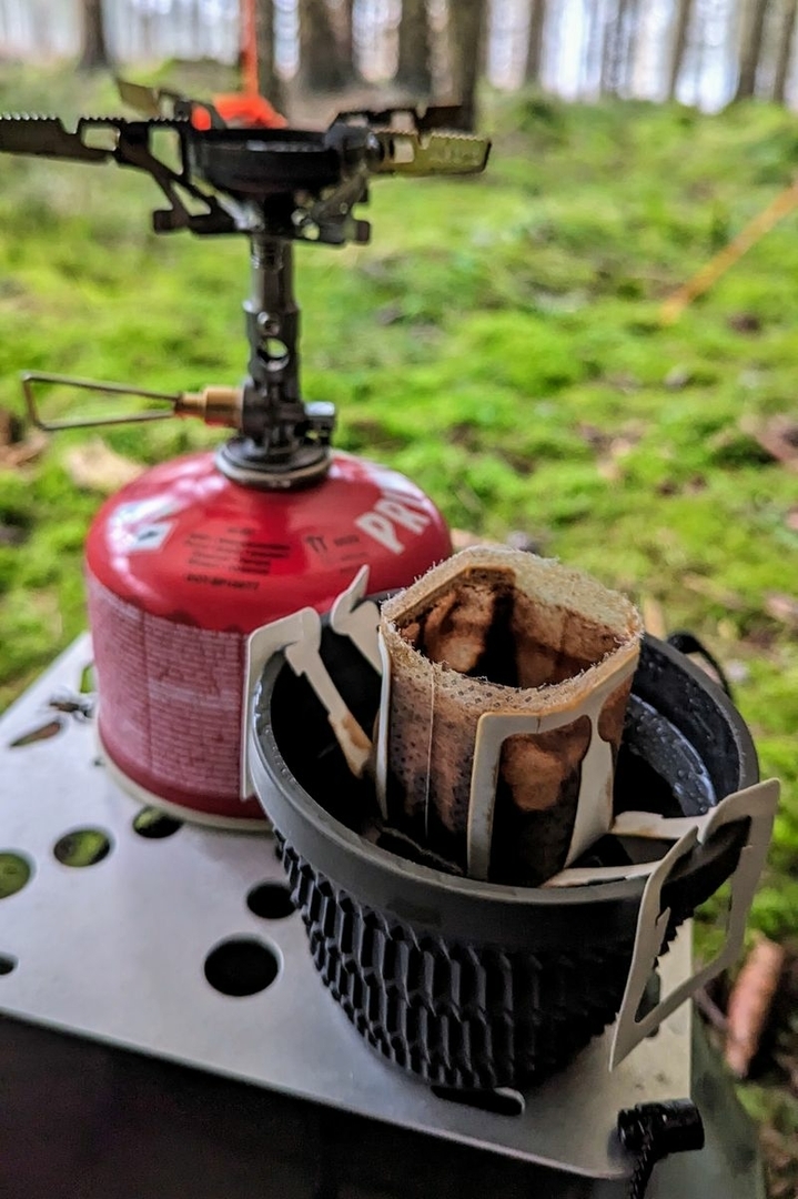 Heißes Wasser fürs Abendessen und die Wärmeflasche hat der Bushbuddy geliefert - zum Anzünden habe ich die Prozedur angesichts der auch an den Tannen reichlich feuchten Äste abgekürzt und kurzerhand mit einem Würfel Esbit entzündet.