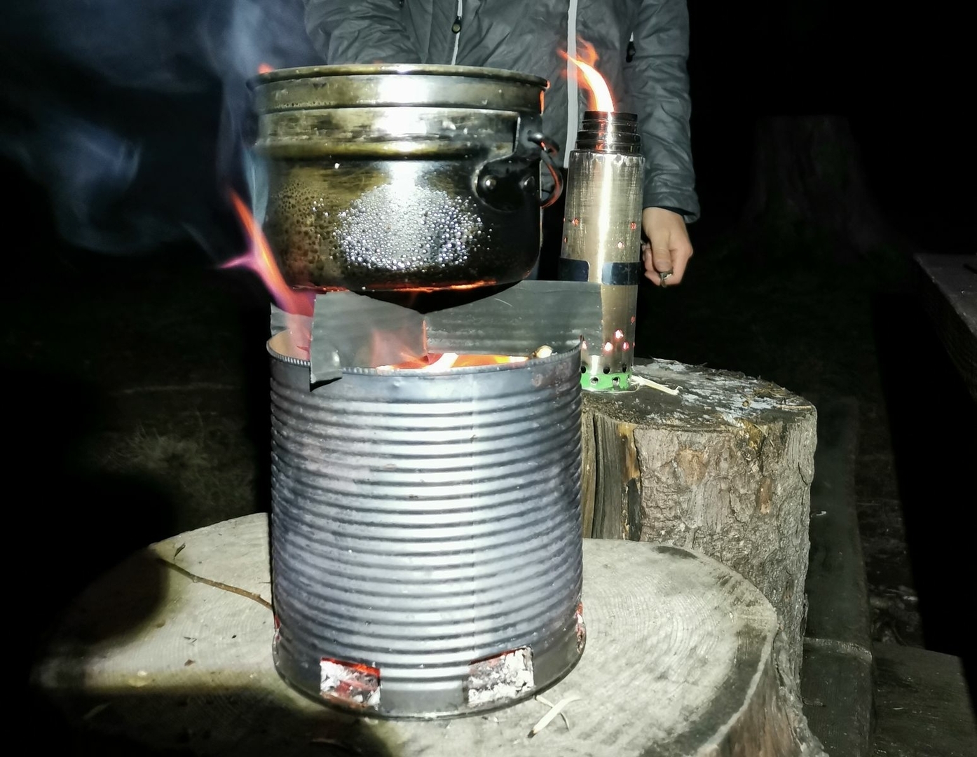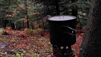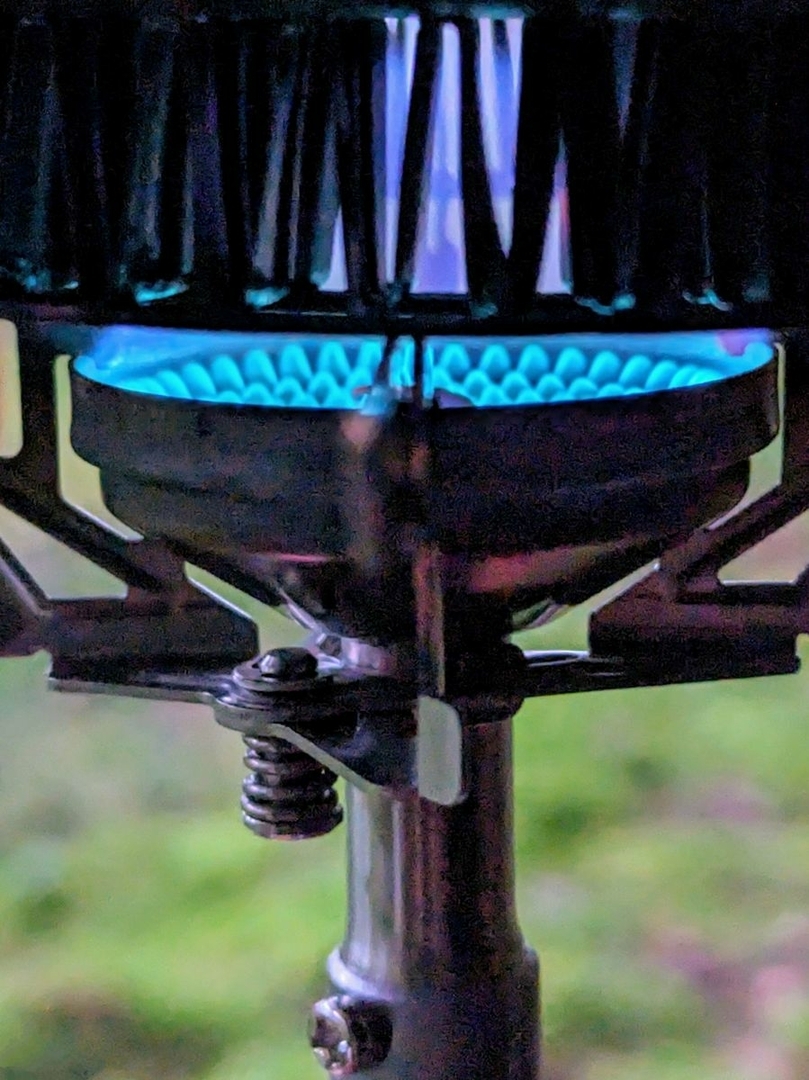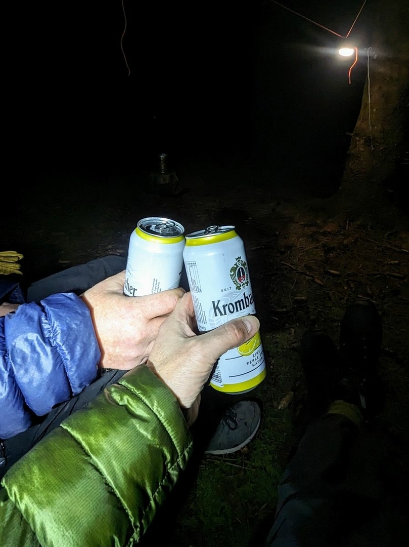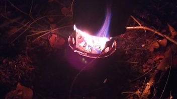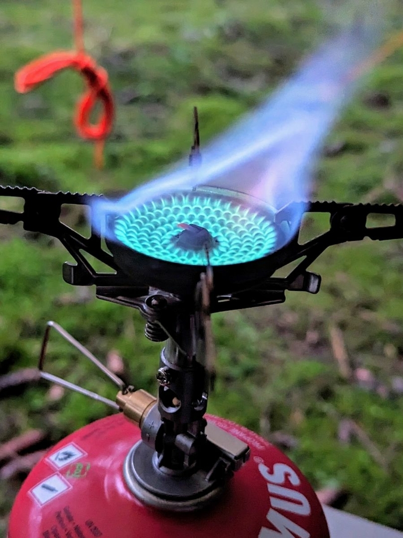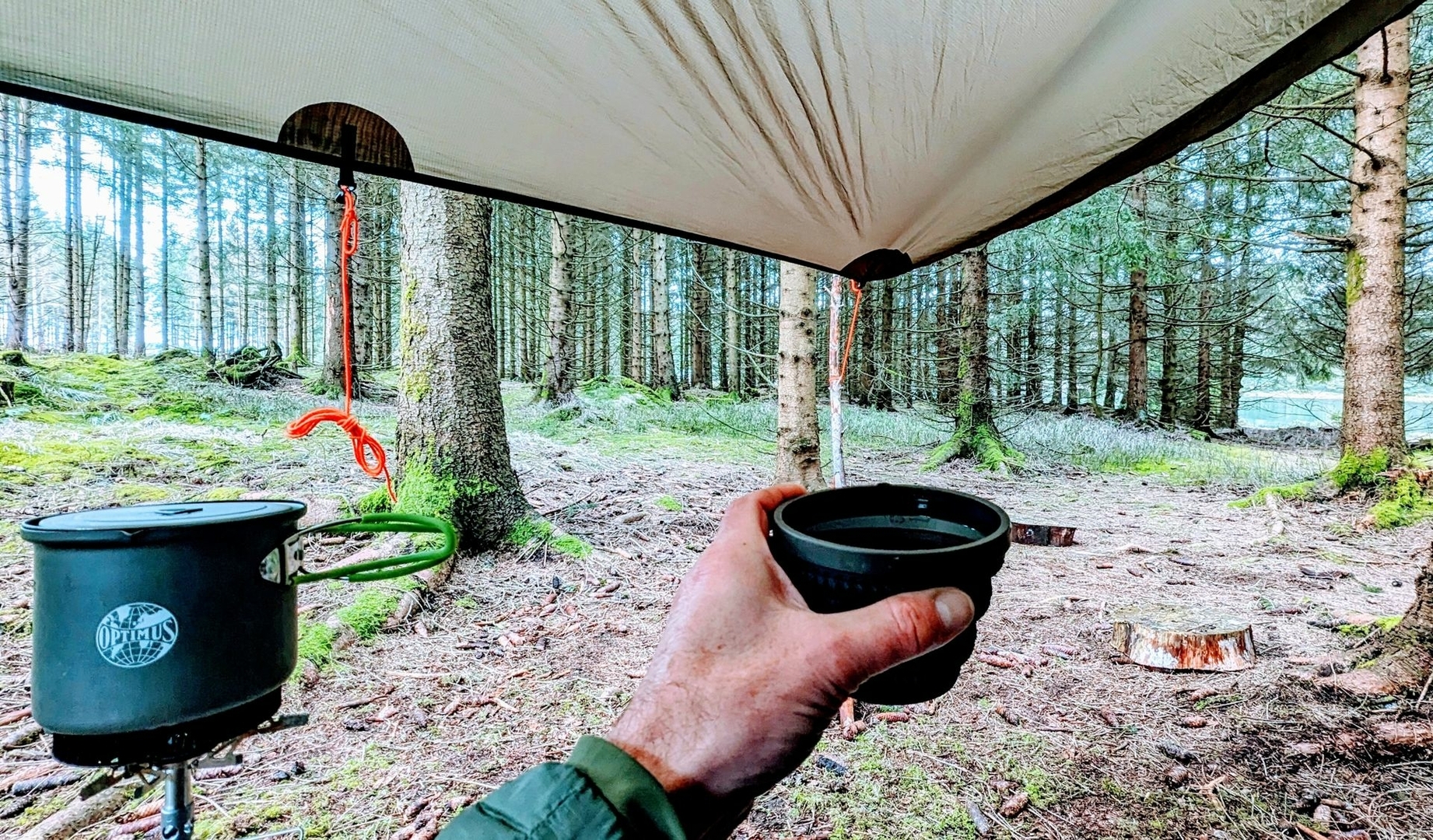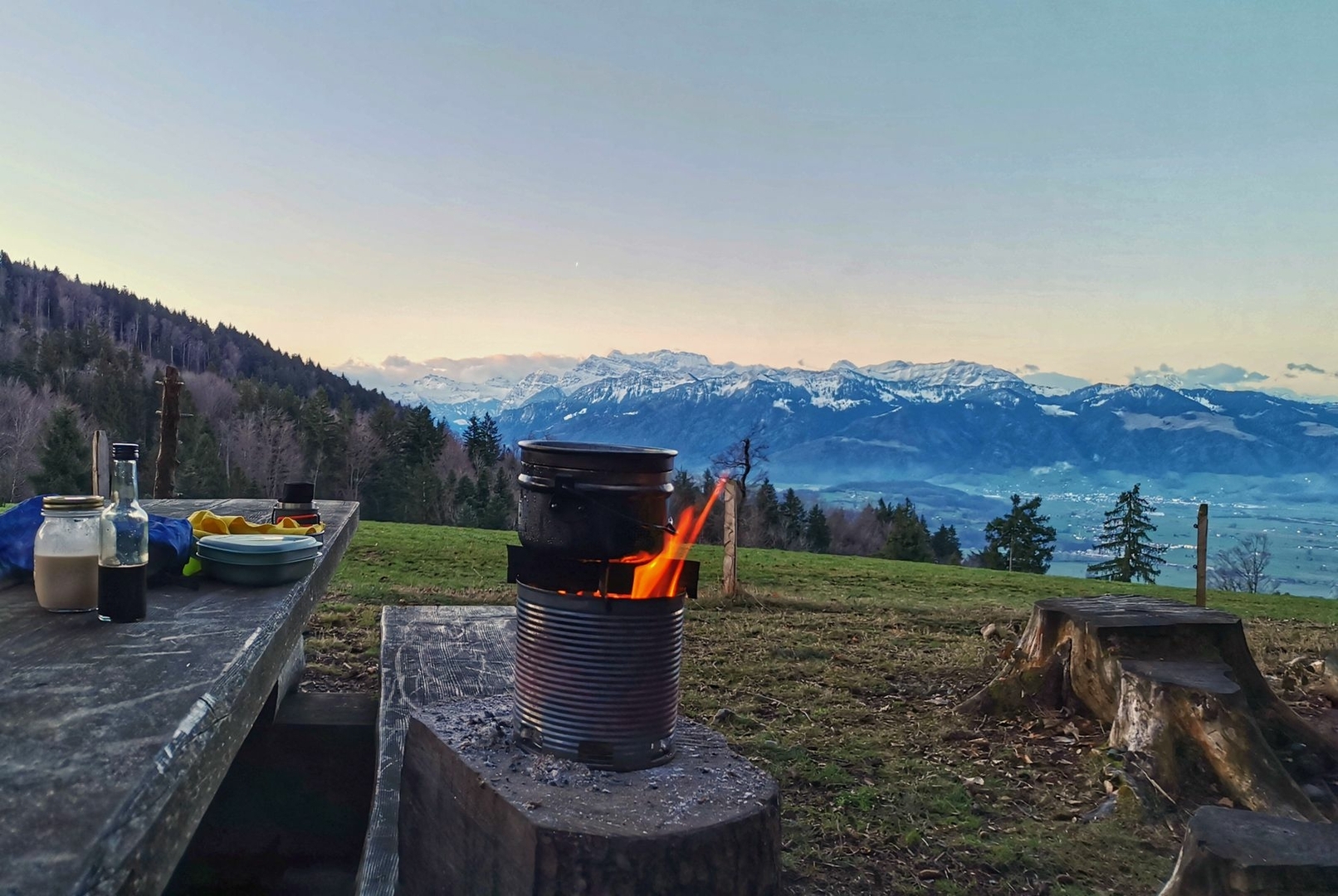 Heißes Wasser fürs Abendessen und die Wärmeflasche hat der Bushbuddy geliefert - zum Anzünden habe ich die Prozedur angesichts der auch an den Tannen reichlich feuchten Äste abgekürzt und kurzerhand mit einem Würfel Esbit entzündet.