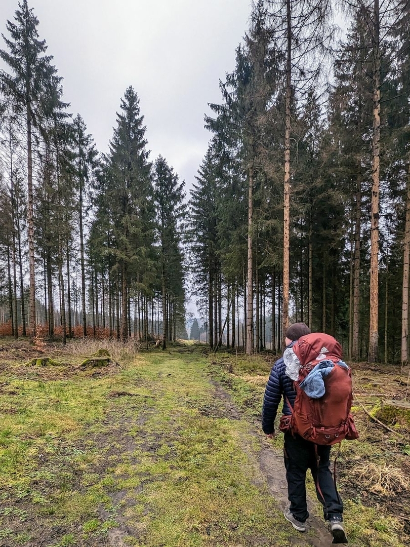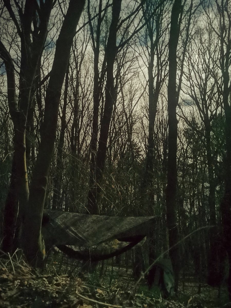 Zunächst mal habe ich aber nach fünf Kilometern dumm aus der Wäsche geschaut, denn geplant hatte ich eigentlich mal wieder eine Nacht in meinem schon mehrfach genutzten "Winterschlafzimmer", eine Minilichtung mitten im Tannengebüsch unweit des Weges und gediegen Abendessen kochen auf dem Grillplatz in der Nähe. Aber nix da, diese Barbaren von Holzfäller haben einfach den einen Hängebaum umgesägt! In der Nähe gab es nix mehr sonst, zu viel Gebüsch zwischen den Bäumen, da hätte ich das Tarp nie aufbauen können, also weiterstiefeln. Kurz überlegt, ob ich zum Sommerhängeplatz weiter oben am Berg sollte, wurde aber bald dunkel und deshalb bin ich kurzerhand ein paar hundert Meter weiter querfeld ein den Berg hoch, da wo ein Sattel zu vermuten war, der weit genug weg vom nächsten Weg lag und damit hoffentlich auch frei von Hochsitzen sein dürfte. Dort wurde ich auch fündig.