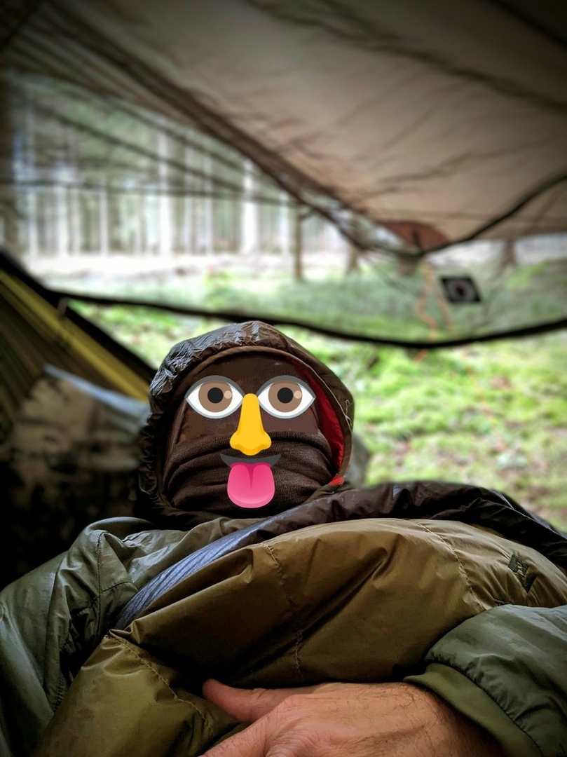 Die Nacht selbst wurde gegen Morgen leider etwas frisch, sicher auch aufgrund der Feuchtigkeit. Zum Glück war ja eh nur ein Overnighter geplant, so dass die Daunentüte nur kurz in den Rucksack musste und jetzt in aller Ruhe abtrocknen kann. Frühstück war aber wieder super gemütlich, trotz der eher niedrigen Temperaturen - Wasser diesmal aus dem Spiritusbrenner im Bushbuddy auf der schwarzen Biene, alles in Reichweite, so dass ich erst nach dem Frühstück aus dem Schlafsack krabbeln musste. Und dank der Faltmatte sitzt es sich ja in der Crosshammock oberbequem. Damit bin ich trotz der kühlen Nacht mit nicht allzu viel Schlaf mit einem innigen Grinsen wieder zu Hause aufgeschlagen, Waldnacht ist Waldnacht, egal, wie.