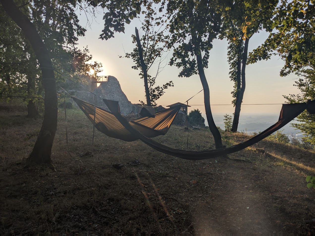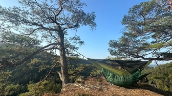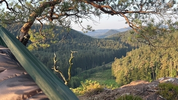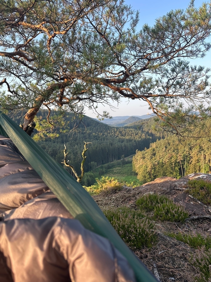 FYI, ich war neulich mit meiner Holden ein paar Tage wandern auf dem Burgensteig Bergstraße, z.B. auf der Burg Tannenberg ließ es sich quasi ohne Verlassen des Weges ganz hervorragend hängen mit grandioser Aussicht in die Rheinebene. Auch später gab es pestkonforme Hängemöglichkeiten, wenn auch Burg Tannenberg das absolute Highlight war.