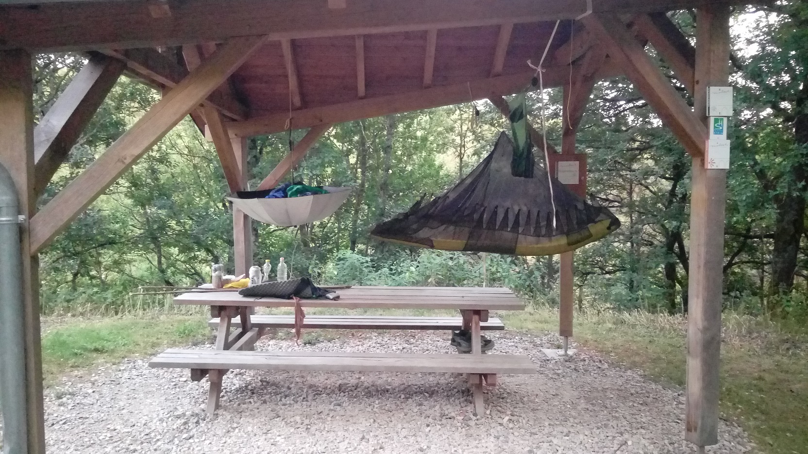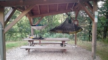 - Die Isomatte wird samt Hängematte vorne nach unten umgeklappt, die Matten sind sozusagen halbiert.