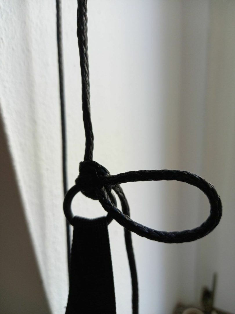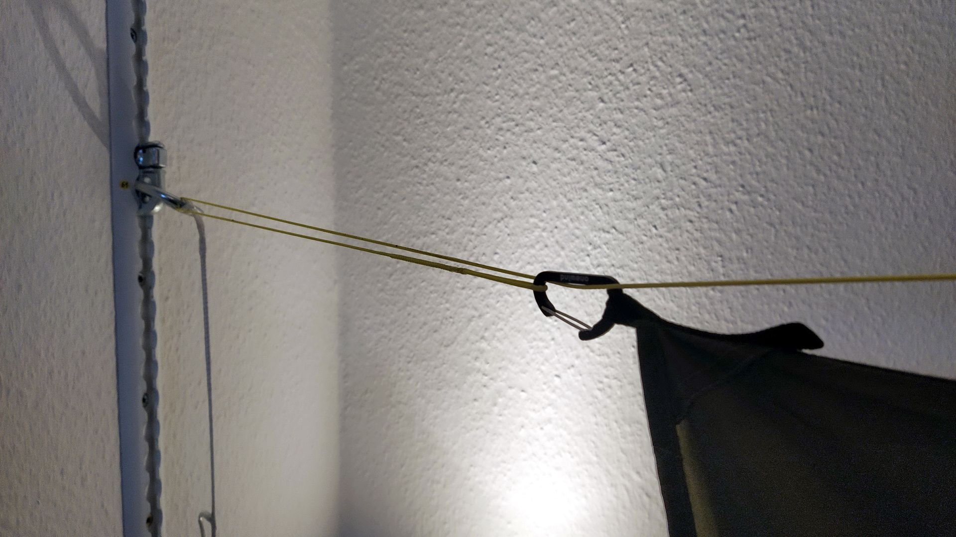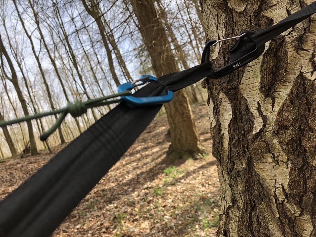ABER: im Wohnzimmer an den Ringen der Airlineschienen lässt sich das Tarp leicht verschieben, aber ob das auch an einer stumpfen Baumrinde funktioniert?