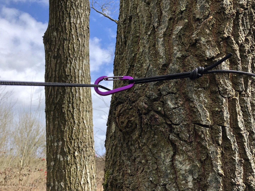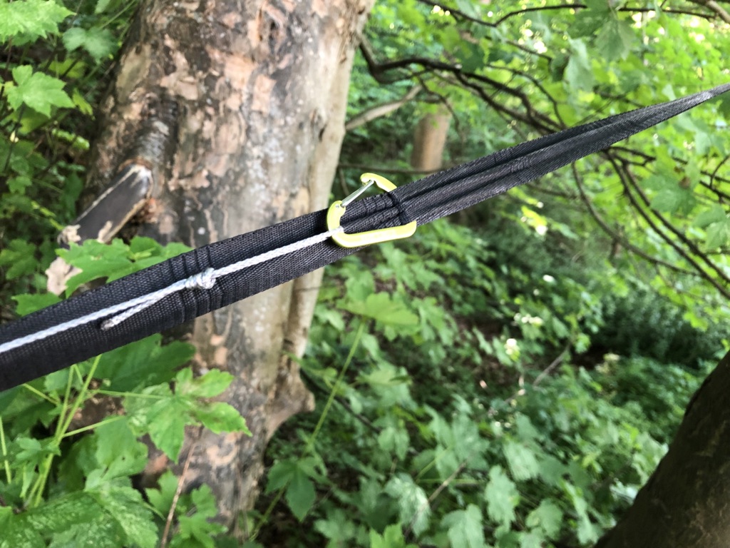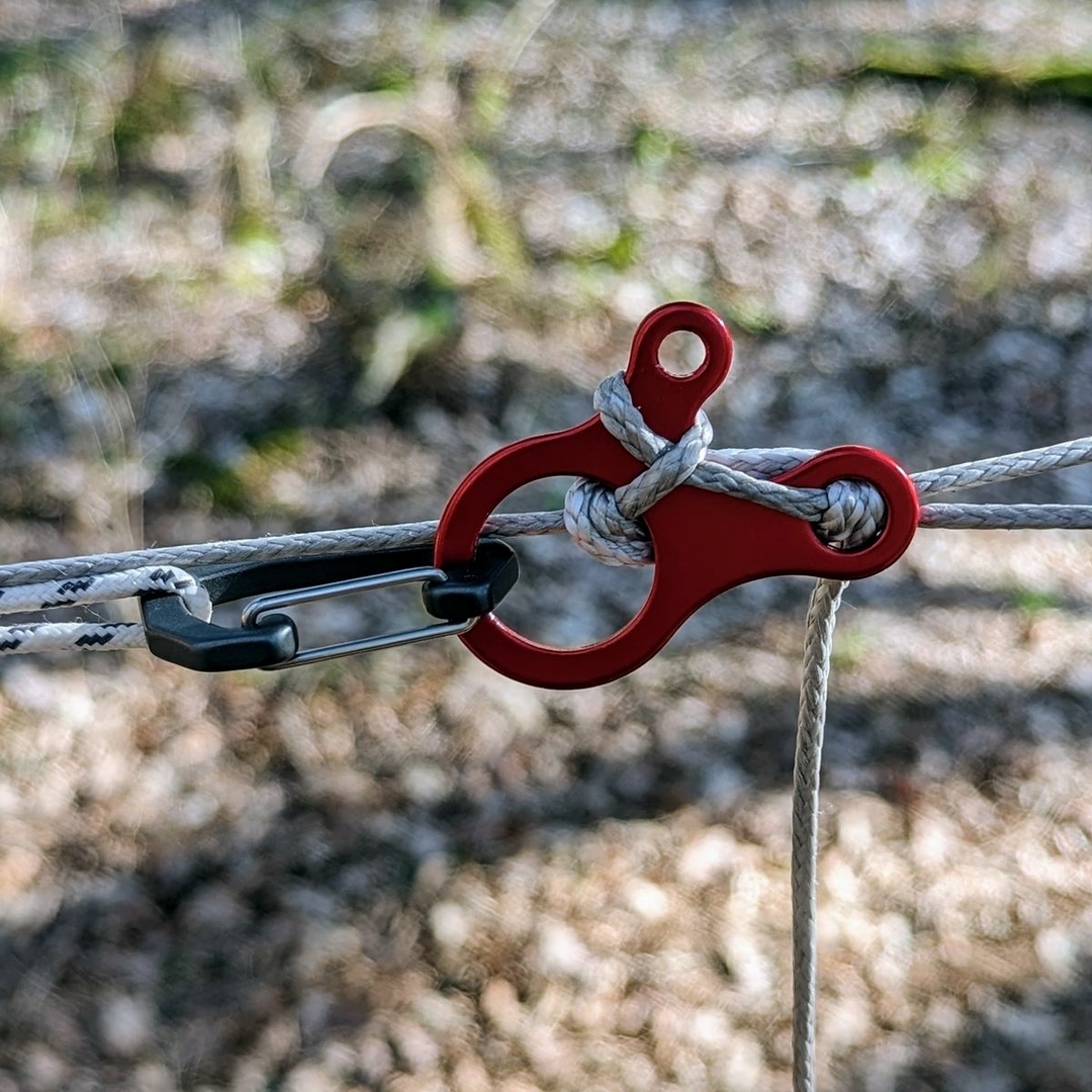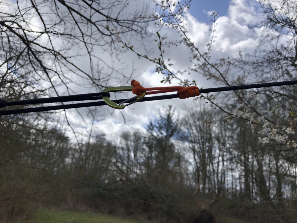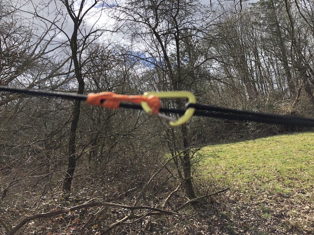 Das Ganze funktioniert wunderbar. Leicht spannen, dann kann man das Tarp verschieben, dann richtig nachspannen und um den Alien wickeln, den man auch beliebig auf der Leine verschieben kann. Man benötigt 2 Karabiner und einen Alien. Wenig Aufwand, wenig Gewicht.