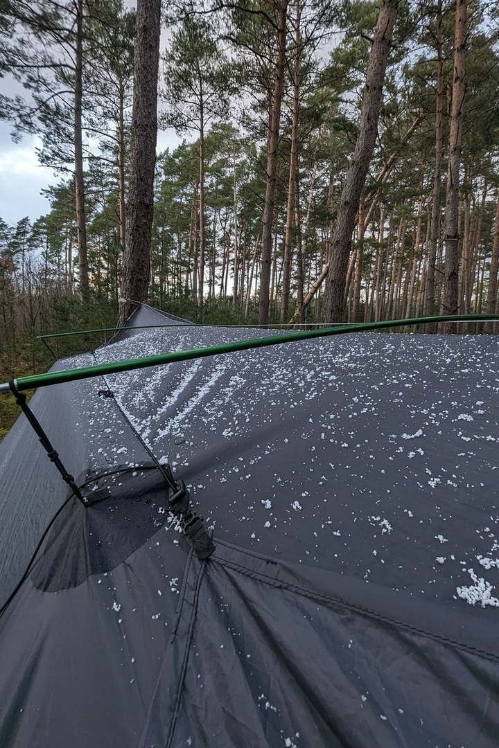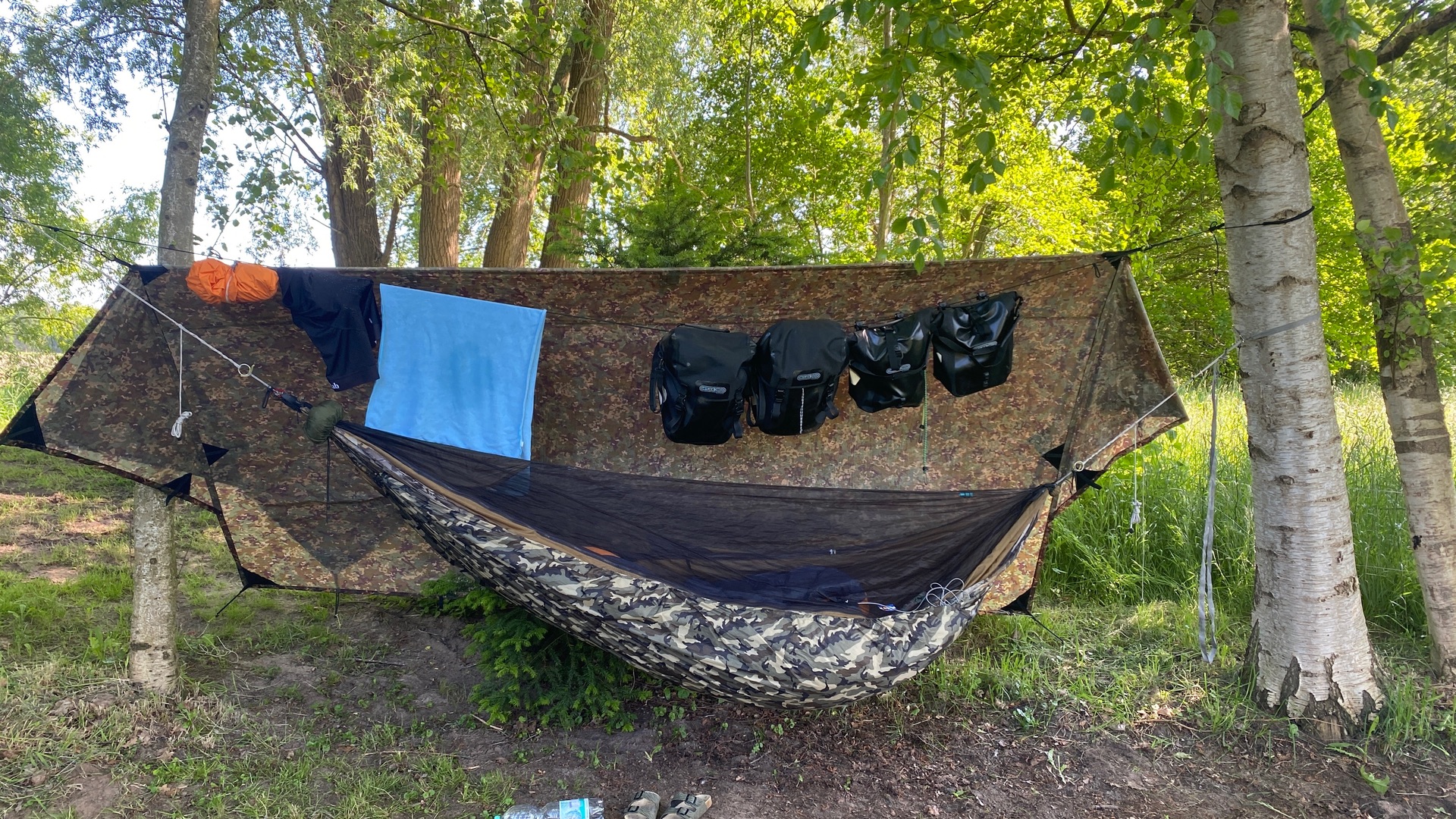 Mir gefällt, dass man das Tarp verschieben und spannen kann, ohne hin und her zu rennen, alles erfolgt vom Baum rechts (s.o.).