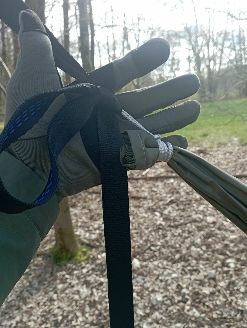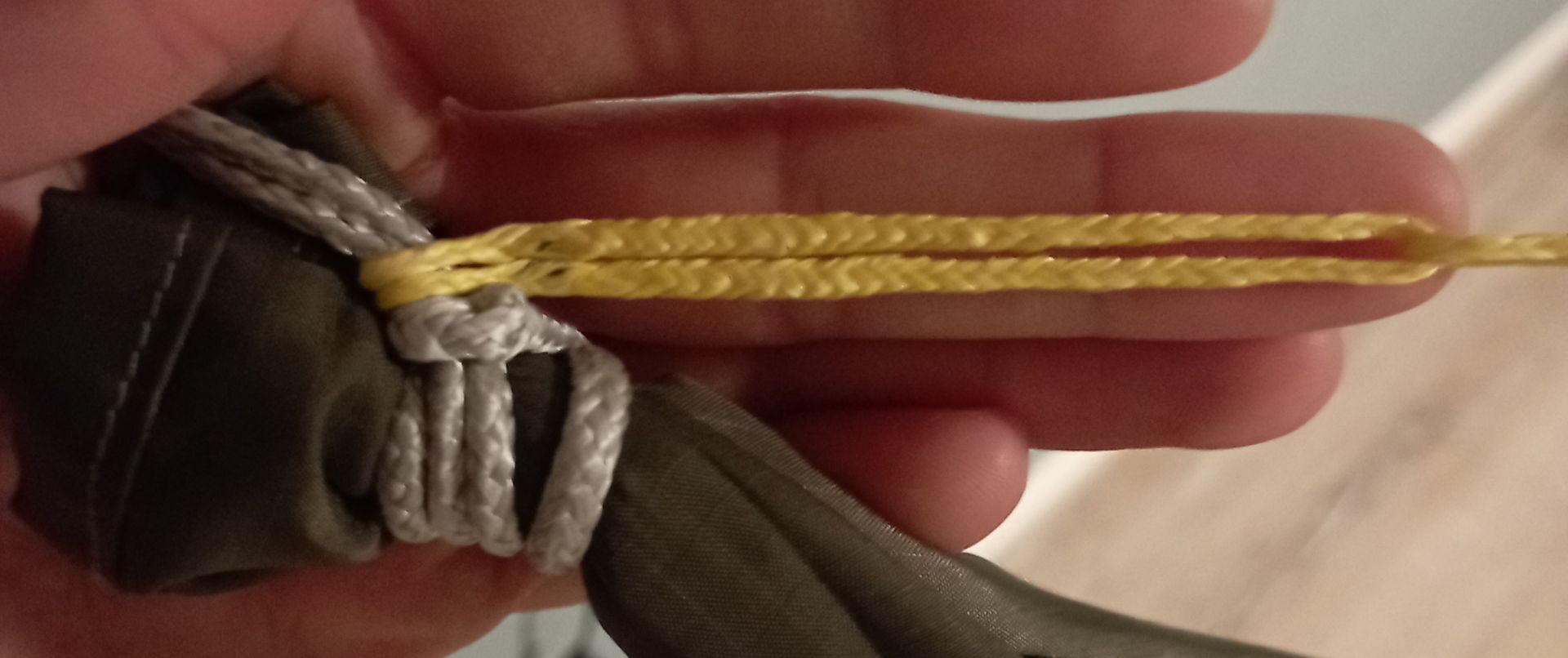 Auf dem Bild sieht man die gewhippten Enden und die zwei Dyneema Loops.